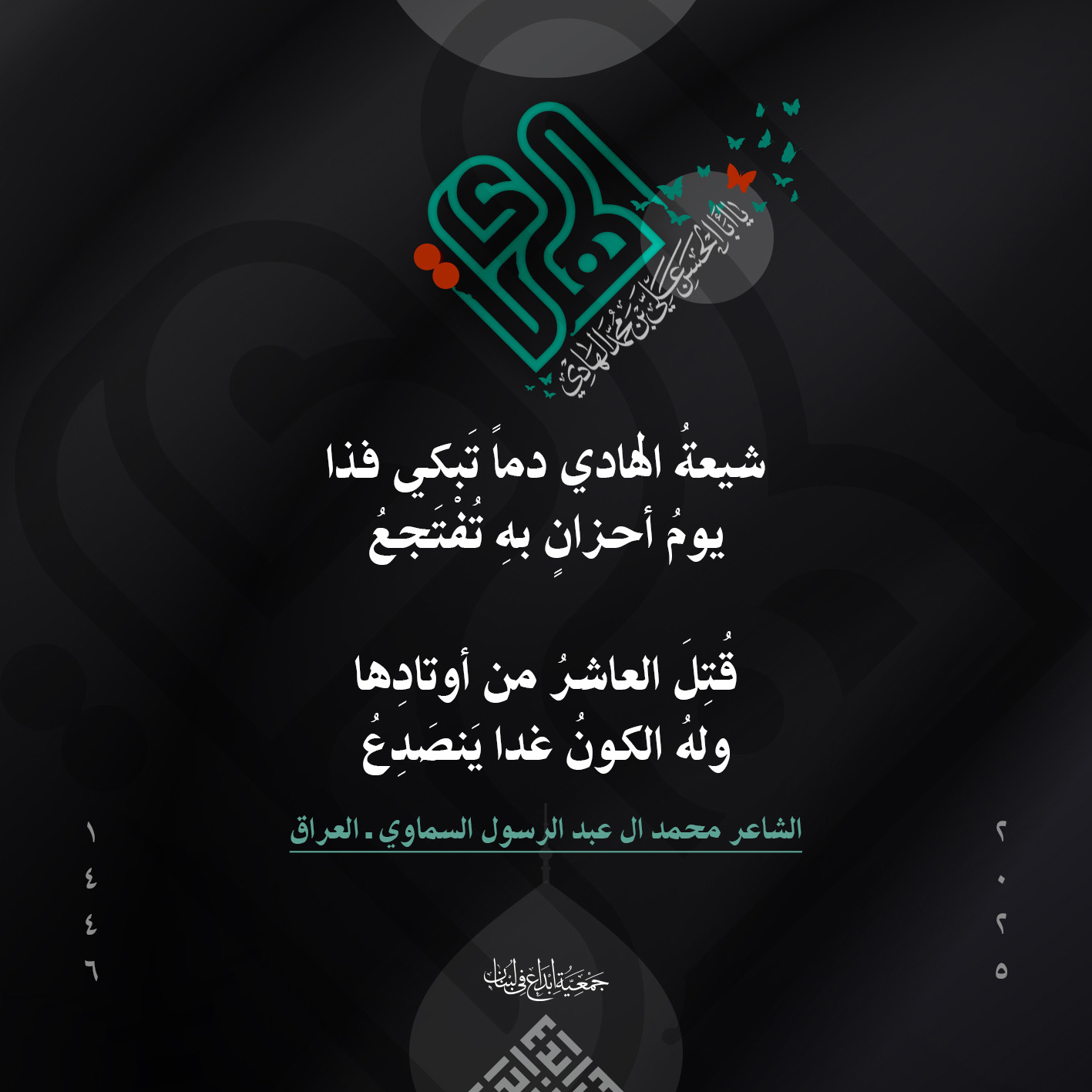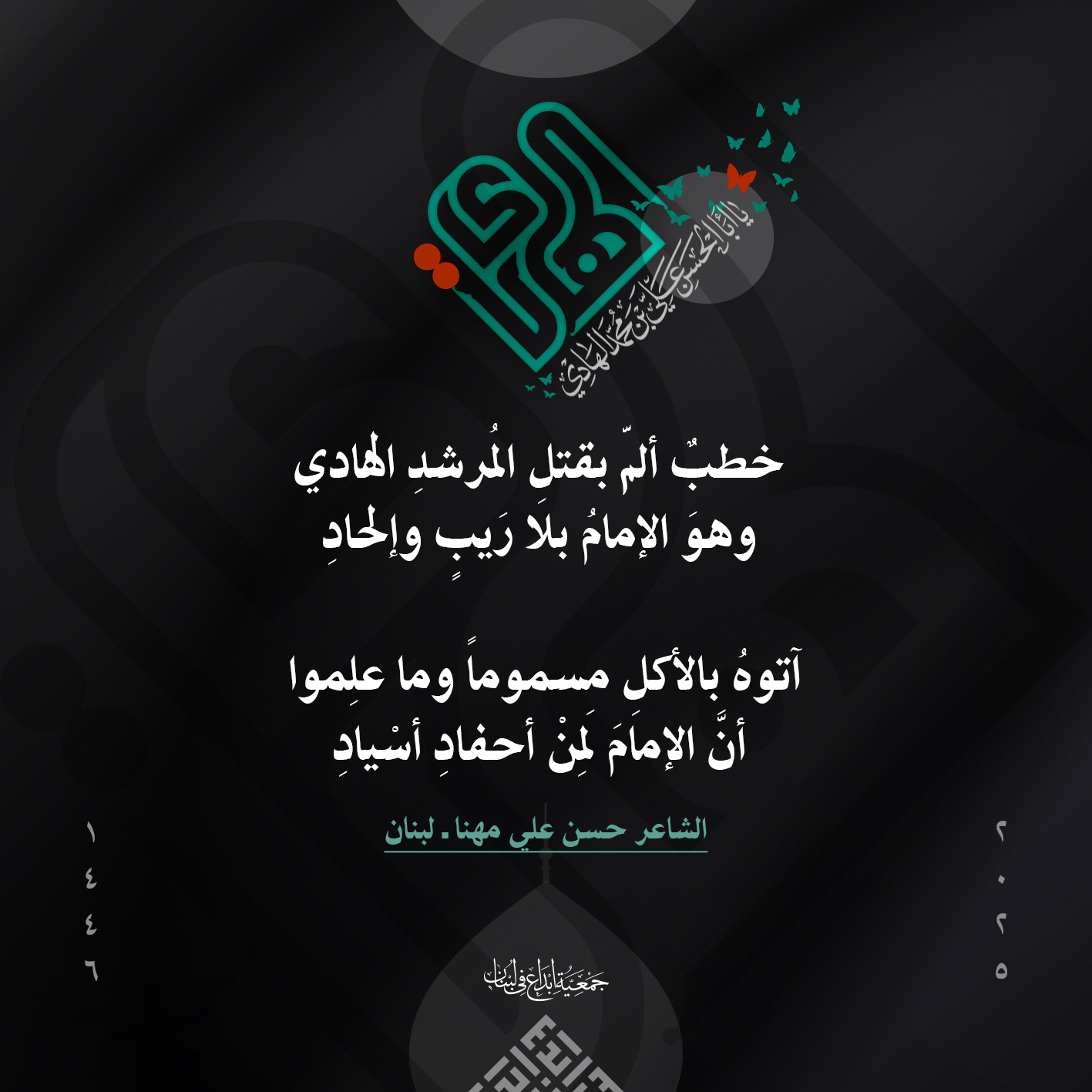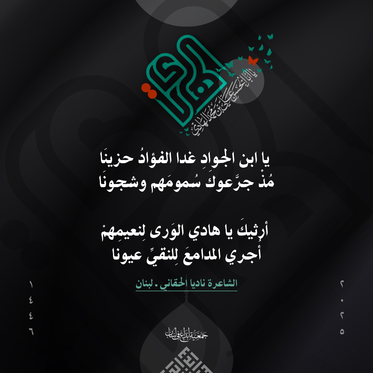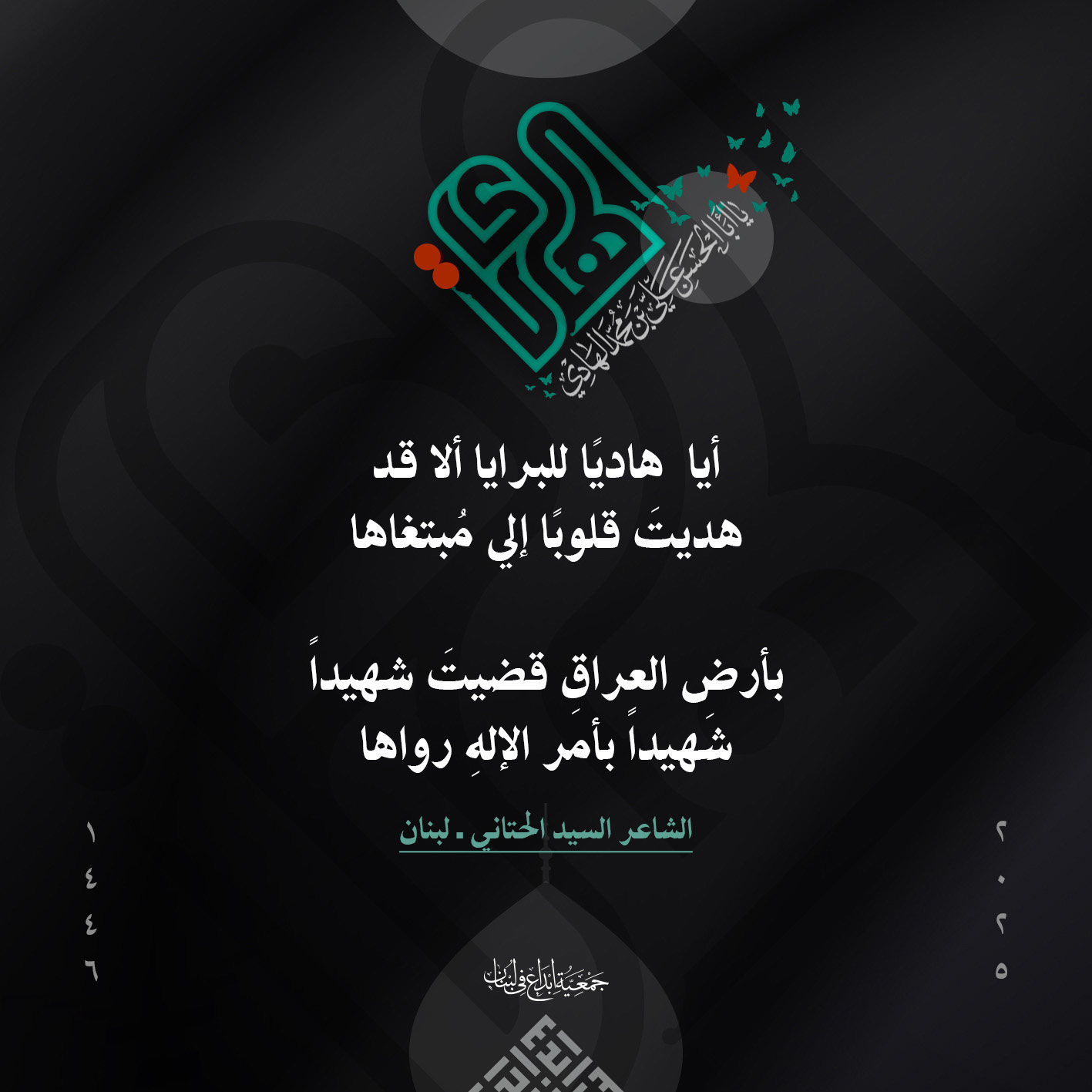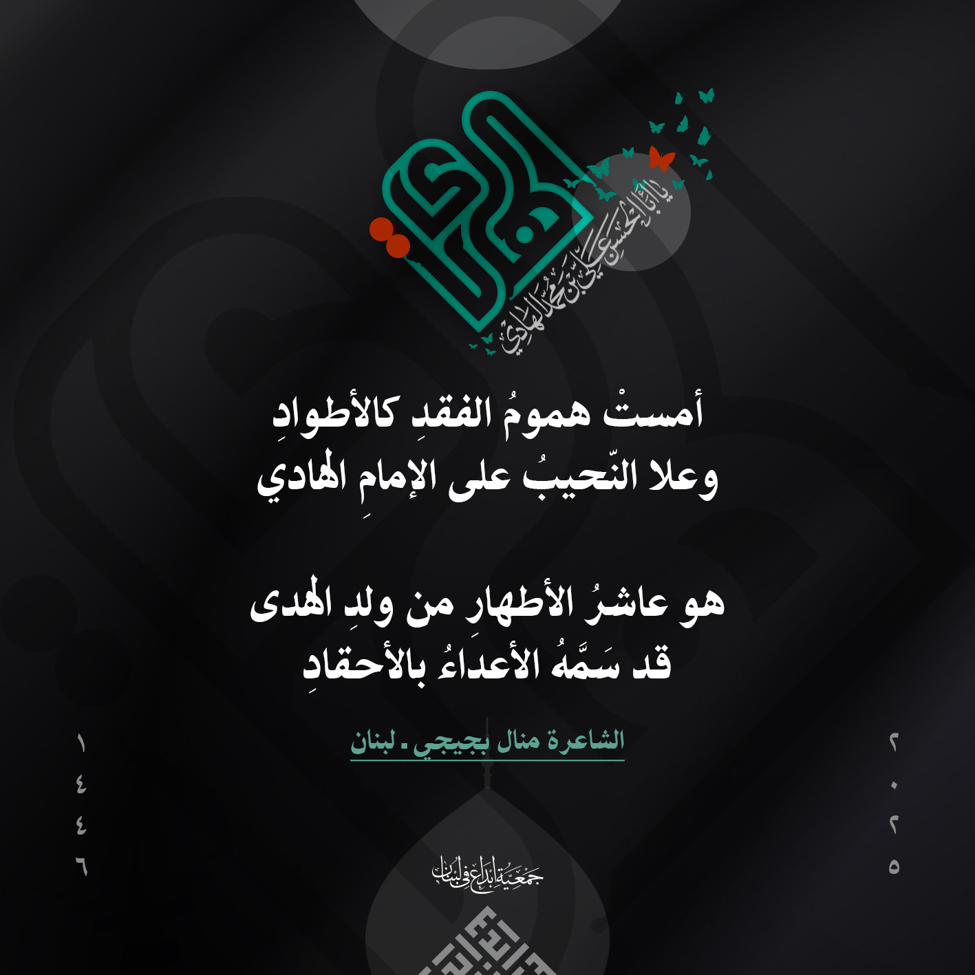 #الهادي حملة #إبداع الشعرية بذكرى استشهاد الإمام علي #الهادي (ع) #رجب_3_1446 المشاركون في الحملة : 1. الشاعر السيد الحتاني ـ لبنان 2. الشاعر الشيخ علي تيسوغي - مالي 3. الشاعر أحمد غالب سرحان ـ لبنان 4. الشاعر أمير موسى السماوي ـ العراق 5. الشاعر حسن علي مهنا ـ لبنان 6. الشاعر داوود ال عبد الرسول السماوي ـ العراق 7. الشاعر علي درويش ـ لبنان 8. الشاعر مثيل جبار الزيدي ـ العراق 9. الشاعر محمد ال عبد الرسول السماوي ـ العراق 10. الشاعر محمد علي محمد مهدي السماوي ـ العراق 11. الشاعر محمود شور ـ لبنان 12. الشاعر معروف فضل الله ـ لبنان 13. الشاعرة زينب الموسوي ـ لبنان 14. الشاعرة سارة اليتامى ـ لبنان 15. الشاعرة سكينة سويدان ـ لبنان 16. الشاعرة عزيزة جميل ـ لبنان 17. الشاعرة غدير نعيم ـ لبنان 18. الشاعرة مريم عصمان ـ لبنان 19. الشاعرة منال بجيجي ـ لبنان 20. الشاعرة ناديا الحقاني ـ لبنان 21. الشاعرة نبال رعد ـ لبنان جمعية #إبداع في #لبنان 3/1/2025