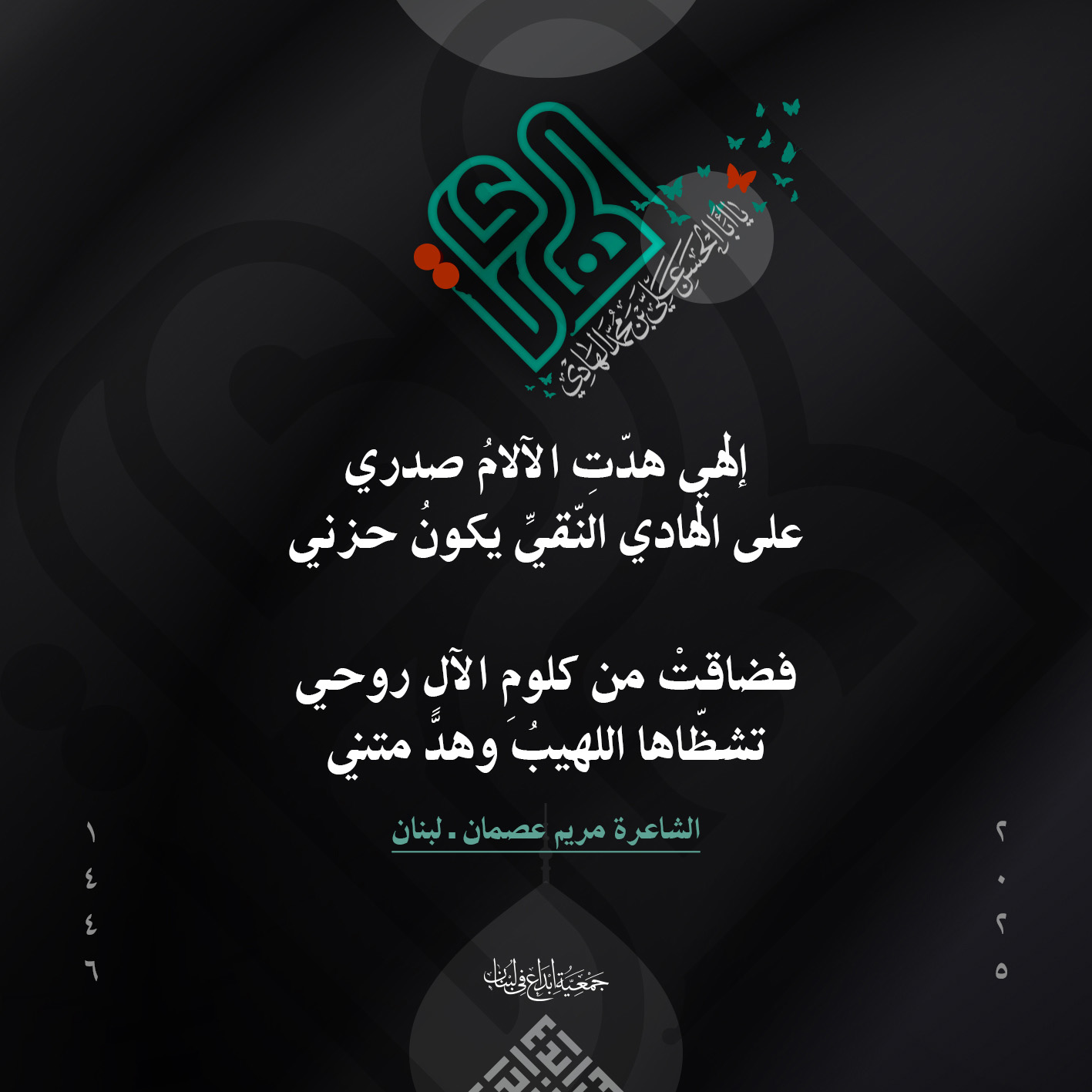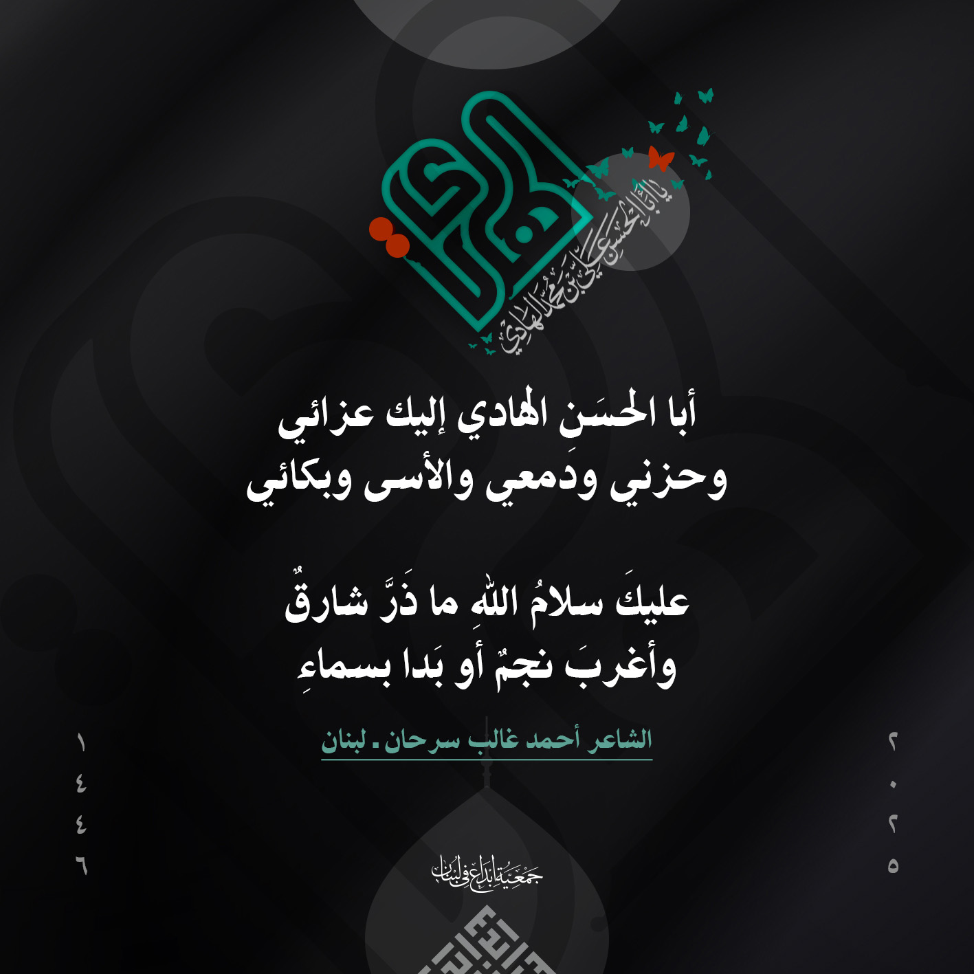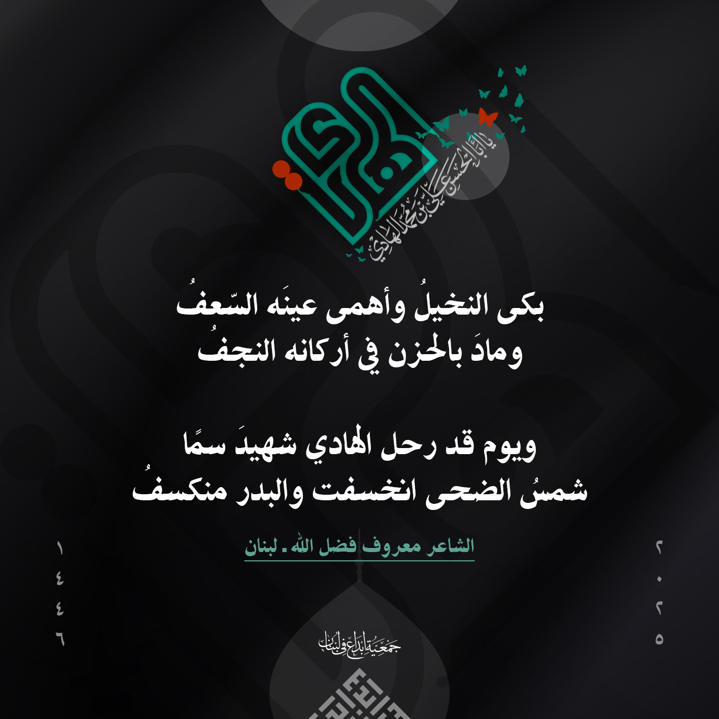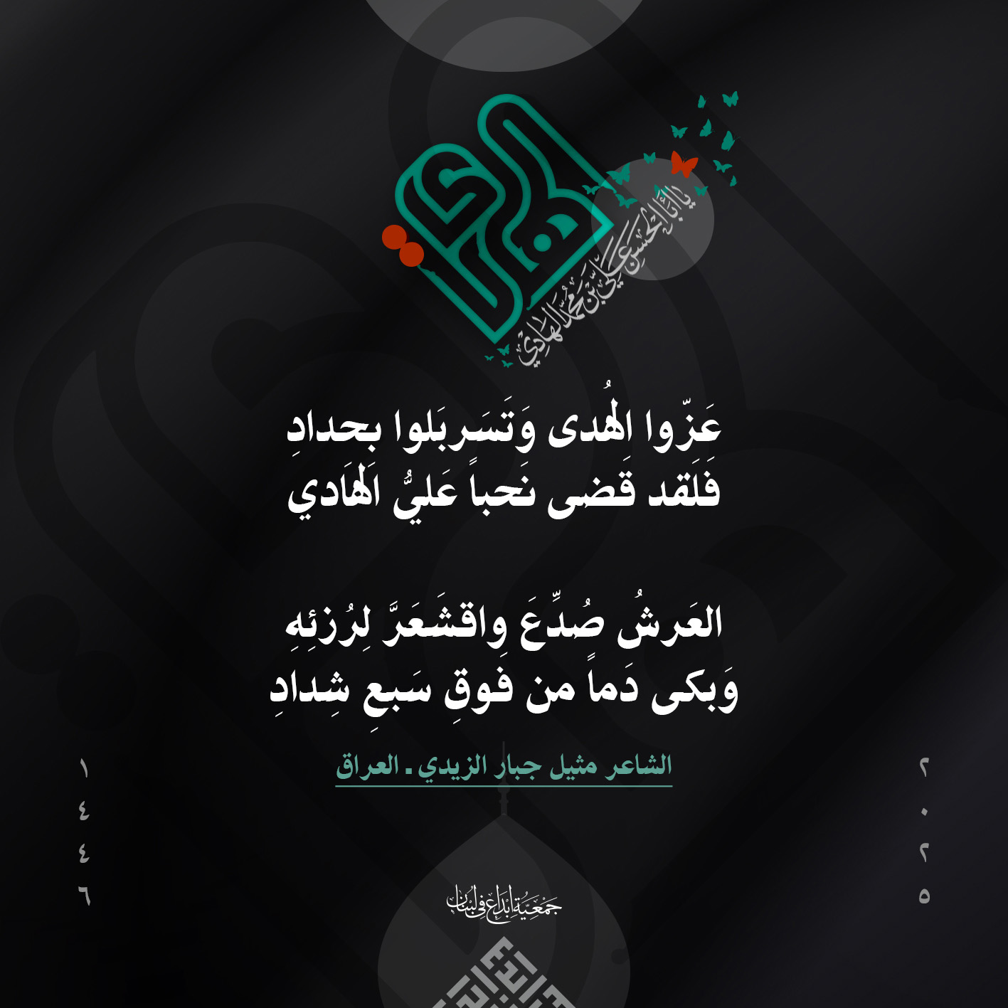 #الهادي حملة #إبداع الشعرية بذكرى استشهاد الإمام علي #الهادي (ع) #رجب_3_1446 المشاركون في الحملة : 1. الشاعر السيد الحتاني ـ لبنان 2. الشاعر الشيخ علي تيسوغي - مالي 3. الشاعر أحمد غالب سرحان ـ لبنان 4. الشاعر أمير موسى السماوي ـ العراق 5. الشاعر حسن علي مهنا ـ لبنان 6. الشاعر داوود ال عبد الرسول السماوي ـ العراق 7. الشاعر علي درويش ـ لبنان 8. الشاعر مثيل جبار الزيدي ـ العراق 9. الشاعر محمد ال عبد الرسول السماوي ـ العراق 10. الشاعر محمد علي محمد مهدي السماوي ـ العراق 11. الشاعر محمود شور ـ لبنان 12. الشاعر معروف فضل الله ـ لبنان 13. الشاعرة زينب الموسوي ـ لبنان 14. الشاعرة سارة اليتامى ـ لبنان 15. الشاعرة سكينة سويدان ـ لبنان 16. الشاعرة عزيزة جميل ـ لبنان 17. الشاعرة غدير نعيم ـ لبنان 18. الشاعرة مريم عصمان ـ لبنان 19. الشاعرة منال بجيجي ـ لبنان 20. الشاعرة ناديا الحقاني ـ لبنان 21. الشاعرة نبال رعد ـ لبنان جمعية #إبداع في #لبنان 3/1/2025