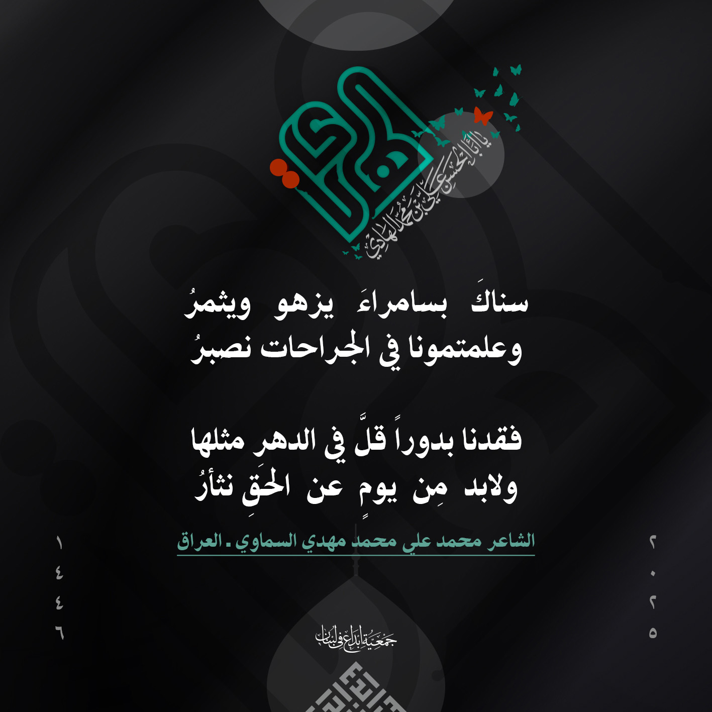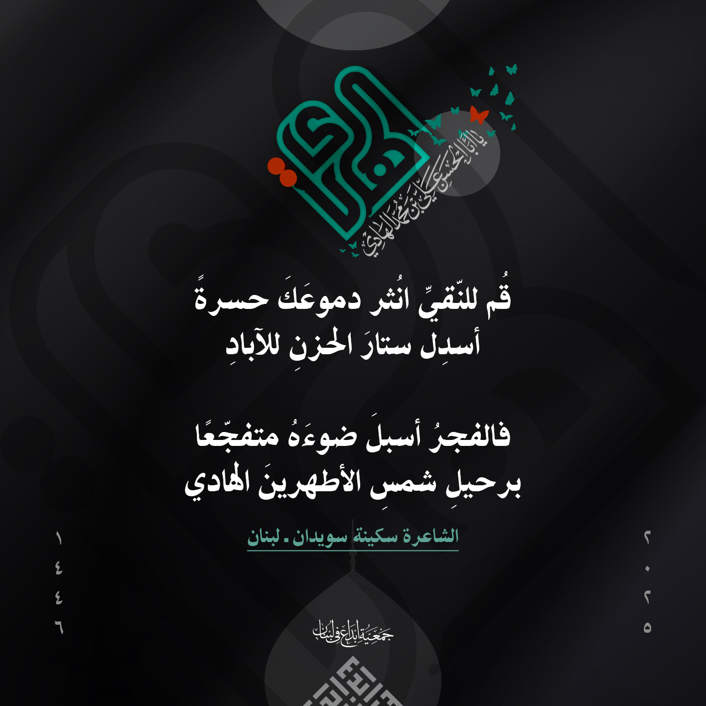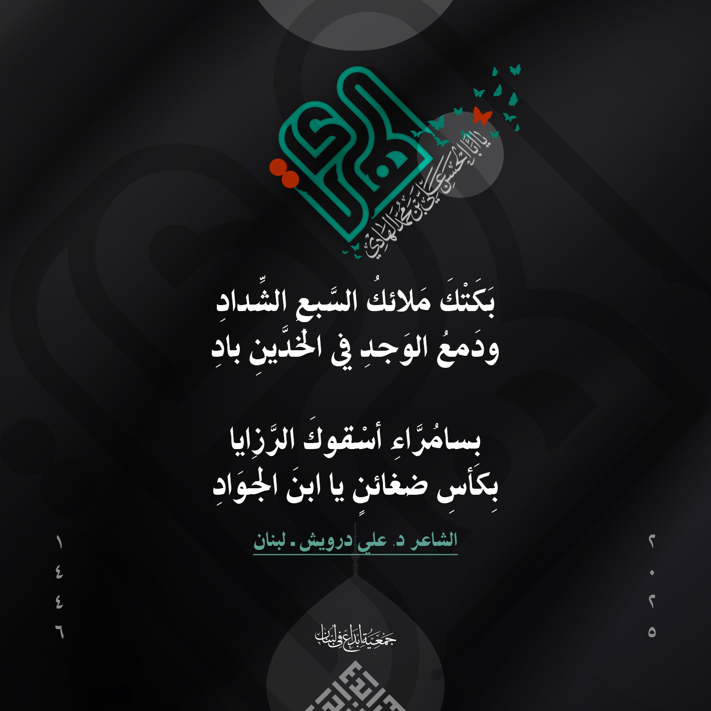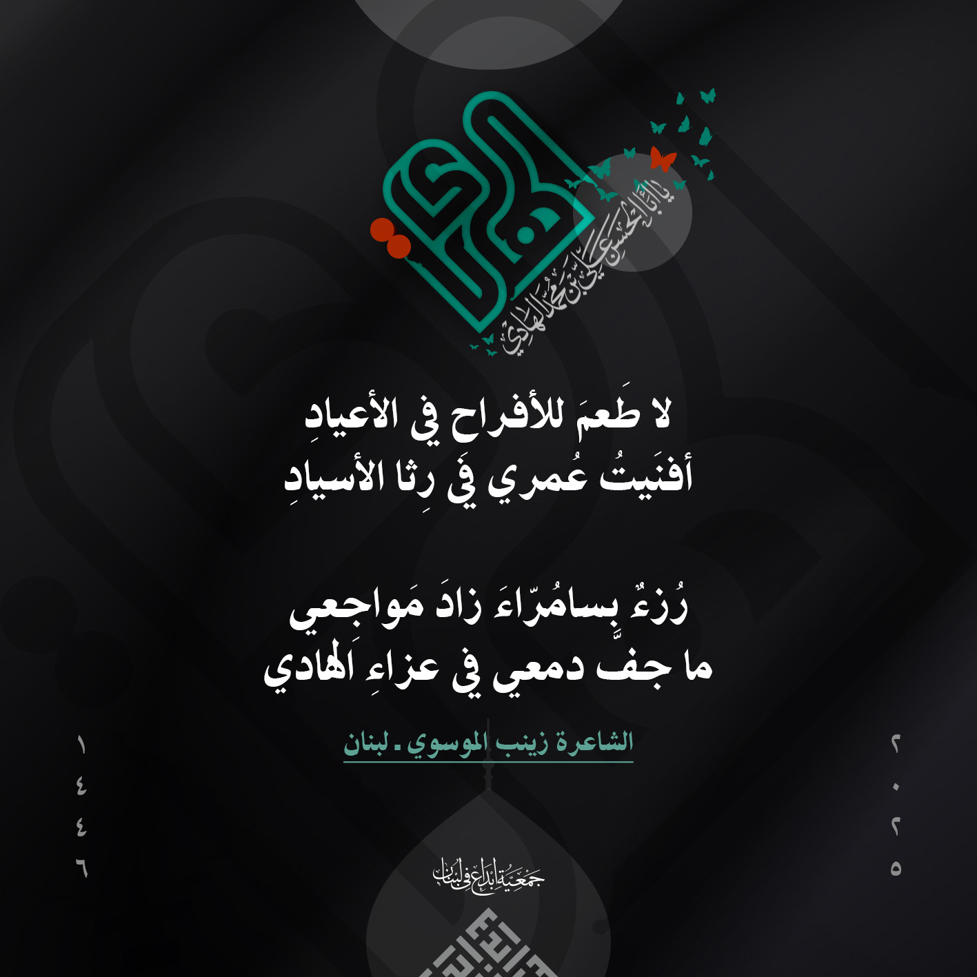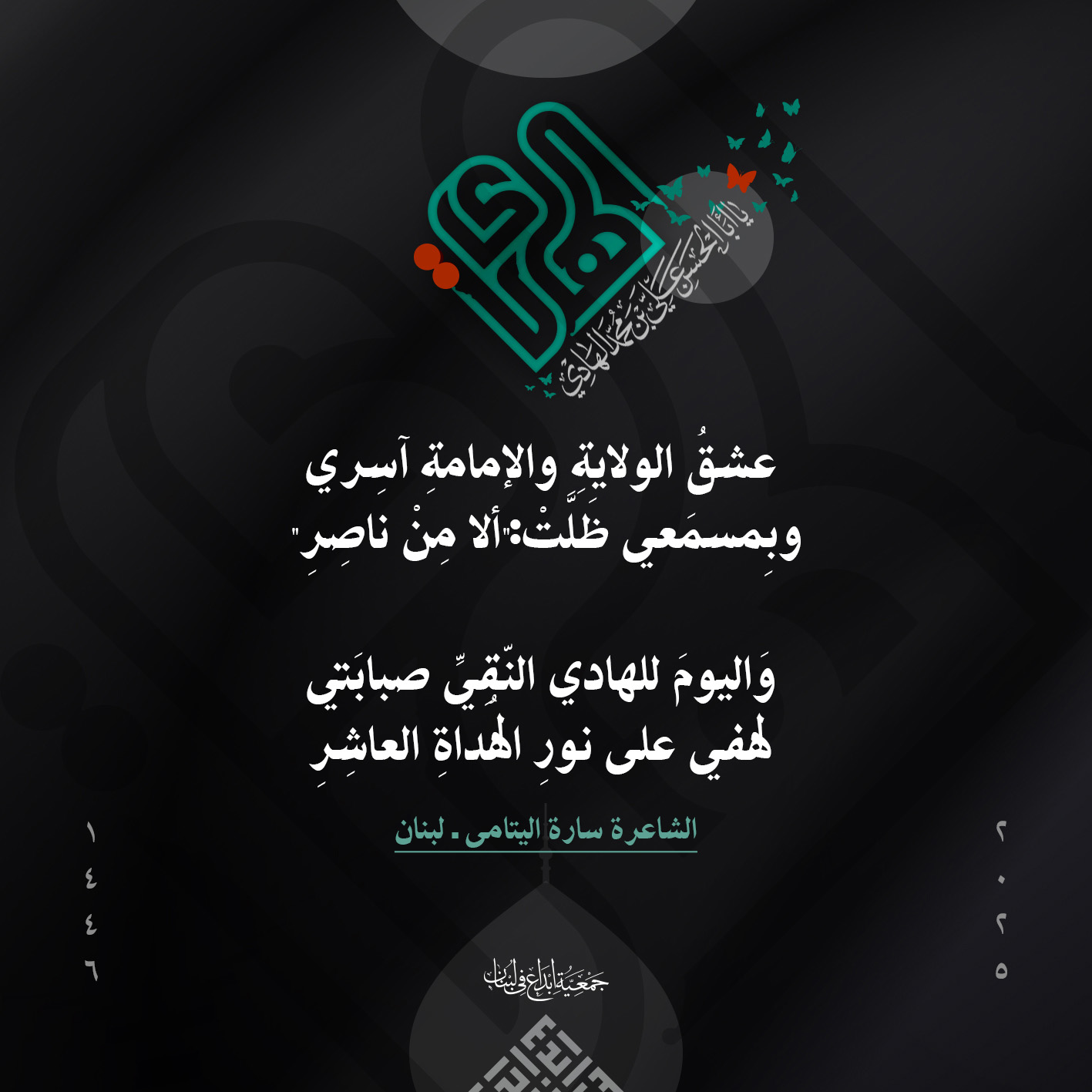 #الهادي حملة #إبداع الشعرية بذكرى استشهاد الإمام علي #الهادي (ع) #رجب_3_1446 المشاركون في الحملة : 1. الشاعر السيد الحتاني ـ لبنان 2. الشاعر الشيخ علي تيسوغي - مالي 3. الشاعر أحمد غالب سرحان ـ لبنان 4. الشاعر أمير موسى السماوي ـ العراق 5. الشاعر حسن علي مهنا ـ لبنان 6. الشاعر داوود ال عبد الرسول السماوي ـ العراق 7. الشاعر علي درويش ـ لبنان 8. الشاعر مثيل جبار الزيدي ـ العراق 9. الشاعر محمد ال عبد الرسول السماوي ـ العراق 10. الشاعر محمد علي محمد مهدي السماوي ـ العراق 11. الشاعر محمود شور ـ لبنان 12. الشاعر معروف فضل الله ـ لبنان 13. الشاعرة زينب الموسوي ـ لبنان 14. الشاعرة سارة اليتامى ـ لبنان 15. الشاعرة سكينة سويدان ـ لبنان 16. الشاعرة عزيزة جميل ـ لبنان 17. الشاعرة غدير نعيم ـ لبنان 18. الشاعرة مريم عصمان ـ لبنان 19. الشاعرة منال بجيجي ـ لبنان 20. الشاعرة ناديا الحقاني ـ لبنان 21. الشاعرة نبال رعد ـ لبنان جمعية #إبداع في #لبنان 3/1/2025