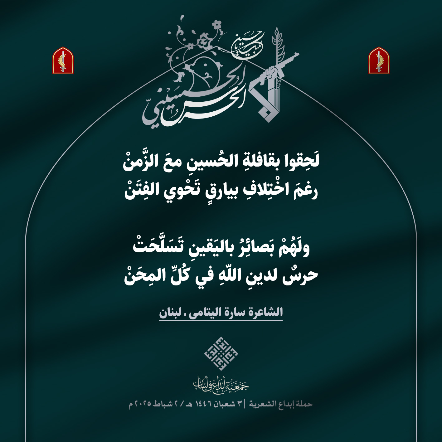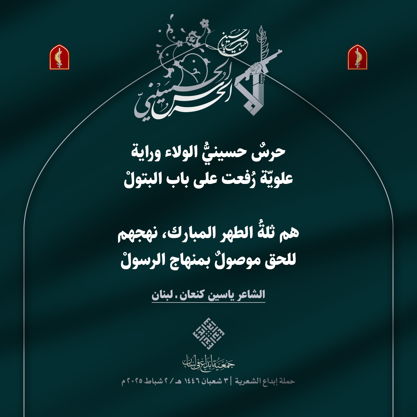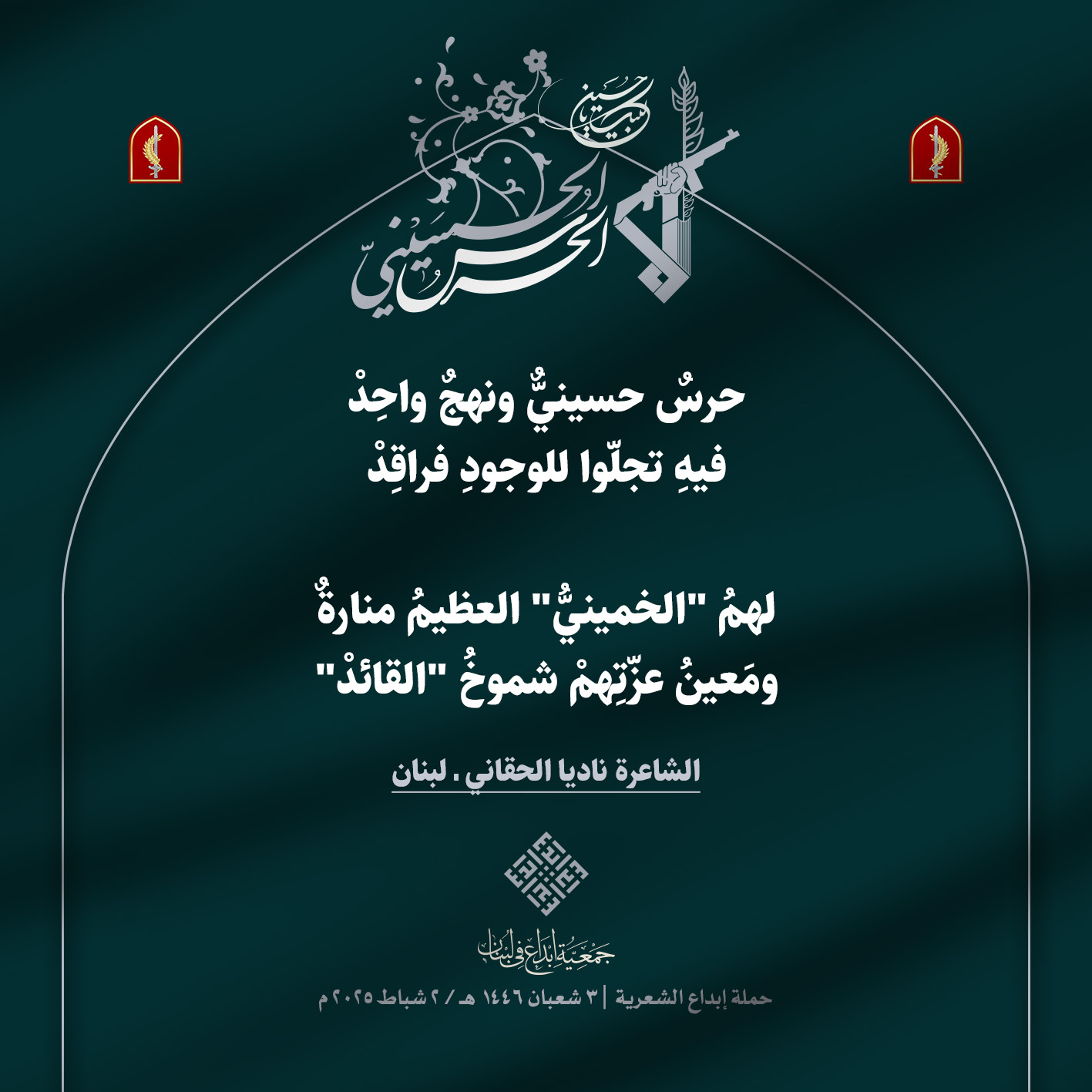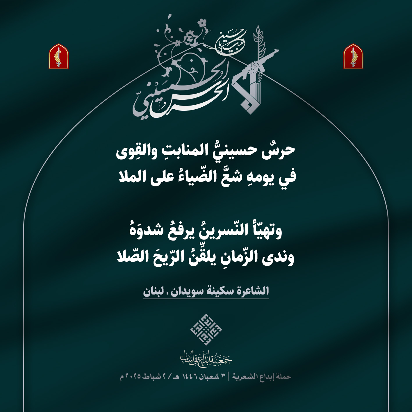 #الحرس_الحسيني حملة #إبداع الشعرية #يوم_الحرس #شعبان_3_1446 جمعية #إبداع في لبنان المشاركون في الحملة : 1. الشاعر السيد الحتاني ـ لبنان 2. الشاعر الشيخ سلمان ال عبد الرسول السماوي ـ العراق 3. الشاعر الشيخ علي تيسوغي - مالي 4. الشاعر راضي الفريجي ـ العراق 5. الشاعر محمد ال عبد الرسول السماوي ـ العراق 6. الشاعر محمود شور ـ لبنان 7. الشاعر ياسين كنعان ـ لبنان 8. الشاعرة زينب الموسوي ـ لبنان 9. الشاعرة سارة اليتامى ـ لبنان 10. الشاعرة سكينة سويدان ـ لبنان 11. الشاعرة ناديا الحقاني ـ لبنان 1/2/2025