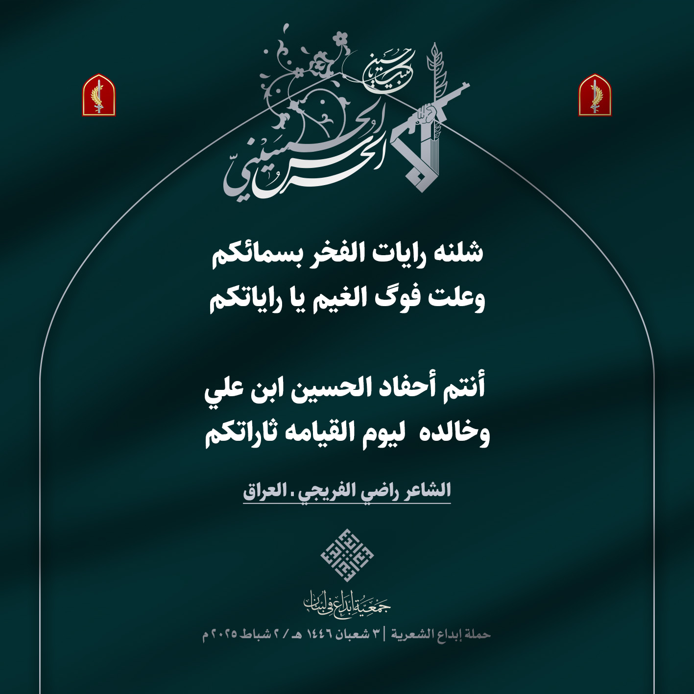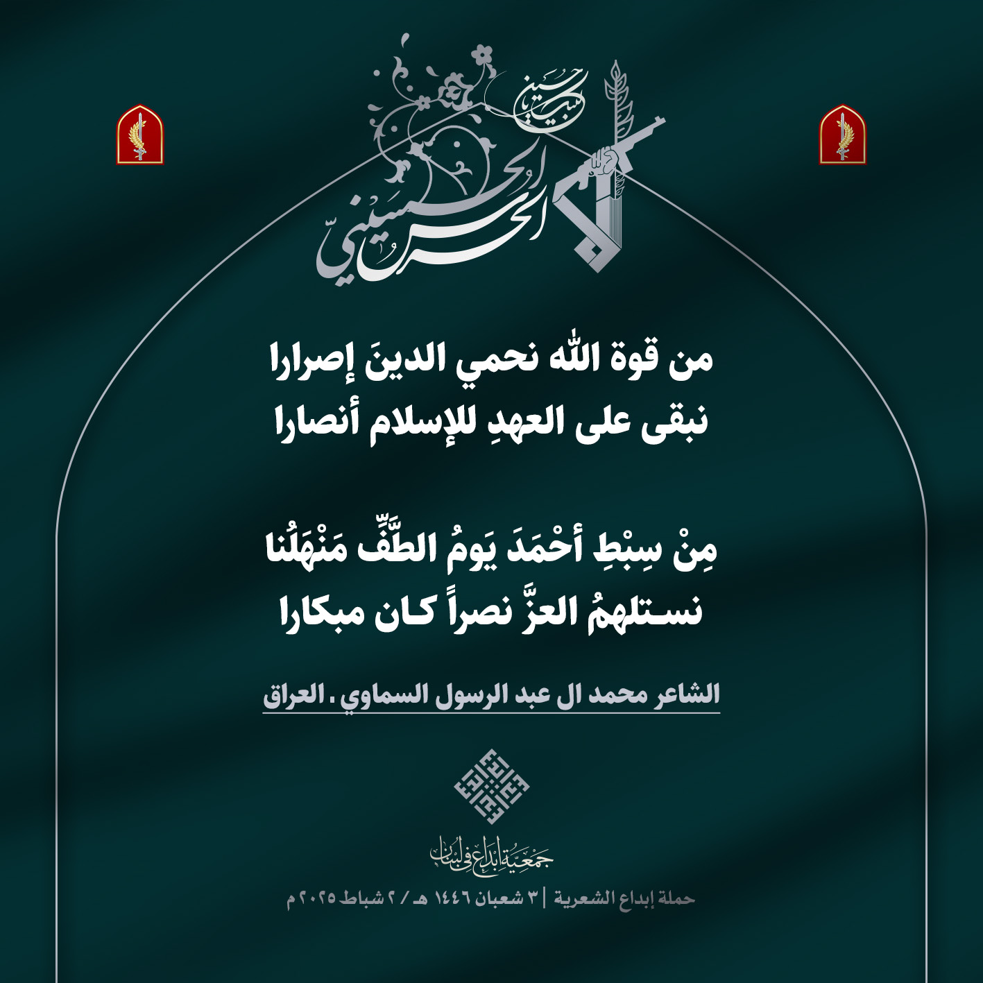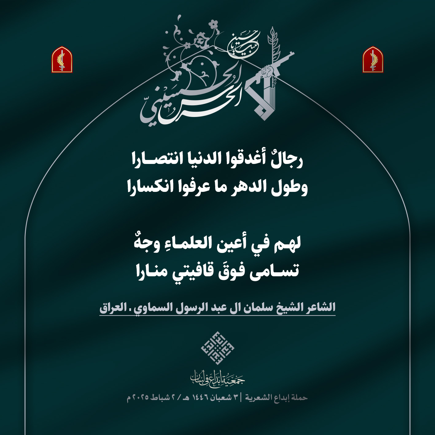 #الحرس_الحسيني حملة #إبداع الشعرية #يوم_الحرس #شعبان_3_1446 جمعية #إبداع في لبنان المشاركون في الحملة : 1. الشاعر السيد الحتاني ـ لبنان 2. الشاعر الشيخ سلمان ال عبد الرسول السماوي ـ العراق 3. الشاعر الشيخ علي تيسوغي - مالي 4. الشاعر راضي الفريجي ـ العراق 5. الشاعر محمد ال عبد الرسول السماوي ـ العراق 6. الشاعر محمود شور ـ لبنان 7. الشاعر ياسين كنعان ـ لبنان 8. الشاعرة زينب الموسوي ـ لبنان 9. الشاعرة سارة اليتامى ـ لبنان 10. الشاعرة سكينة سويدان ـ لبنان 11. الشاعرة ناديا الحقاني ـ لبنان 1/2/2025