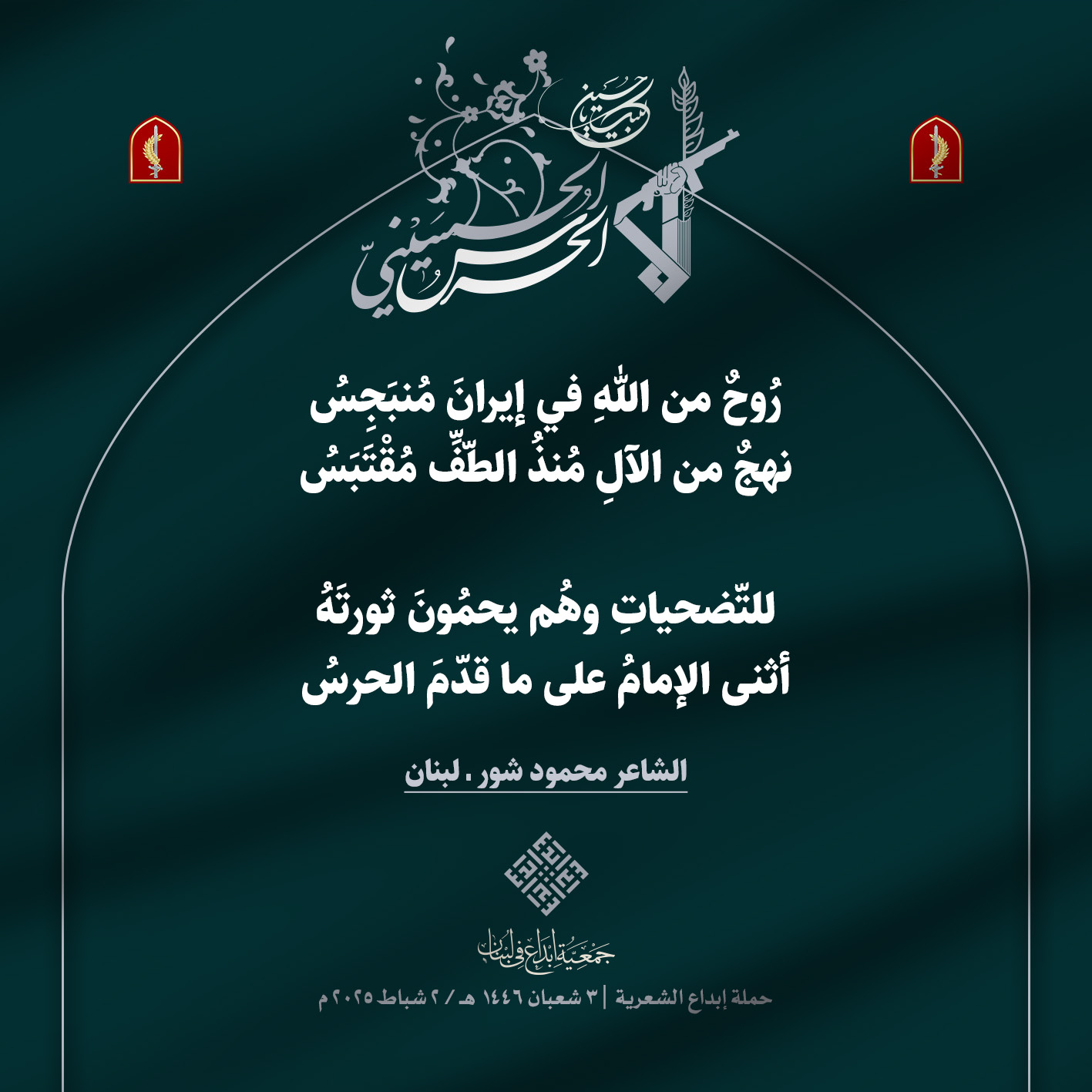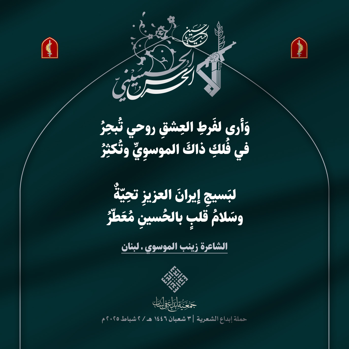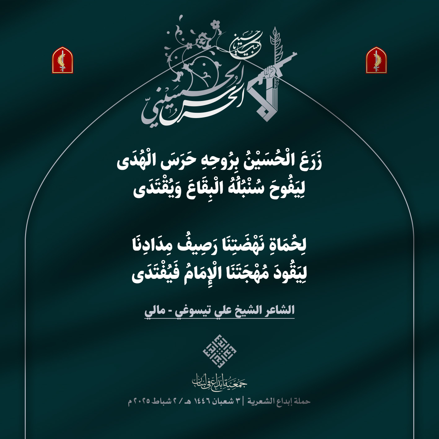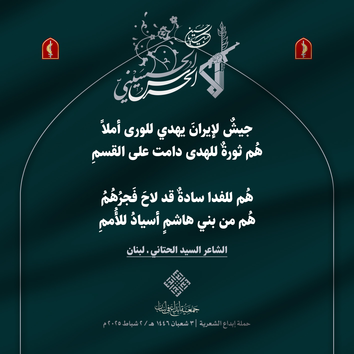 #الحرس_الحسيني حملة #إبداع الشعرية #يوم_الحرس #شعبان_3_1446 جمعية #إبداع في لبنان المشاركون في الحملة : 1. الشاعر السيد الحتاني ـ لبنان 2. الشاعر الشيخ سلمان ال عبد الرسول السماوي ـ العراق 3. الشاعر الشيخ علي تيسوغي - مالي 4. الشاعر راضي الفريجي ـ العراق 5. الشاعر محمد ال عبد الرسول السماوي ـ العراق 6. الشاعر محمود شور ـ لبنان 7. الشاعر ياسين كنعان ـ لبنان 8. الشاعرة زينب الموسوي ـ لبنان 9. الشاعرة سارة اليتامى ـ لبنان 10. الشاعرة سكينة سويدان ـ لبنان 11. الشاعرة ناديا الحقاني ـ لبنان 1/2/2025