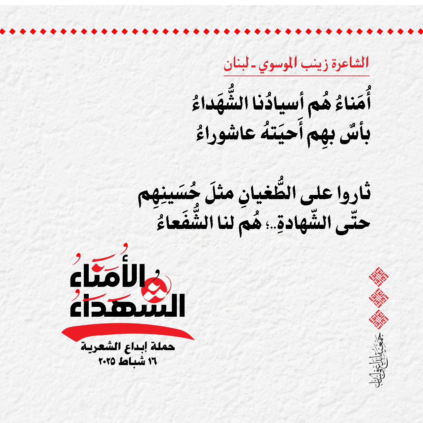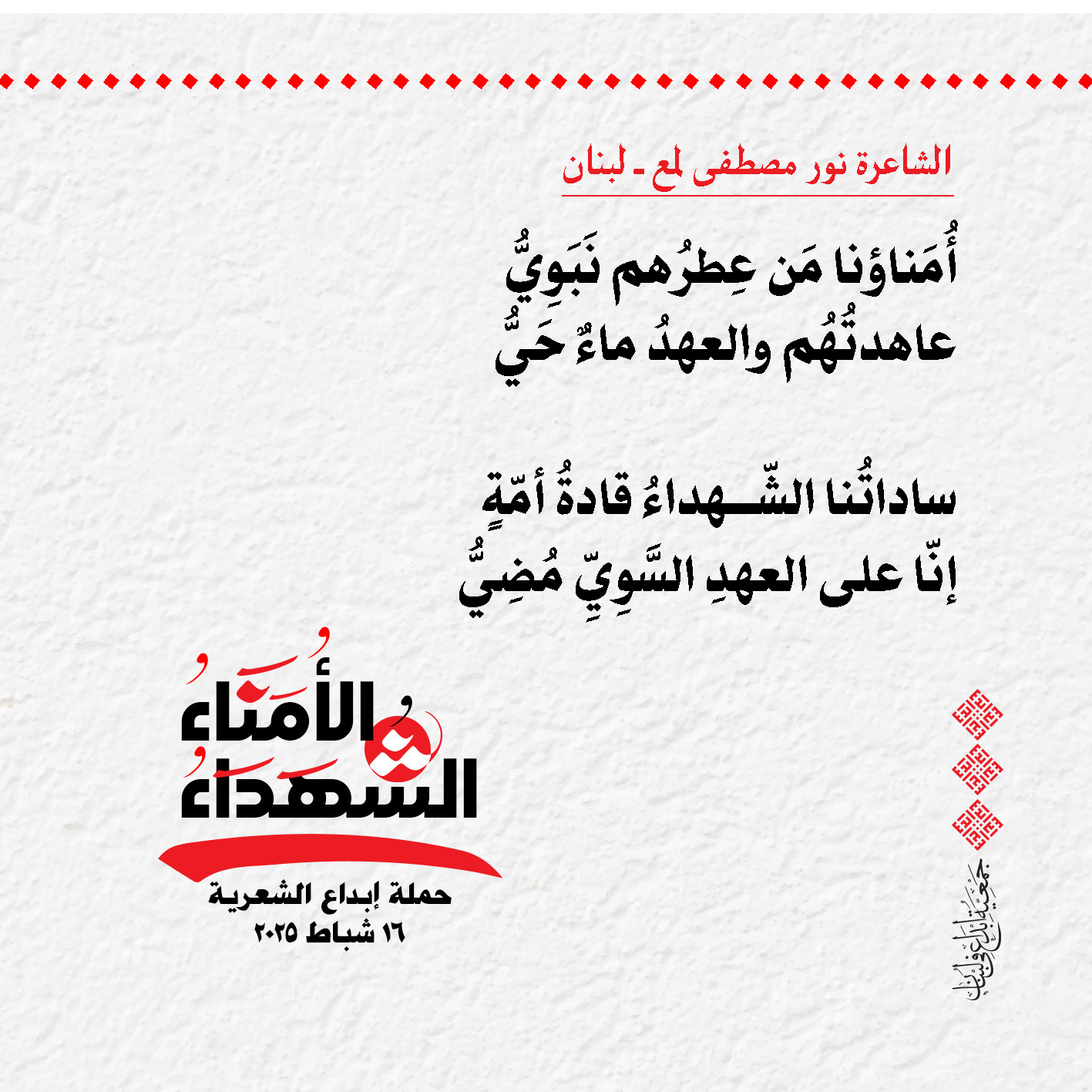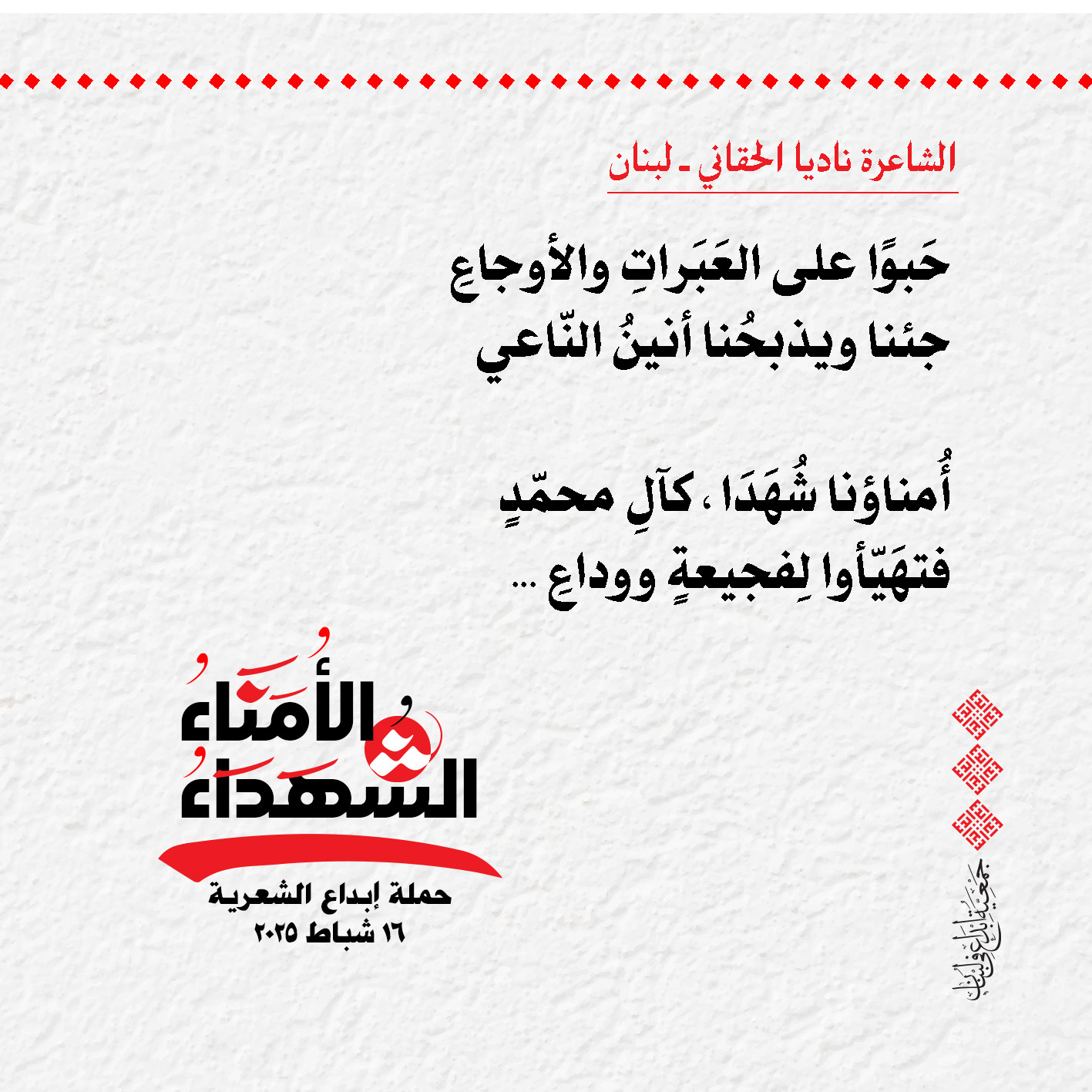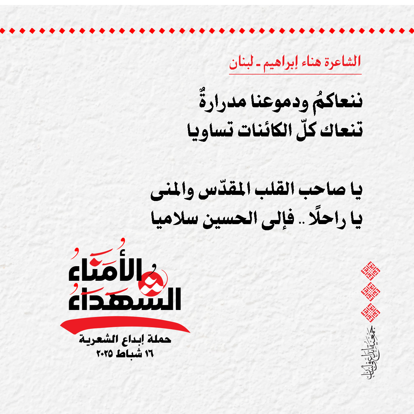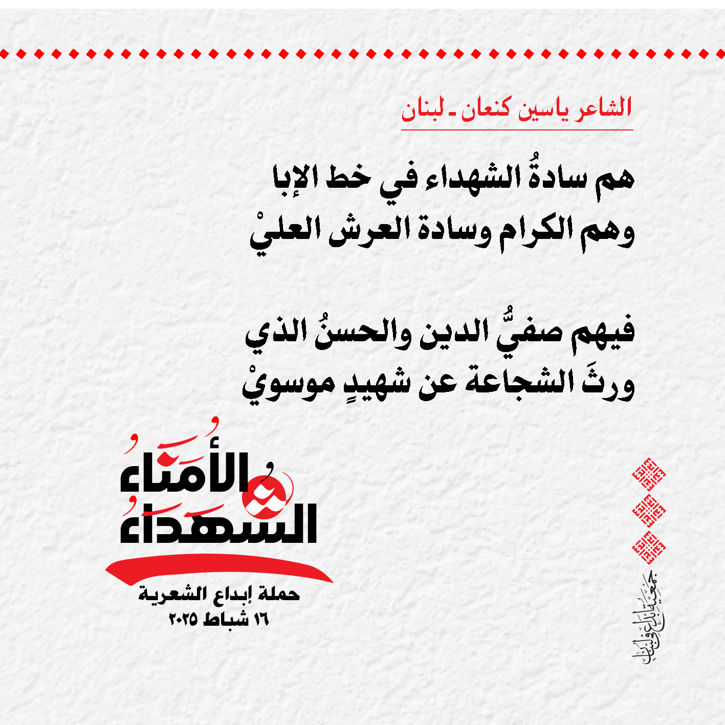 #الأمناء_الشهداء حملة #إبداع الشعرية في يوم #الشهداء_القادة (الموسوي ، الحسيني والهاشمي ) #إبداع المشاركون في الحملة : 1. الشاعرة هناء إبراهيم ـ لبنان 2. الشاعرة نور مصطفى لمع ـ لبنان 3. الشاعرة نبال رعد ـ لبنان 4. الشاعرة ناديا الحقاني ـ لبنان 5. الشاعرة مريم عصمان ـ لبنان 6. الشاعرة فاطمة سكاف ـ لبنان 7. الشاعرة فاطمة السحمراني ـ لبنان 8. الشاعرة غدير نعيم ـ لبنان 9. الشاعرة عزيزة جميل ـ لبنان 10. الشاعرة سكينة سويدان ـ لبنان 11. الشاعرة سارة اليتامى ـ لبنان 12. الشاعرة زينب الموسوي ـ لبنان 13. الشاعر ياسين كنعان ـ لبنان 14. الشاعر محمود شور ـ لبنان 15. الشاعر محمد ال عبد الرسول السماوي ـ العراق 16. الشاعر فؤاد الراشدي ـ اليمن 17. الشاعر علي درويش ـ لبنان 18. الشاعر داوود ال عبد الرسول السماوي ـ العراق 19. الشاعر حيدر حيال ـ العراق 20. الشاعر حسن علي مهنا ـ لبنان 21. الشاعر جاسم محمد الزيادي ـ العراق 22. الشاعر أحمد غالب سرحان ـ لبنان 23. الشاعر أحمد علي أحمد ـ لبنان 24. الشاعر الشيخ علي تيسوغي - مالي 25. الشاعر الشيخ سلمان ال عبد الرسول السماوي ـ العراق 26. الشاعر السيد الحتاني ـ لبنان 15/2/2025