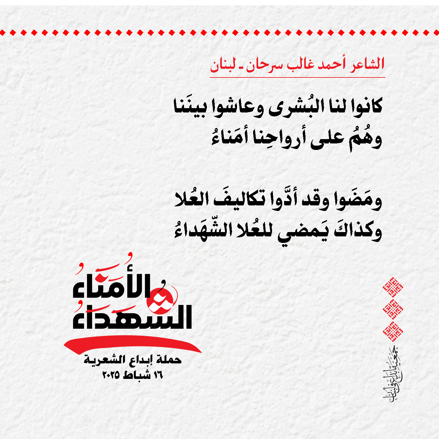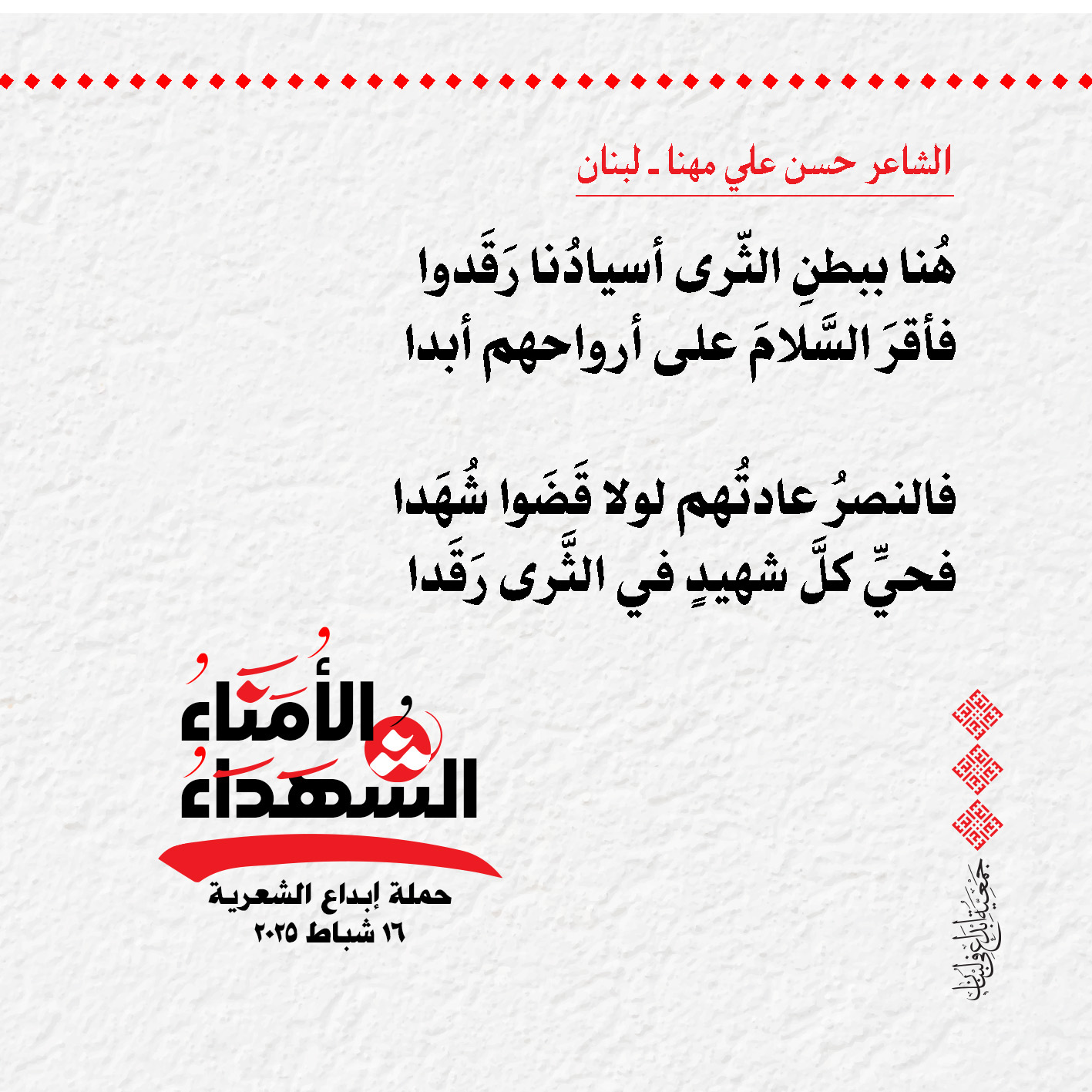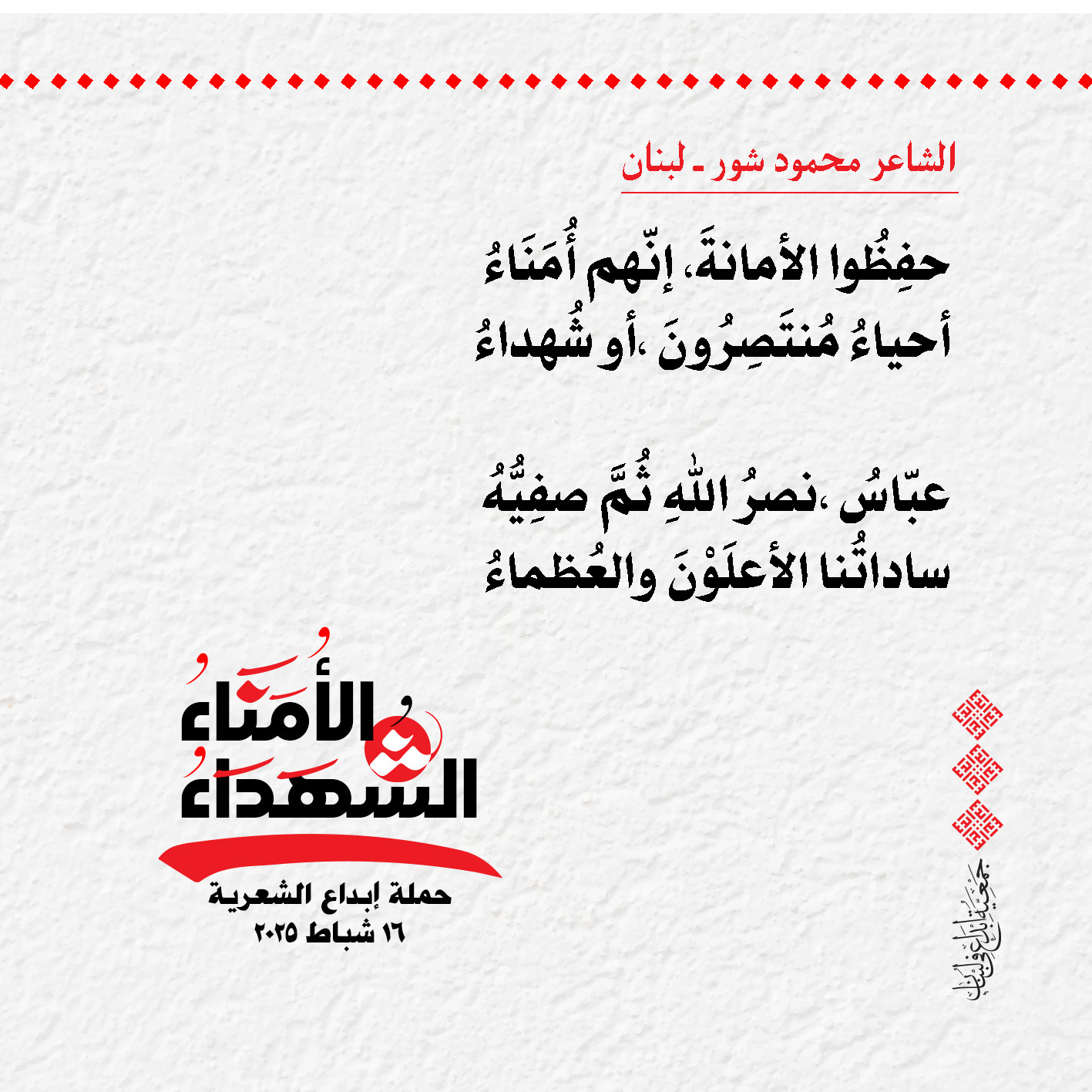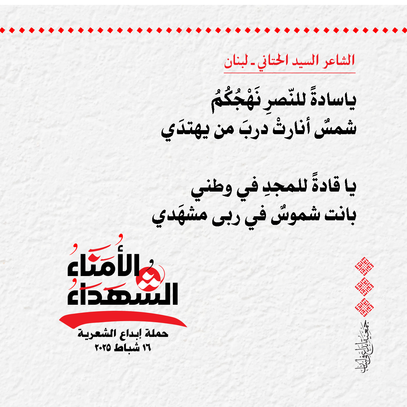 #الأمناء_الشهداء حملة #إبداع الشعرية في يوم #الشهداء_القادة (الموسوي ، الحسيني والهاشمي ) #إبداع المشاركون في الحملة : 1. الشاعرة هناء إبراهيم ـ لبنان 2. الشاعرة نور مصطفى لمع ـ لبنان 3. الشاعرة نبال رعد ـ لبنان 4. الشاعرة ناديا الحقاني ـ لبنان 5. الشاعرة مريم عصمان ـ لبنان 6. الشاعرة فاطمة سكاف ـ لبنان 7. الشاعرة فاطمة السحمراني ـ لبنان 8. الشاعرة غدير نعيم ـ لبنان 9. الشاعرة عزيزة جميل ـ لبنان 10. الشاعرة سكينة سويدان ـ لبنان 11. الشاعرة سارة اليتامى ـ لبنان 12. الشاعرة زينب الموسوي ـ لبنان 13. الشاعر ياسين كنعان ـ لبنان 14. الشاعر محمود شور ـ لبنان 15. الشاعر محمد ال عبد الرسول السماوي ـ العراق 16. الشاعر فؤاد الراشدي ـ اليمن 17. الشاعر علي درويش ـ لبنان 18. الشاعر داوود ال عبد الرسول السماوي ـ العراق 19. الشاعر حيدر حيال ـ العراق 20. الشاعر حسن علي مهنا ـ لبنان 21. الشاعر جاسم محمد الزيادي ـ العراق 22. الشاعر أحمد غالب سرحان ـ لبنان 23. الشاعر أحمد علي أحمد ـ لبنان 24. الشاعر الشيخ علي تيسوغي - مالي 25. الشاعر الشيخ سلمان ال عبد الرسول السماوي ـ العراق 26. الشاعر السيد الحتاني ـ لبنان 15/2/2025