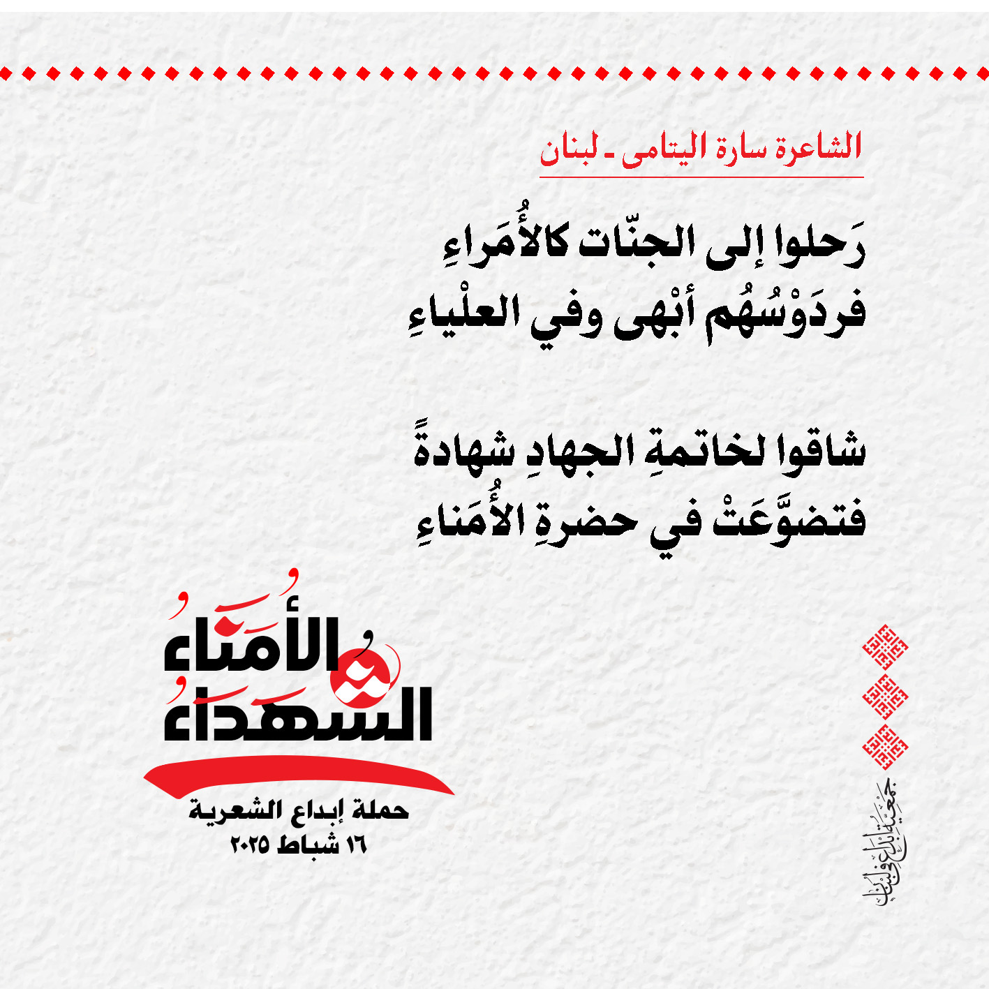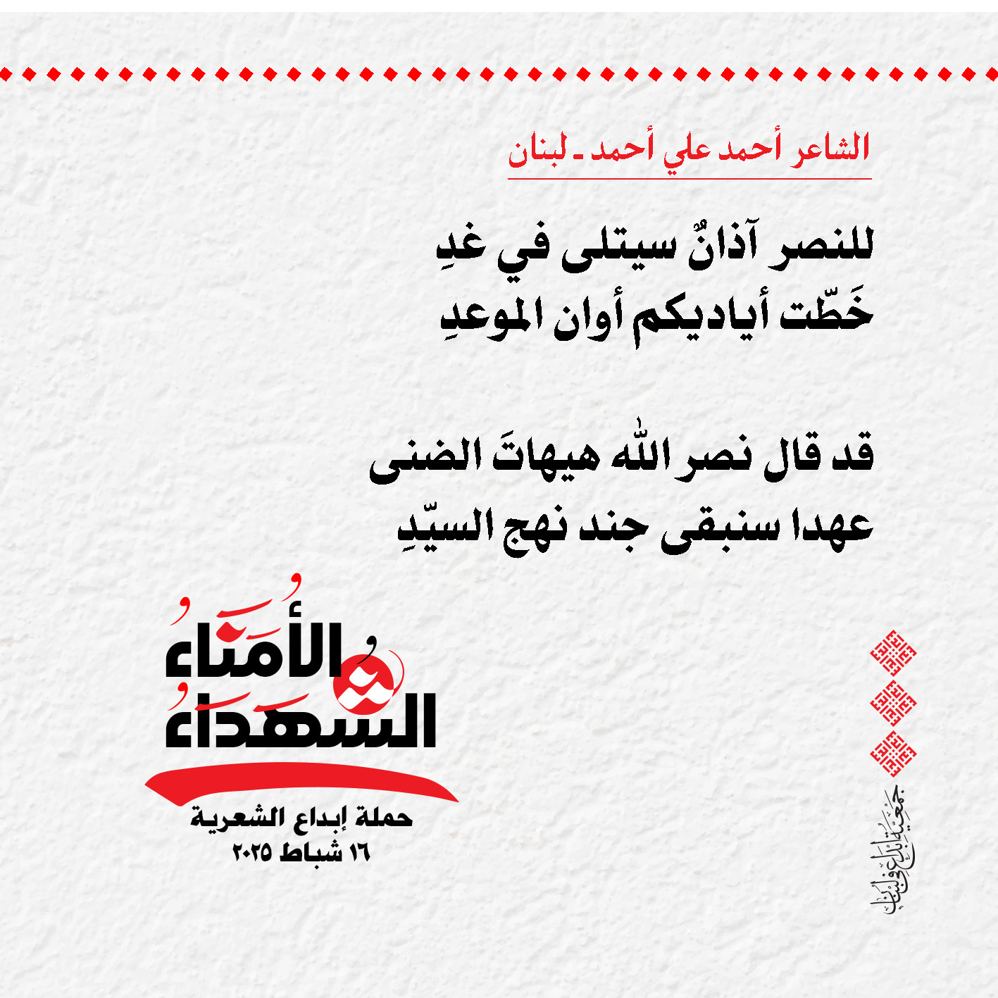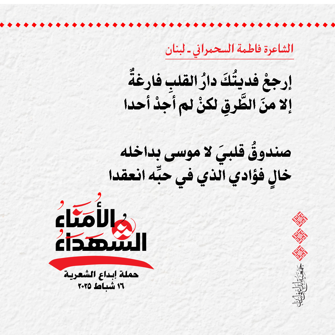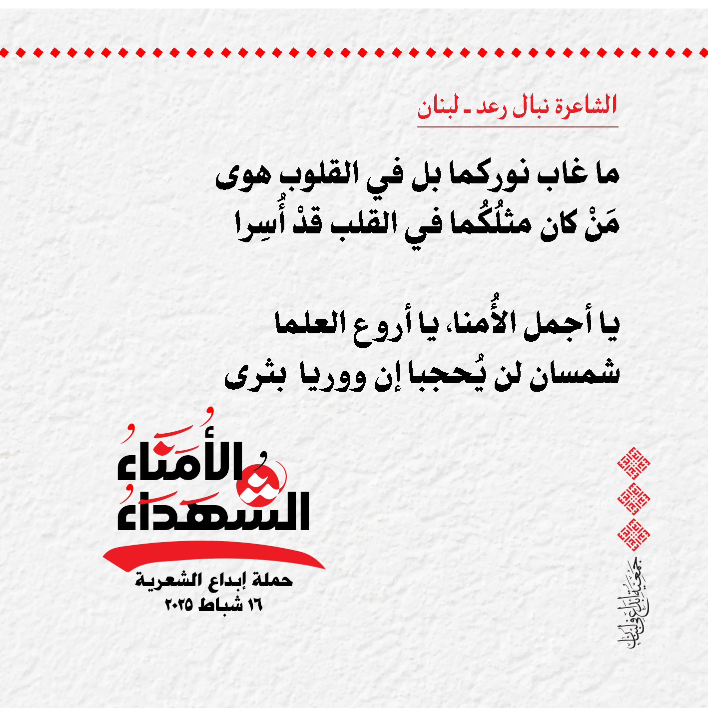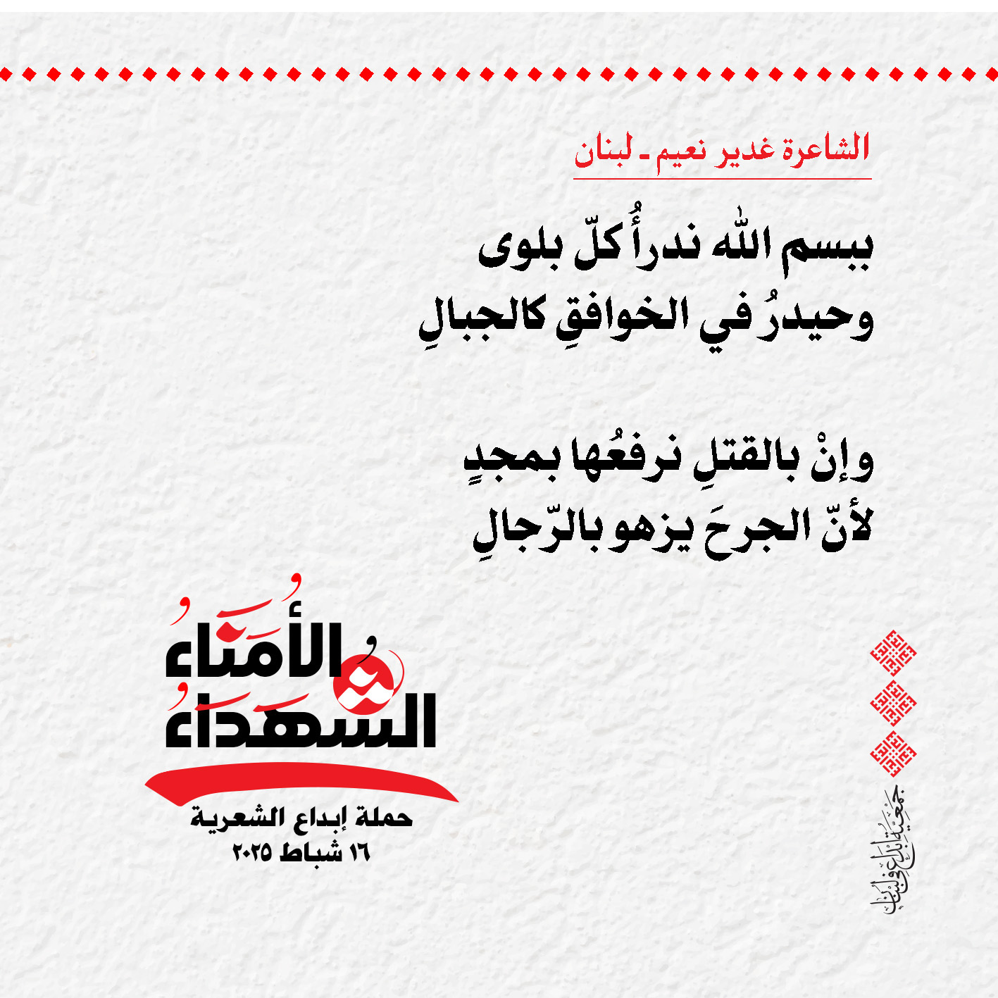 #الأمناء_الشهداء حملة #إبداع الشعرية في يوم #الشهداء_القادة (الموسوي ، الحسيني والهاشمي ) #إبداع المشاركون في الحملة : 1. الشاعرة هناء إبراهيم ـ لبنان 2. الشاعرة نور مصطفى لمع ـ لبنان 3. الشاعرة نبال رعد ـ لبنان 4. الشاعرة ناديا الحقاني ـ لبنان 5. الشاعرة مريم عصمان ـ لبنان 6. الشاعرة فاطمة سكاف ـ لبنان 7. الشاعرة فاطمة السحمراني ـ لبنان 8. الشاعرة غدير نعيم ـ لبنان 9. الشاعرة عزيزة جميل ـ لبنان 10. الشاعرة سكينة سويدان ـ لبنان 11. الشاعرة سارة اليتامى ـ لبنان 12. الشاعرة زينب الموسوي ـ لبنان 13. الشاعر ياسين كنعان ـ لبنان 14. الشاعر محمود شور ـ لبنان 15. الشاعر محمد ال عبد الرسول السماوي ـ العراق 16. الشاعر فؤاد الراشدي ـ اليمن 17. الشاعر علي درويش ـ لبنان 18. الشاعر داوود ال عبد الرسول السماوي ـ العراق 19. الشاعر حيدر حيال ـ العراق 20. الشاعر حسن علي مهنا ـ لبنان 21. الشاعر جاسم محمد الزيادي ـ العراق 22. الشاعر أحمد غالب سرحان ـ لبنان 23. الشاعر أحمد علي أحمد ـ لبنان 24. الشاعر الشيخ علي تيسوغي - مالي 25. الشاعر الشيخ سلمان ال عبد الرسول السماوي ـ العراق 26. الشاعر السيد الحتاني ـ لبنان 15/2/2025