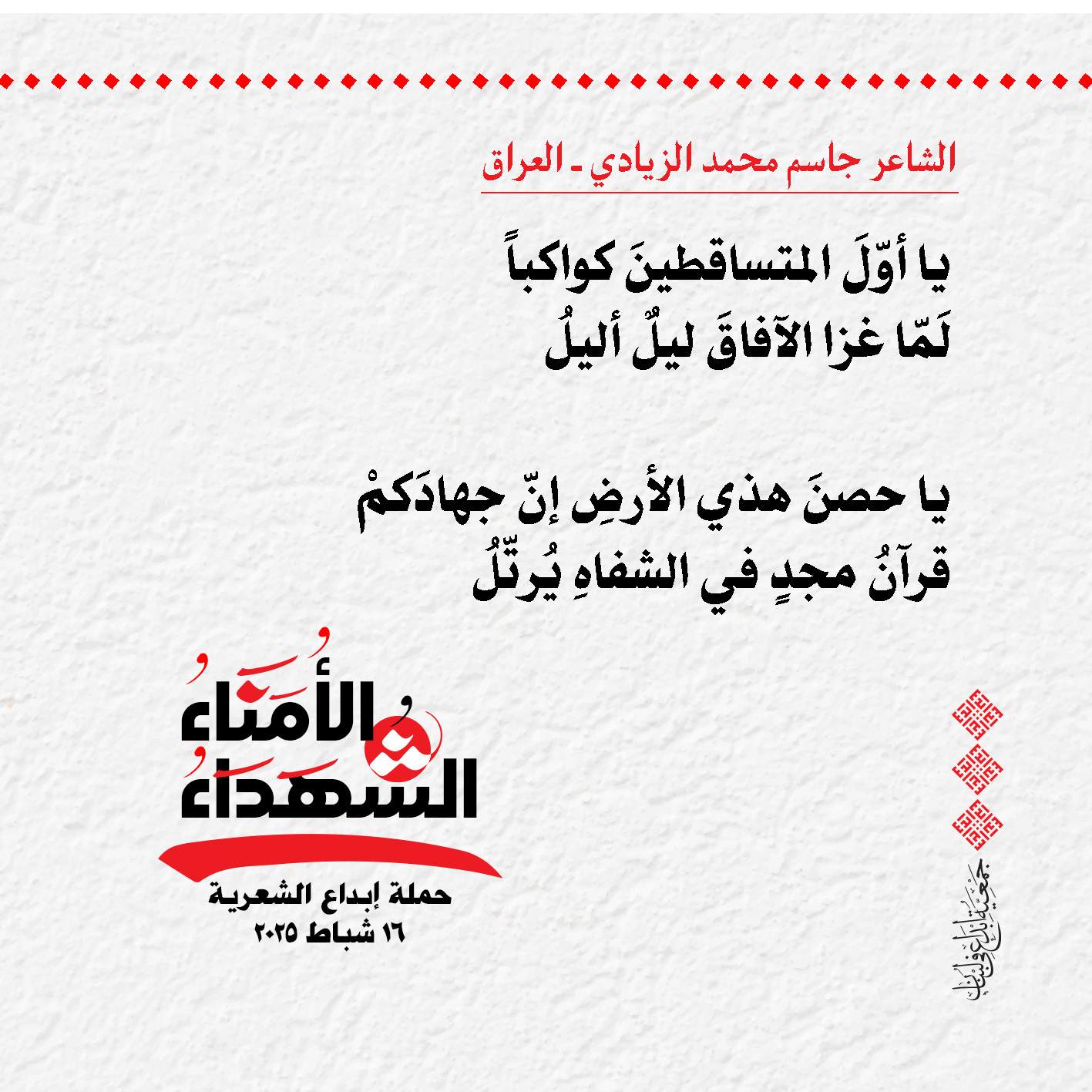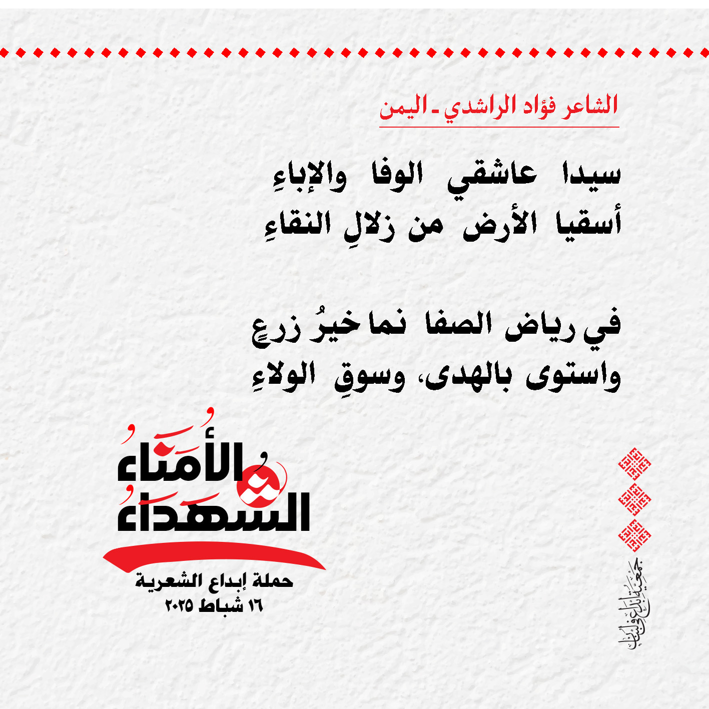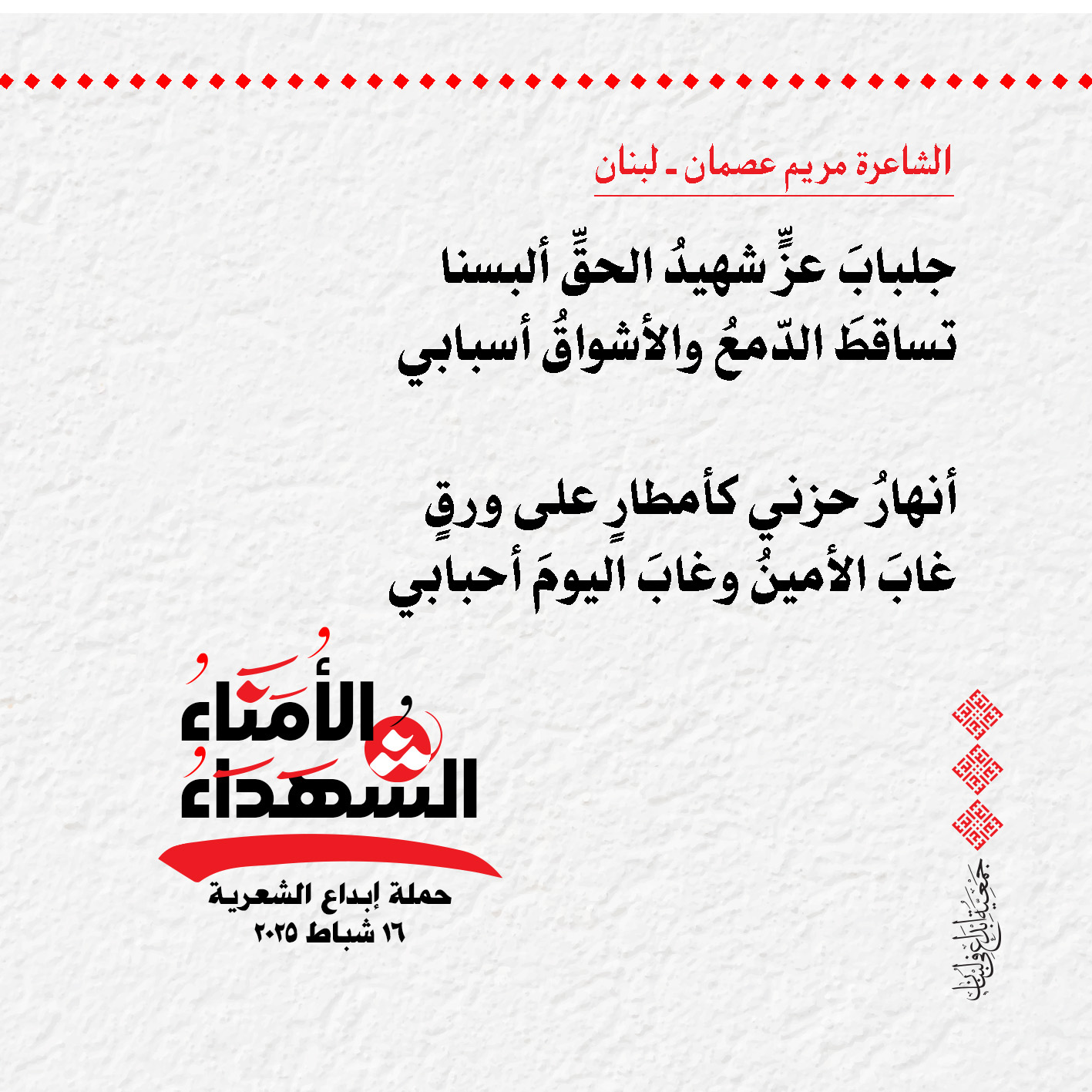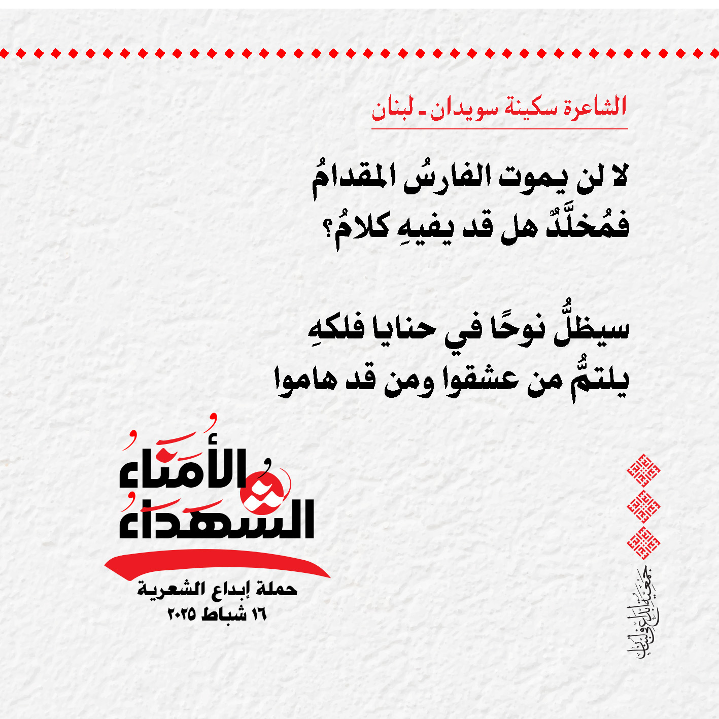 #الأمناء_الشهداء حملة #إبداع الشعرية في يوم #الشهداء_القادة (الموسوي ، الحسيني والهاشمي ) #إبداع المشاركون في الحملة : 1. الشاعرة هناء إبراهيم ـ لبنان 2. الشاعرة نور مصطفى لمع ـ لبنان 3. الشاعرة نبال رعد ـ لبنان 4. الشاعرة ناديا الحقاني ـ لبنان 5. الشاعرة مريم عصمان ـ لبنان 6. الشاعرة فاطمة سكاف ـ لبنان 7. الشاعرة فاطمة السحمراني ـ لبنان 8. الشاعرة غدير نعيم ـ لبنان 9. الشاعرة عزيزة جميل ـ لبنان 10. الشاعرة سكينة سويدان ـ لبنان 11. الشاعرة سارة اليتامى ـ لبنان 12. الشاعرة زينب الموسوي ـ لبنان 13. الشاعر ياسين كنعان ـ لبنان 14. الشاعر محمود شور ـ لبنان 15. الشاعر محمد ال عبد الرسول السماوي ـ العراق 16. الشاعر فؤاد الراشدي ـ اليمن 17. الشاعر علي درويش ـ لبنان 18. الشاعر داوود ال عبد الرسول السماوي ـ العراق 19. الشاعر حيدر حيال ـ العراق 20. الشاعر حسن علي مهنا ـ لبنان 21. الشاعر جاسم محمد الزيادي ـ العراق 22. الشاعر أحمد غالب سرحان ـ لبنان 23. الشاعر أحمد علي أحمد ـ لبنان 24. الشاعر الشيخ علي تيسوغي - مالي 25. الشاعر الشيخ سلمان ال عبد الرسول السماوي ـ العراق 26. الشاعر السيد الحتاني ـ لبنان 15/2/2025
