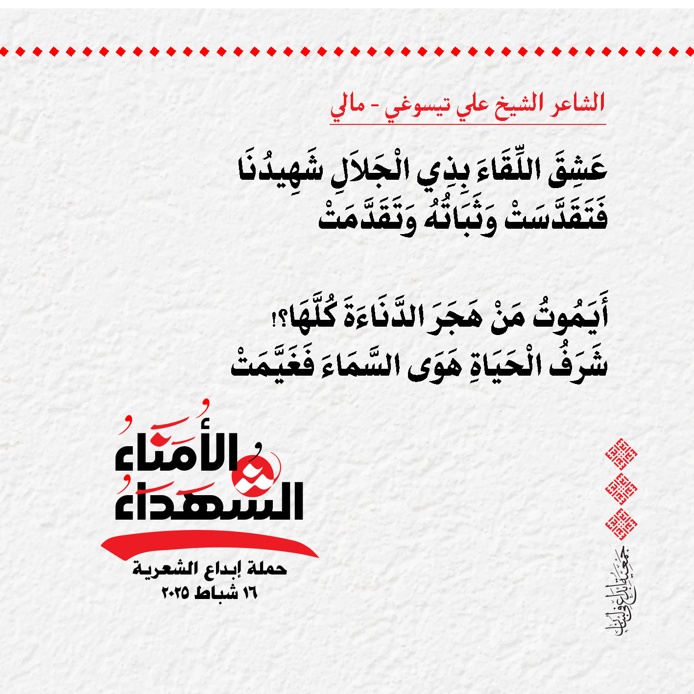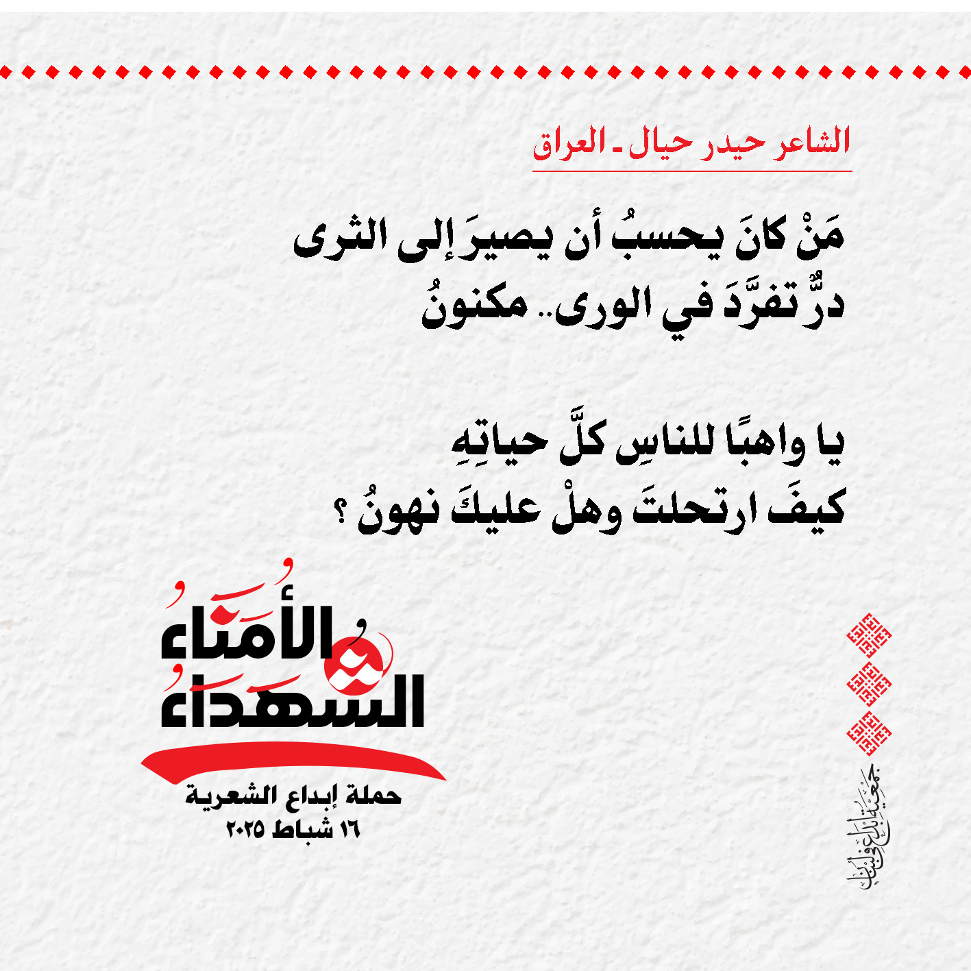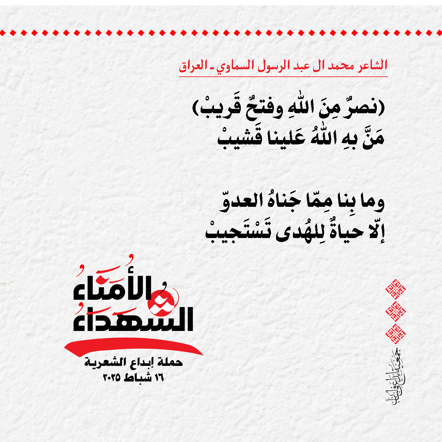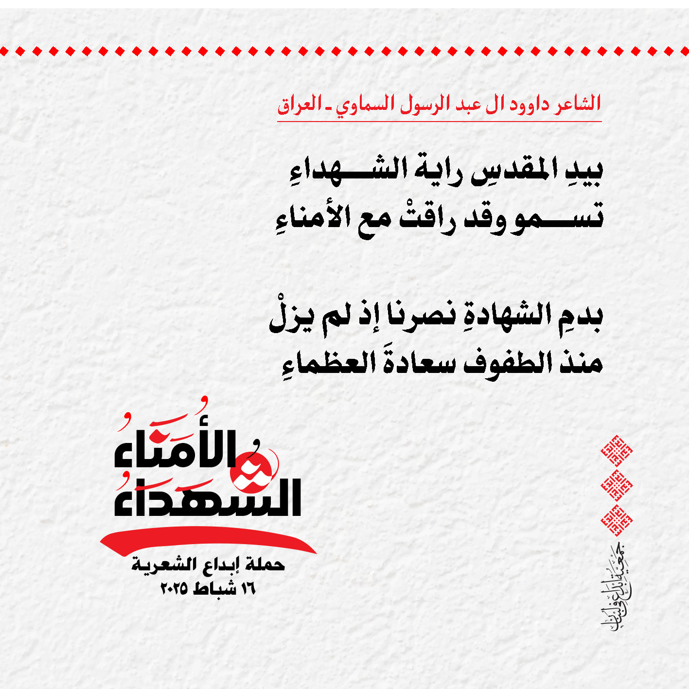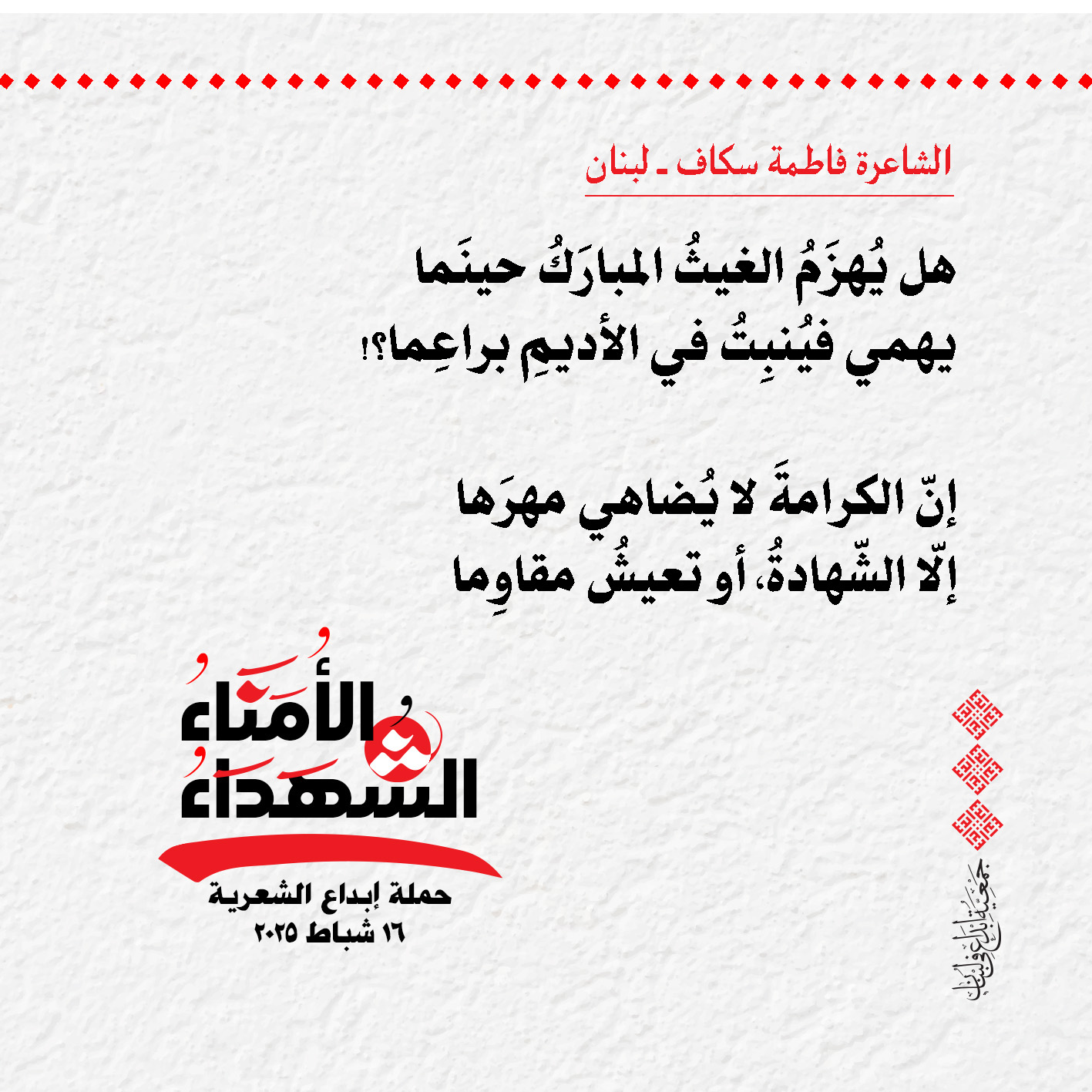 #الأمناء_الشهداء حملة #إبداع الشعرية في يوم #الشهداء_القادة (الموسوي ، الحسيني والهاشمي ) #إبداع المشاركون في الحملة : 1. الشاعرة هناء إبراهيم ـ لبنان 2. الشاعرة نور مصطفى لمع ـ لبنان 3. الشاعرة نبال رعد ـ لبنان 4. الشاعرة ناديا الحقاني ـ لبنان 5. الشاعرة مريم عصمان ـ لبنان 6. الشاعرة فاطمة سكاف ـ لبنان 7. الشاعرة فاطمة السحمراني ـ لبنان 8. الشاعرة غدير نعيم ـ لبنان 9. الشاعرة عزيزة جميل ـ لبنان 10. الشاعرة سكينة سويدان ـ لبنان 11. الشاعرة سارة اليتامى ـ لبنان 12. الشاعرة زينب الموسوي ـ لبنان 13. الشاعر ياسين كنعان ـ لبنان 14. الشاعر محمود شور ـ لبنان 15. الشاعر محمد ال عبد الرسول السماوي ـ العراق 16. الشاعر فؤاد الراشدي ـ اليمن 17. الشاعر علي درويش ـ لبنان 18. الشاعر داوود ال عبد الرسول السماوي ـ العراق 19. الشاعر حيدر حيال ـ العراق 20. الشاعر حسن علي مهنا ـ لبنان 21. الشاعر جاسم محمد الزيادي ـ العراق 22. الشاعر أحمد غالب سرحان ـ لبنان 23. الشاعر أحمد علي أحمد ـ لبنان 24. الشاعر الشيخ علي تيسوغي - مالي 25. الشاعر الشيخ سلمان ال عبد الرسول السماوي ـ العراق 26. الشاعر السيد الحتاني ـ لبنان 15/2/2025