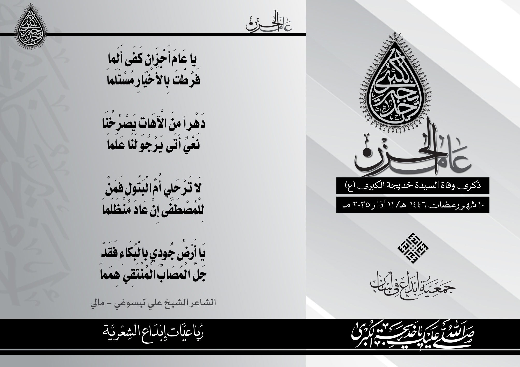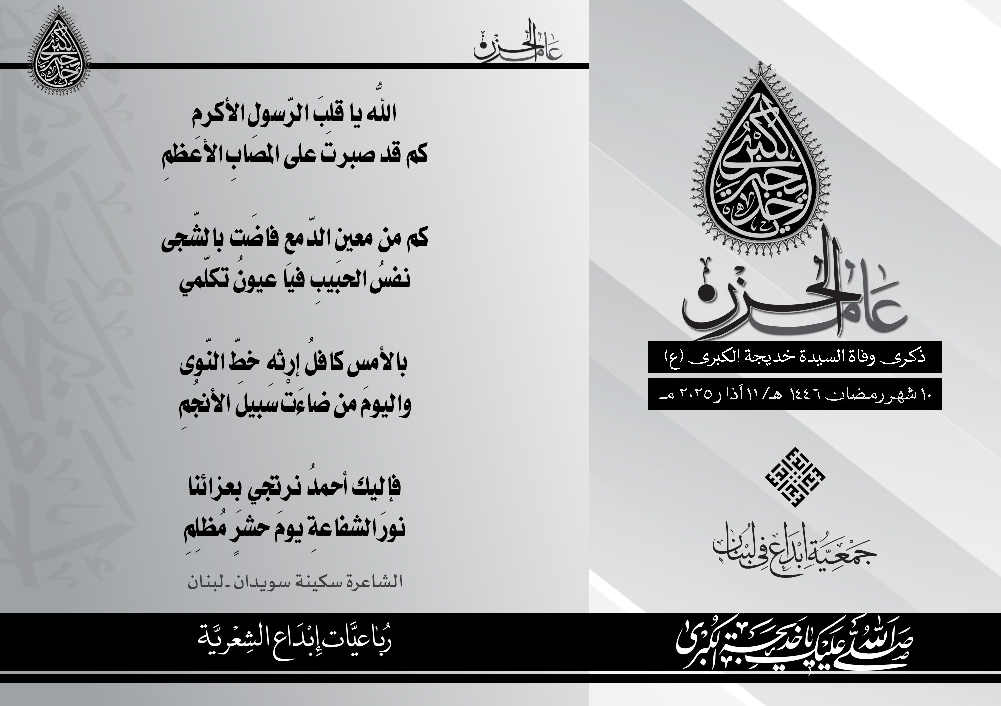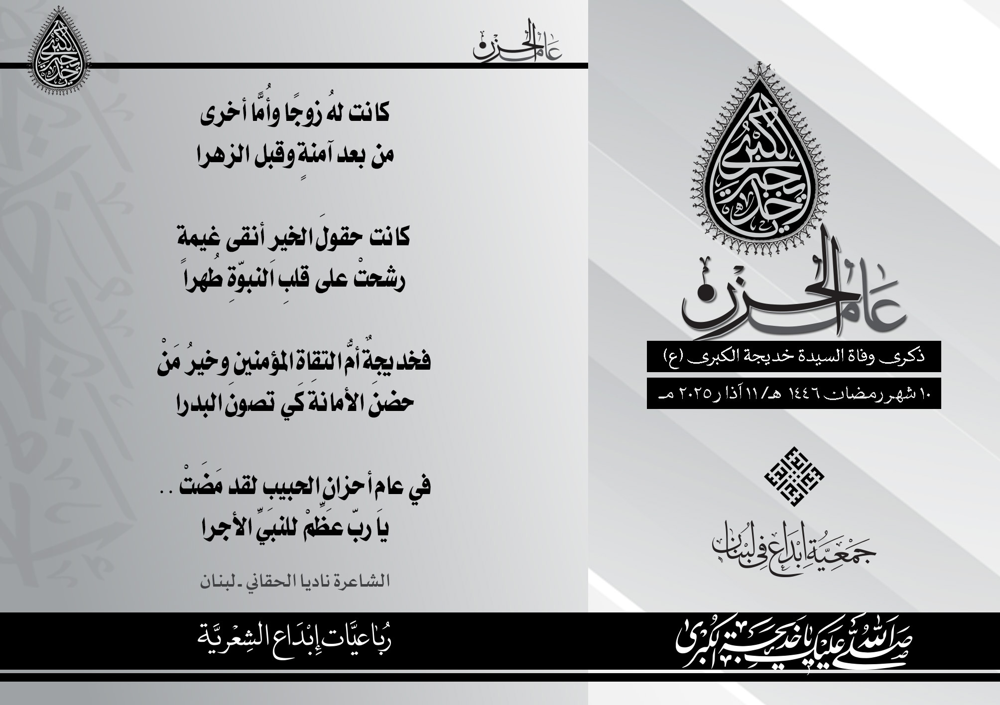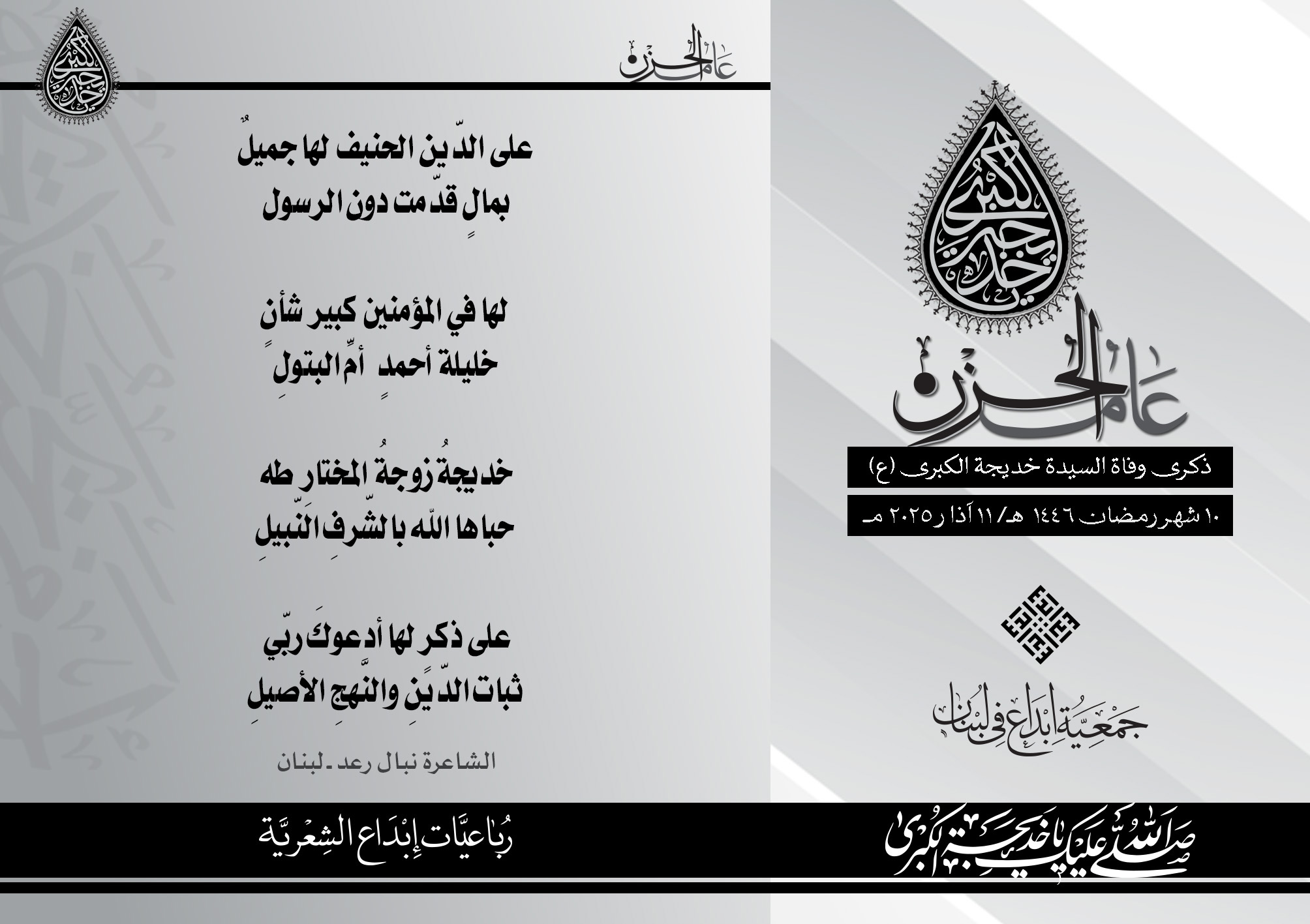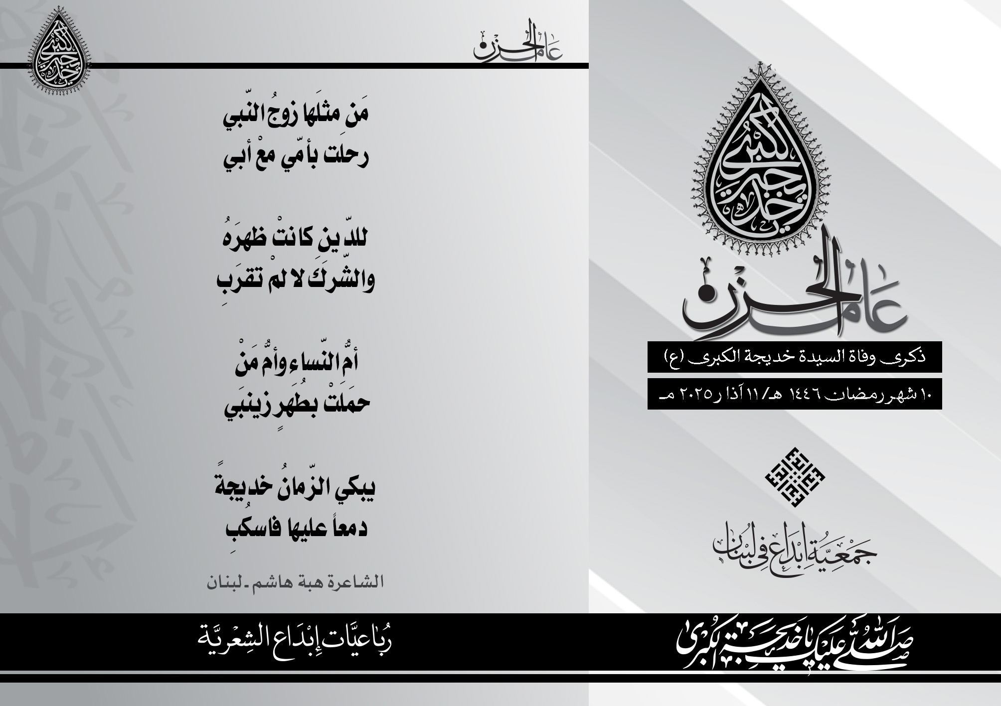 رباعيات #خديجة_الكبرى (ع) الشعرية #عام_الحزن2 ذكرى وفاة السيدة خديجة الكبرى (ع) #إبداع المشاركون في الحملة : 1. الشاعر السيد الحتاني ـ لبنان 2. الشاعر الشيخ علي تيسوغي - مالي 3. الشاعر راضي الفريجي ـ العراق 4. الشاعر علي درويش ـ لبنان 5. الشاعر فؤاد الراشدي ـ اليمن 6. الشاعر محمود شور ـ لبنان 7. الشاعر معن عبد الإله محسن ـ العراق 8. الشاعرة ذكرى الراشدي ـ اليمن 9. الشاعرة زينب الموسوي ـ لبنان 10. الشاعرة سارة اليتامى ـ لبنان 11. الشاعرة سكينة سويدان ـ لبنان 12. الشاعرة ناديا الحقاني ـ لبنان 13. الشاعرة نبال رعد ـ لبنان 14. الشاعرة هبة هاشم ـ لبنان 10/3/2025