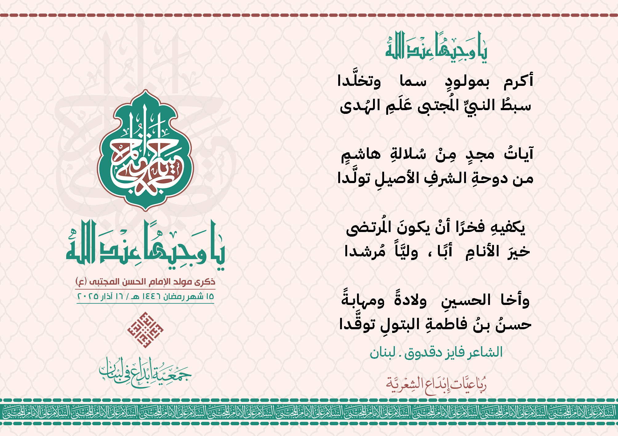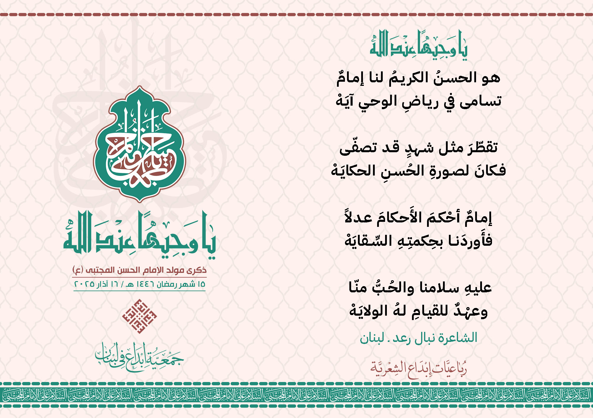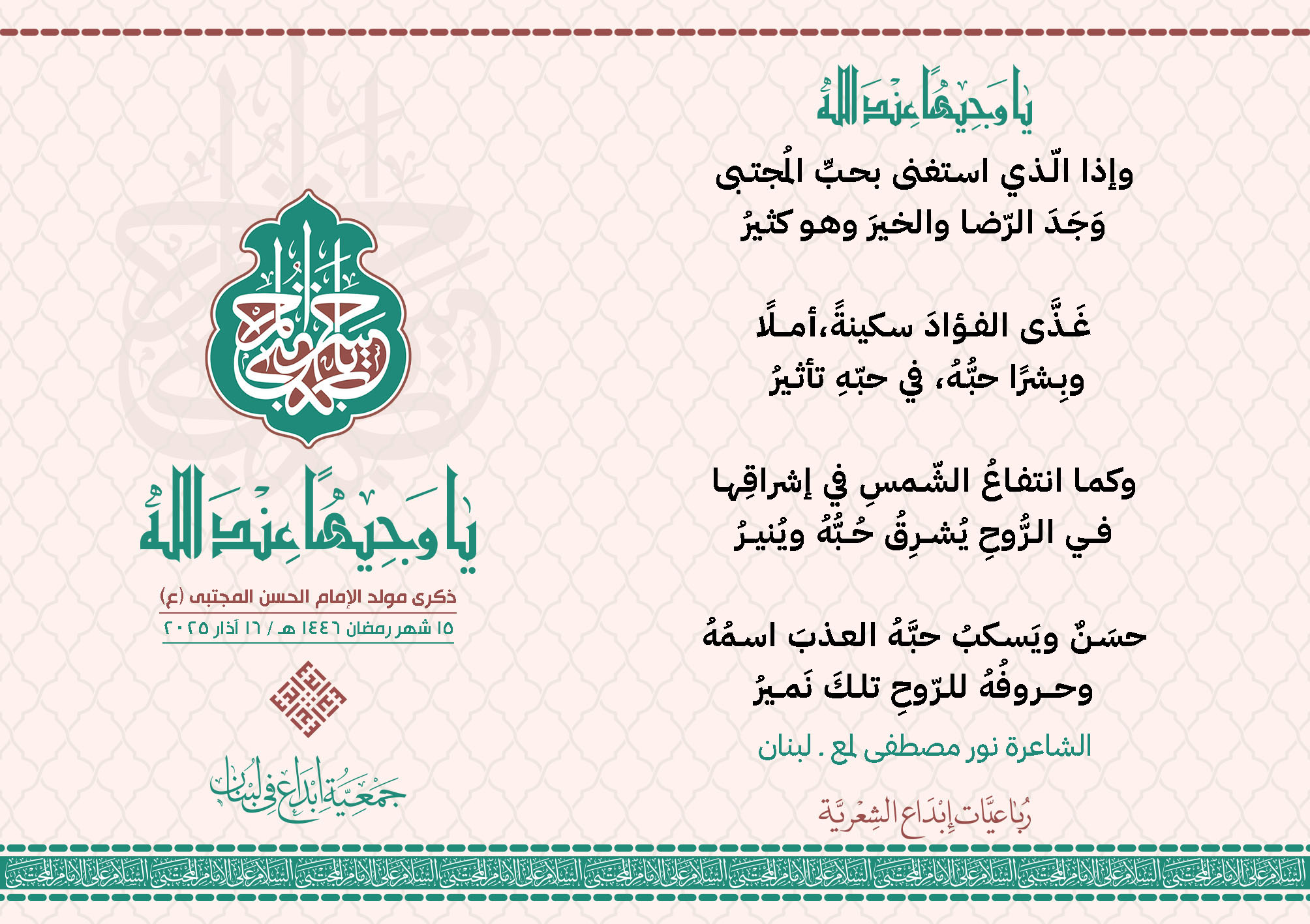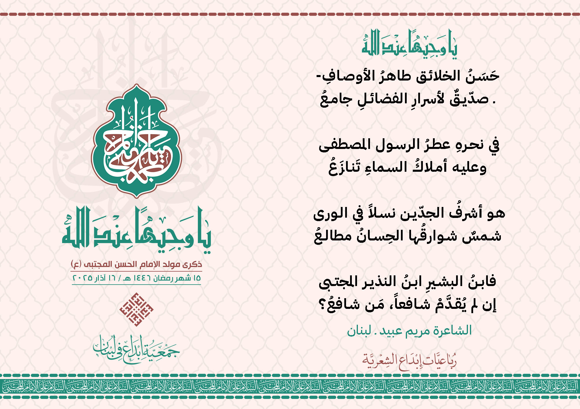 #يا_وجيهاً_عند_الله رباعيات #إبداع الشعرية مولد الإمام #المجتبى (ع) المشاركون في الحملة : 1. الشاعر السيد الحتاني ـ لبنان 2. الشاعر الشيخ علي تيسوغي - مالي 3. الشاعر داوود ال عبد الرسول السماوي ـ العراق 4. الشاعر راضي الفريجي ـ العراق 5. الشاعر عباس السيد حسين ـ لبنان 6. الشاعر عقيل اللواتي ـ سلطنة عُمان 7. الشاعر علي محمد طاهر الصفار ـ العراق 8. الشاعر فايز دقدوق ـ لبنان 9. الشاعر فضل سرور ـ لبنان 10. الشاعر مثيل جبار الزيدي ـ العراق 11. الشاعر محمد علي محمد مهدي السماوي ـ العراق 12. الشاعر محمود شور ـ لبنان 13. الشاعر معن عبد الإله محسن ـ العراق 14. الشاعر ياسين كنعان ـ لبنان 15. الشاعرة آمنه محمد علي السماوي ـ العراق 16. الشاعرة ذكرى الراشدي ـ اليمن 17. الشاعرة زينب الموسوي ـ لبنان 18. الشاعرة سارة اليتامى ـ لبنان 19. الشاعرة سكينة سويدان ـ لبنان 20. الشاعرة غدير نعيم ـ لبنان 21. الشاعرة فاطمة أيوب ـ لبنان 22. الشاعرة مريم عبيد ـ لبنان 23. الشاعرة ناديا الحقاني ـ لبنان 24. الشاعرة نبال رعد ـ لبنان 25. الشاعرة نور مصطفى لمع ـ لبنان 16/3/2025