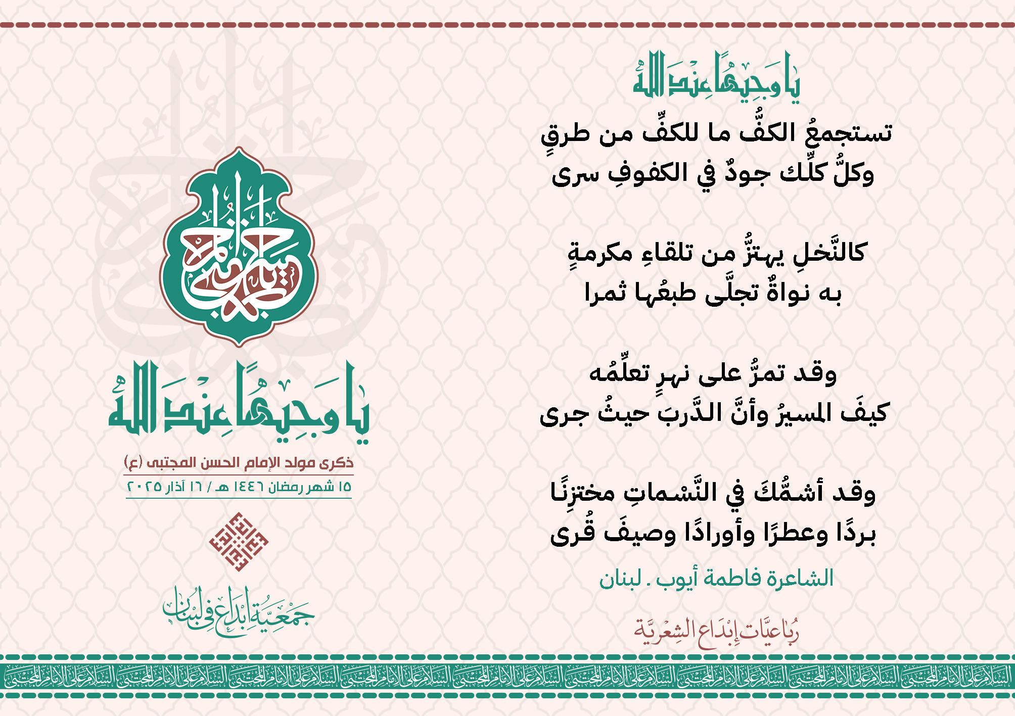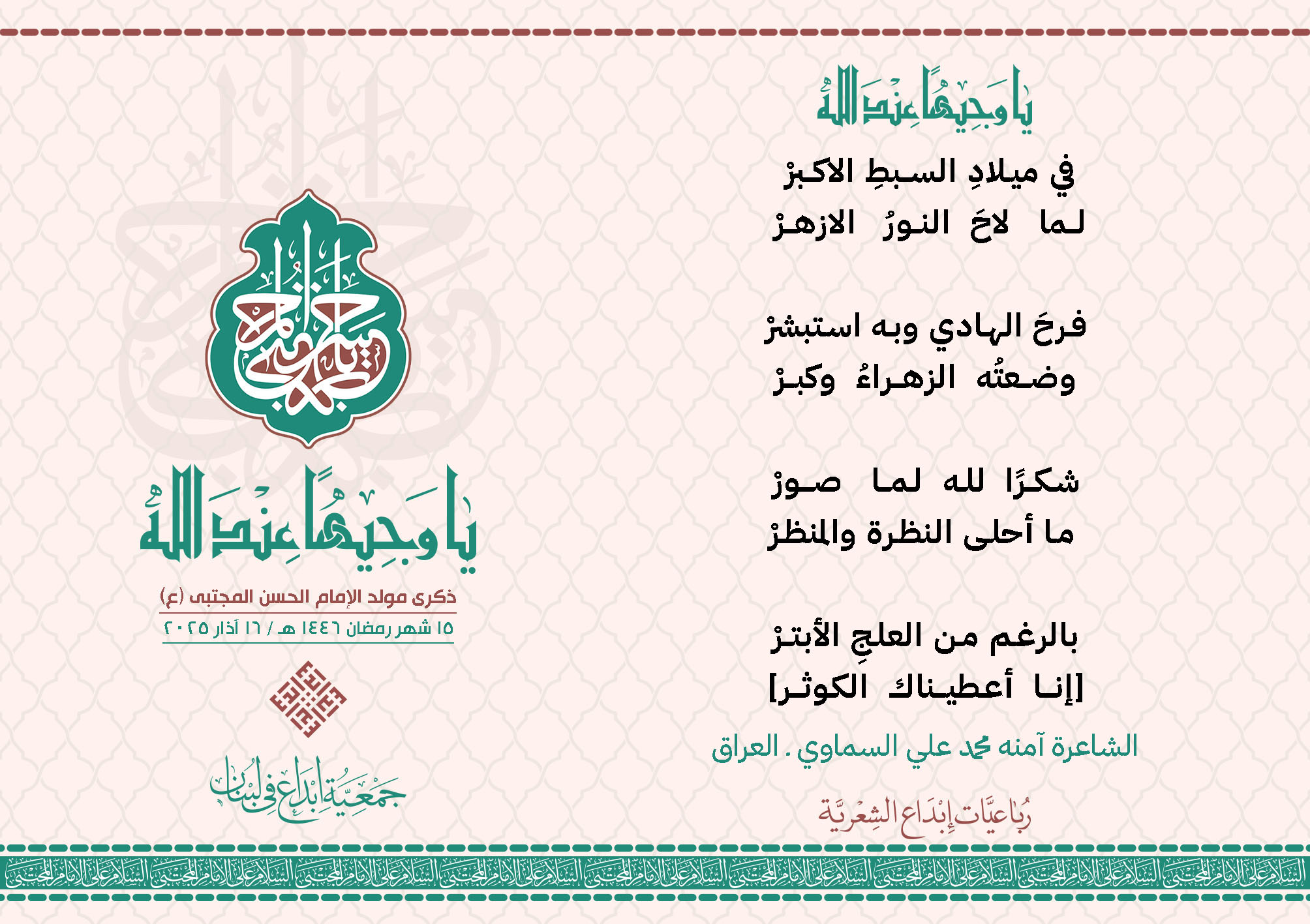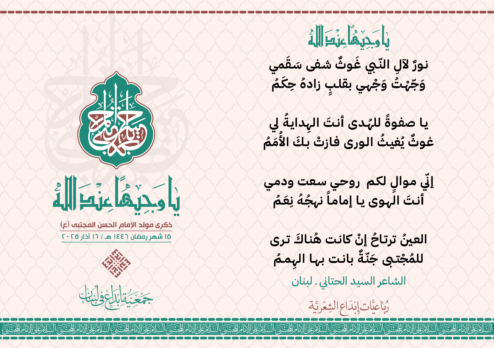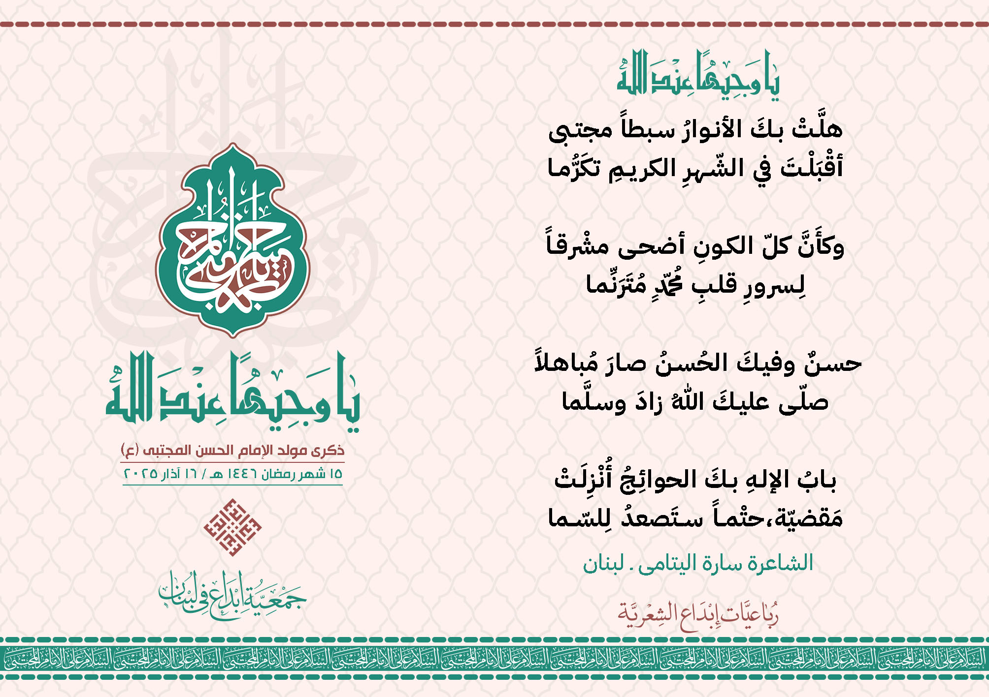 #يا_وجيهاً_عند_الله رباعيات #إبداع الشعرية مولد الإمام #المجتبى (ع) المشاركون في الحملة : 1. الشاعر السيد الحتاني ـ لبنان 2. الشاعر الشيخ علي تيسوغي - مالي 3. الشاعر داوود ال عبد الرسول السماوي ـ العراق 4. الشاعر راضي الفريجي ـ العراق 5. الشاعر عباس السيد حسين ـ لبنان 6. الشاعر عقيل اللواتي ـ سلطنة عُمان 7. الشاعر علي محمد طاهر الصفار ـ العراق 8. الشاعر فايز دقدوق ـ لبنان 9. الشاعر فضل سرور ـ لبنان 10. الشاعر مثيل جبار الزيدي ـ العراق 11. الشاعر محمد علي محمد مهدي السماوي ـ العراق 12. الشاعر محمود شور ـ لبنان 13. الشاعر معن عبد الإله محسن ـ العراق 14. الشاعر ياسين كنعان ـ لبنان 15. الشاعرة آمنه محمد علي السماوي ـ العراق 16. الشاعرة ذكرى الراشدي ـ اليمن 17. الشاعرة زينب الموسوي ـ لبنان 18. الشاعرة سارة اليتامى ـ لبنان 19. الشاعرة سكينة سويدان ـ لبنان 20. الشاعرة غدير نعيم ـ لبنان 21. الشاعرة فاطمة أيوب ـ لبنان 22. الشاعرة مريم عبيد ـ لبنان 23. الشاعرة ناديا الحقاني ـ لبنان 24. الشاعرة نبال رعد ـ لبنان 25. الشاعرة نور مصطفى لمع ـ لبنان 16/3/2025