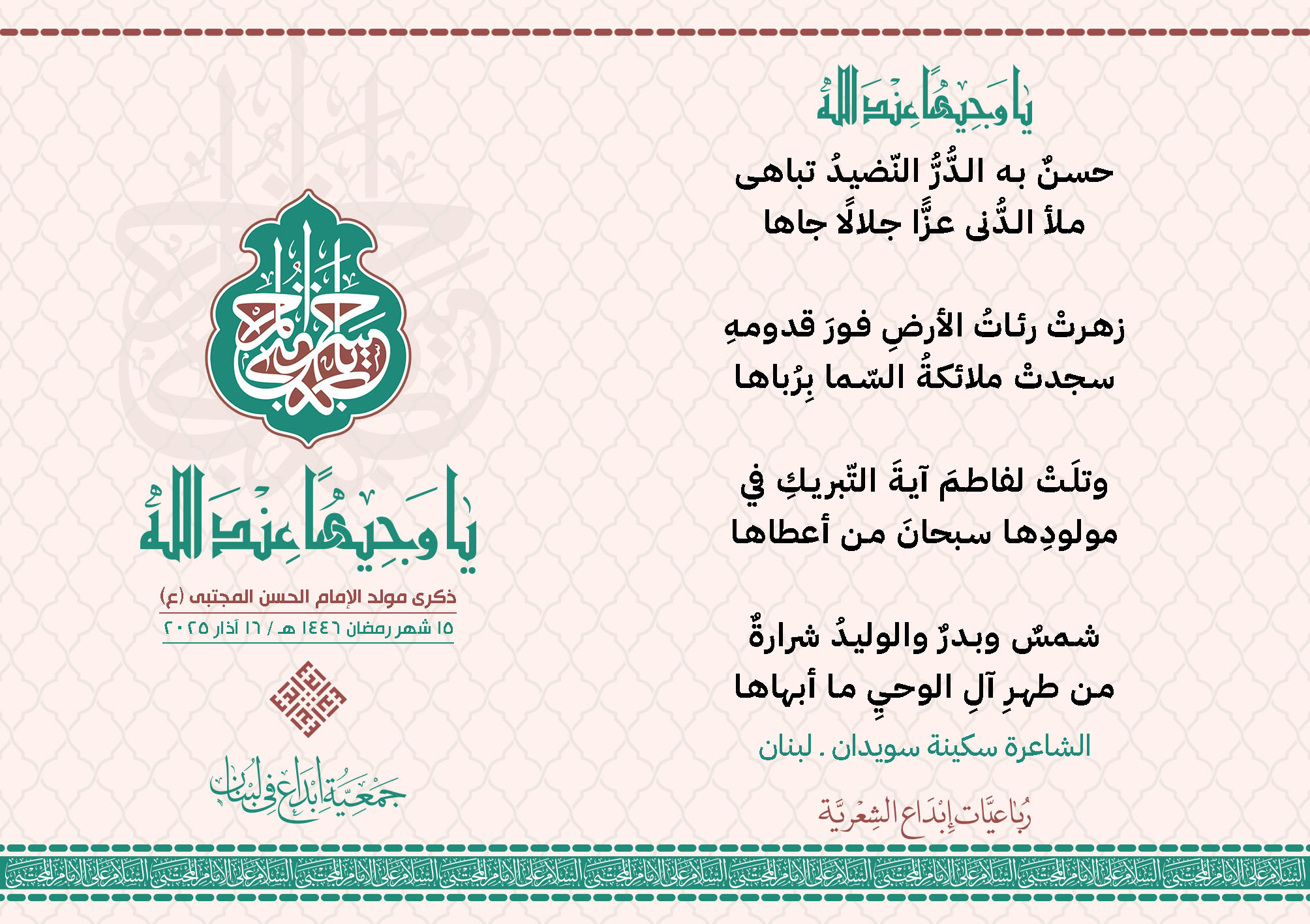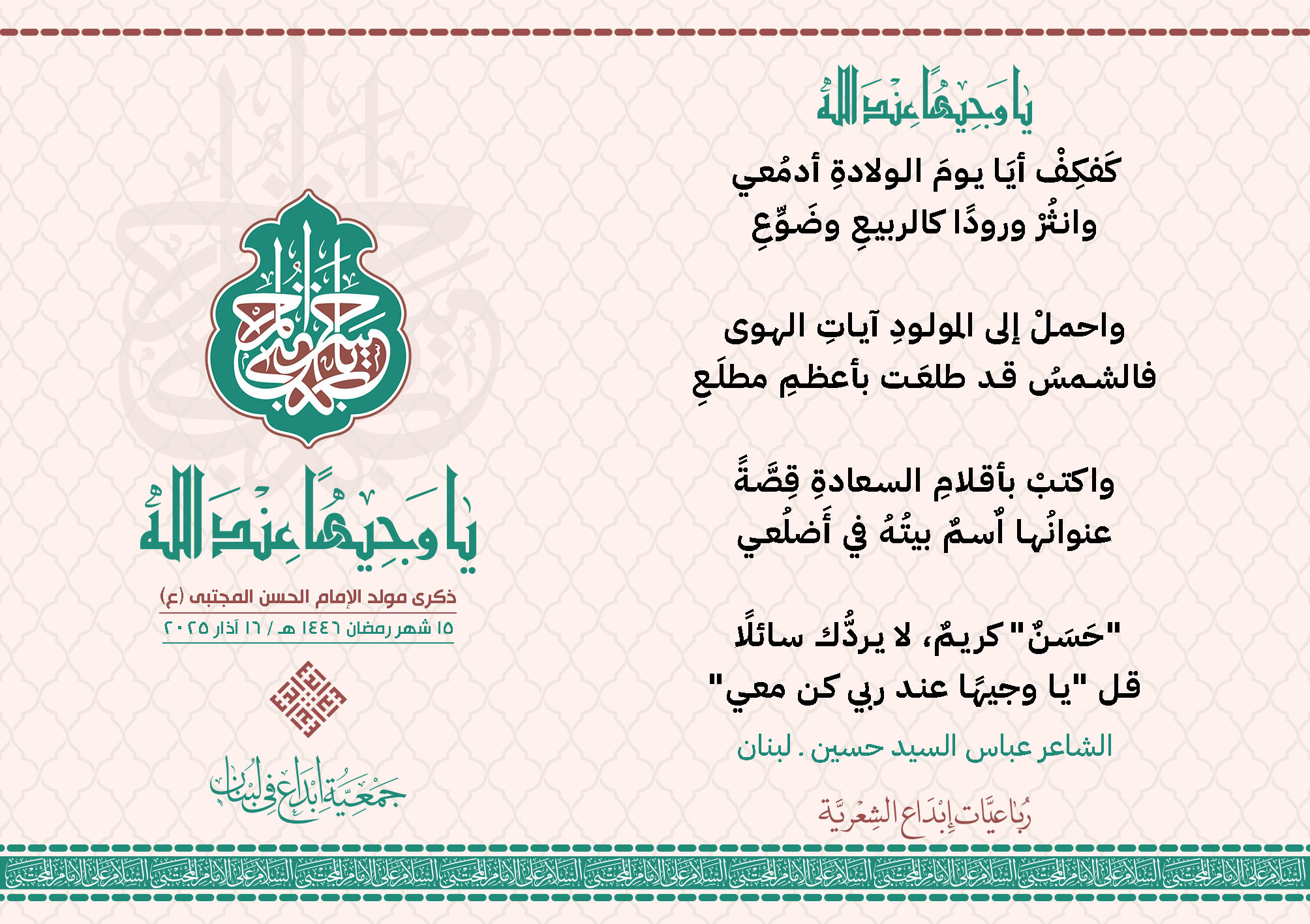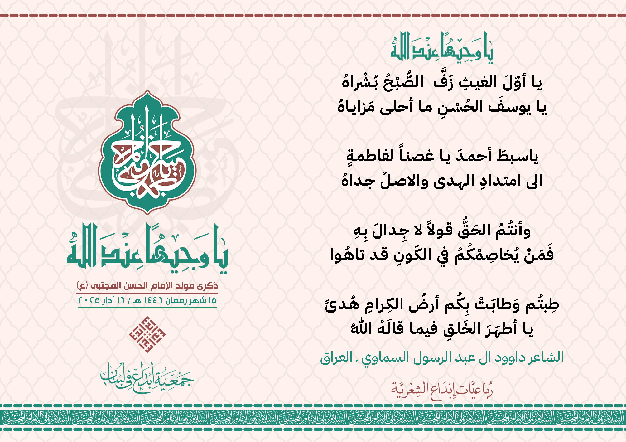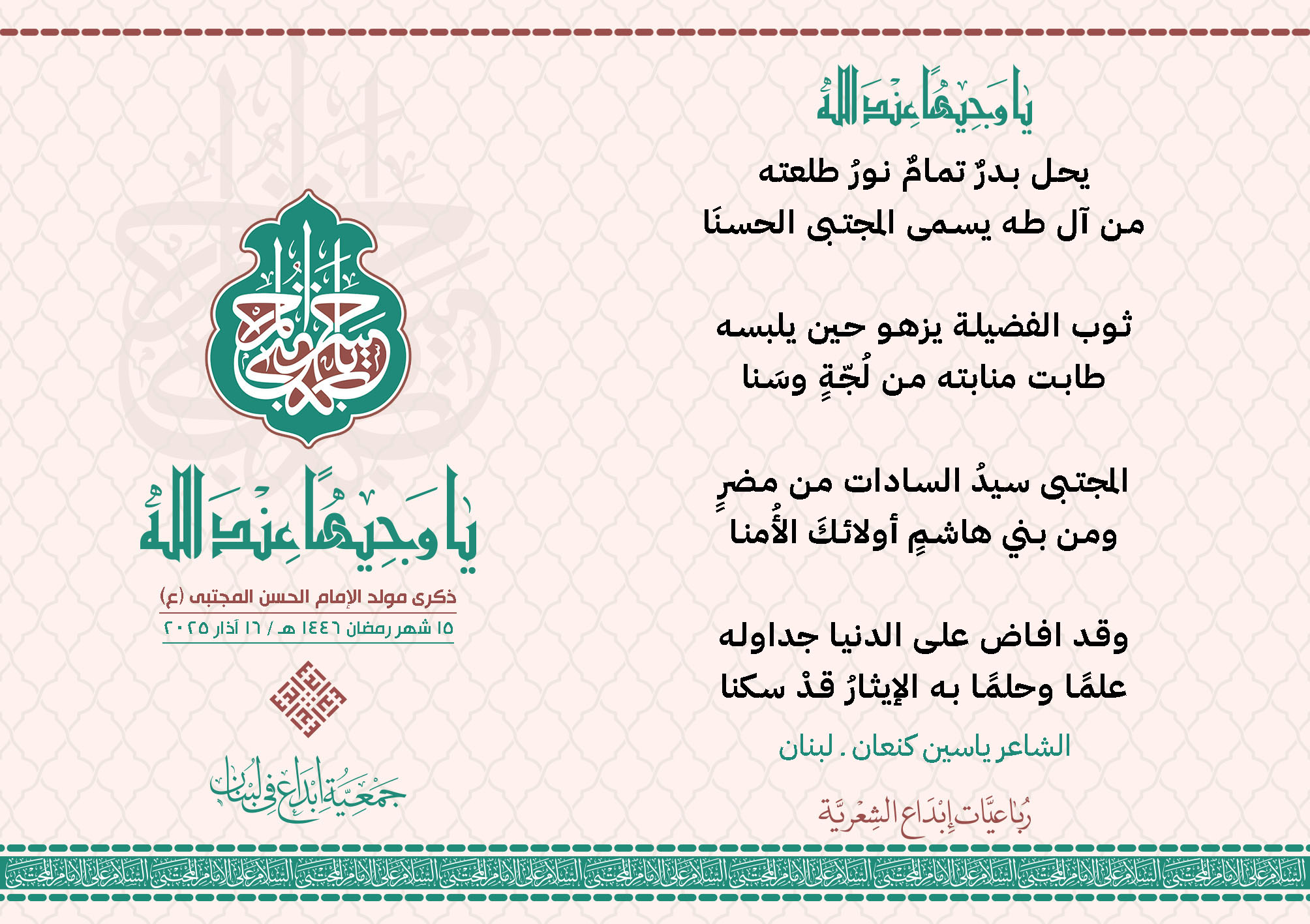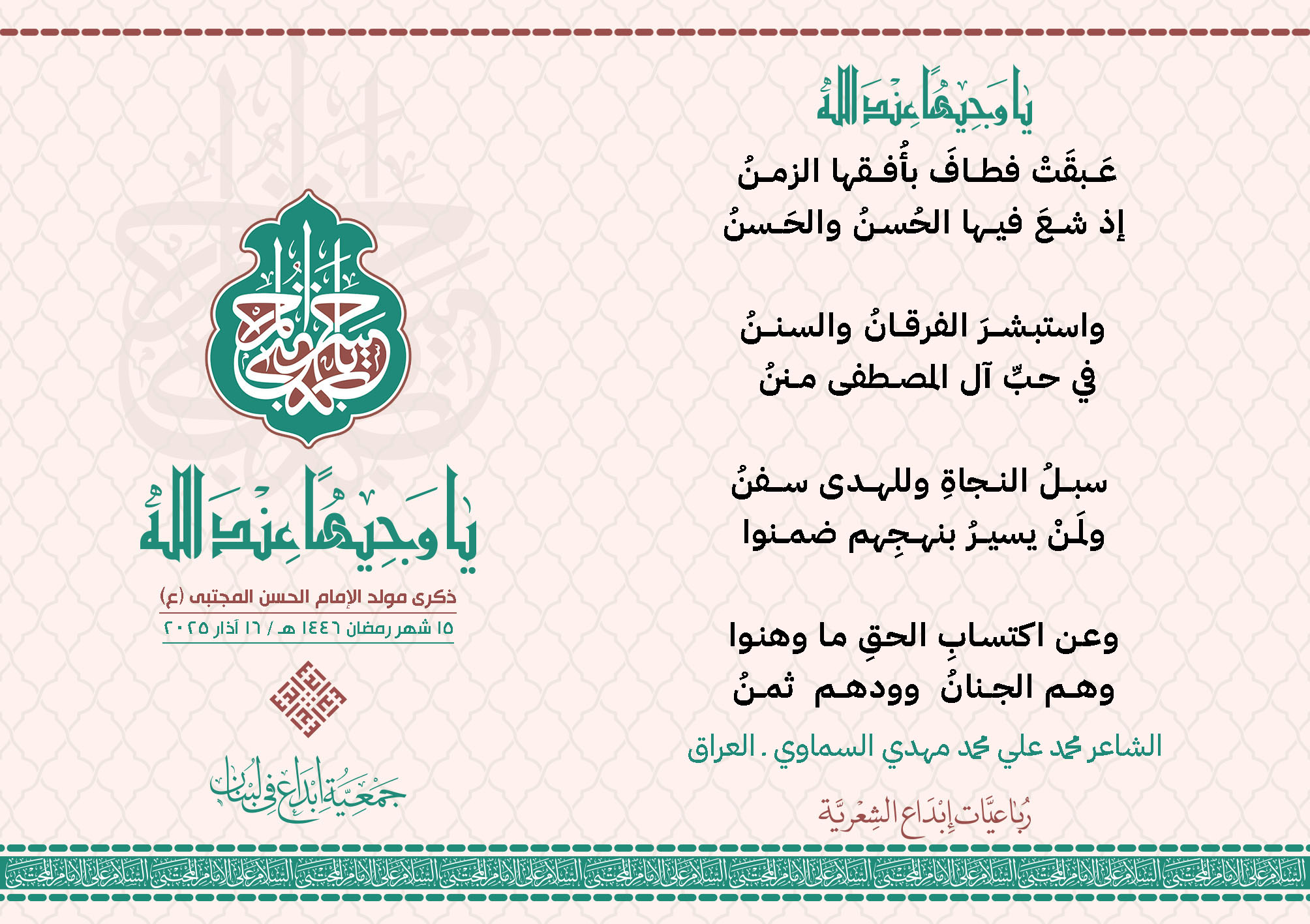 #يا_وجيهاً_عند_الله رباعيات #إبداع الشعرية مولد الإمام #المجتبى (ع) المشاركون في الحملة : 1. الشاعر السيد الحتاني ـ لبنان 2. الشاعر الشيخ علي تيسوغي - مالي 3. الشاعر داوود ال عبد الرسول السماوي ـ العراق 4. الشاعر راضي الفريجي ـ العراق 5. الشاعر عباس السيد حسين ـ لبنان 6. الشاعر عقيل اللواتي ـ سلطنة عُمان 7. الشاعر علي محمد طاهر الصفار ـ العراق 8. الشاعر فايز دقدوق ـ لبنان 9. الشاعر فضل سرور ـ لبنان 10. الشاعر مثيل جبار الزيدي ـ العراق 11. الشاعر محمد علي محمد مهدي السماوي ـ العراق 12. الشاعر محمود شور ـ لبنان 13. الشاعر معن عبد الإله محسن ـ العراق 14. الشاعر ياسين كنعان ـ لبنان 15. الشاعرة آمنه محمد علي السماوي ـ العراق 16. الشاعرة ذكرى الراشدي ـ اليمن 17. الشاعرة زينب الموسوي ـ لبنان 18. الشاعرة سارة اليتامى ـ لبنان 19. الشاعرة سكينة سويدان ـ لبنان 20. الشاعرة غدير نعيم ـ لبنان 21. الشاعرة فاطمة أيوب ـ لبنان 22. الشاعرة مريم عبيد ـ لبنان 23. الشاعرة ناديا الحقاني ـ لبنان 24. الشاعرة نبال رعد ـ لبنان 25. الشاعرة نور مصطفى لمع ـ لبنان 16/3/2025