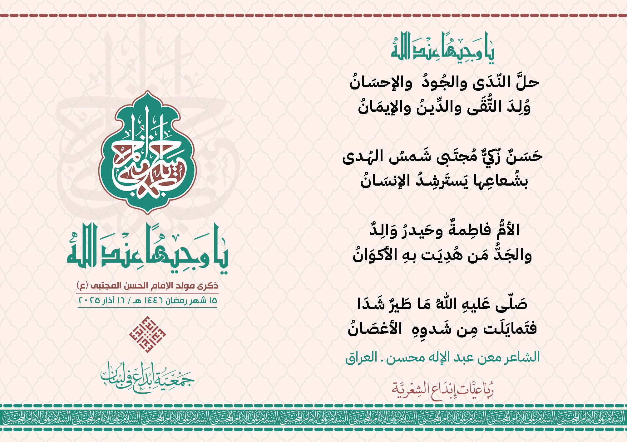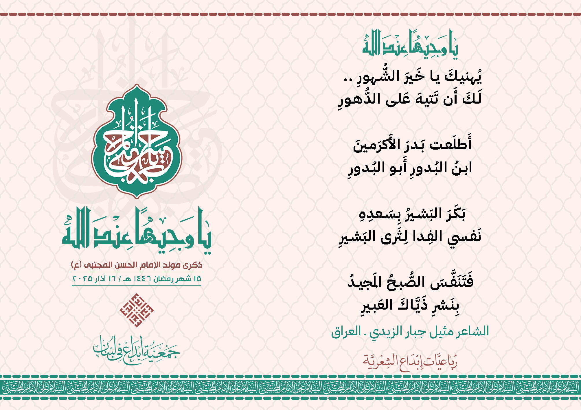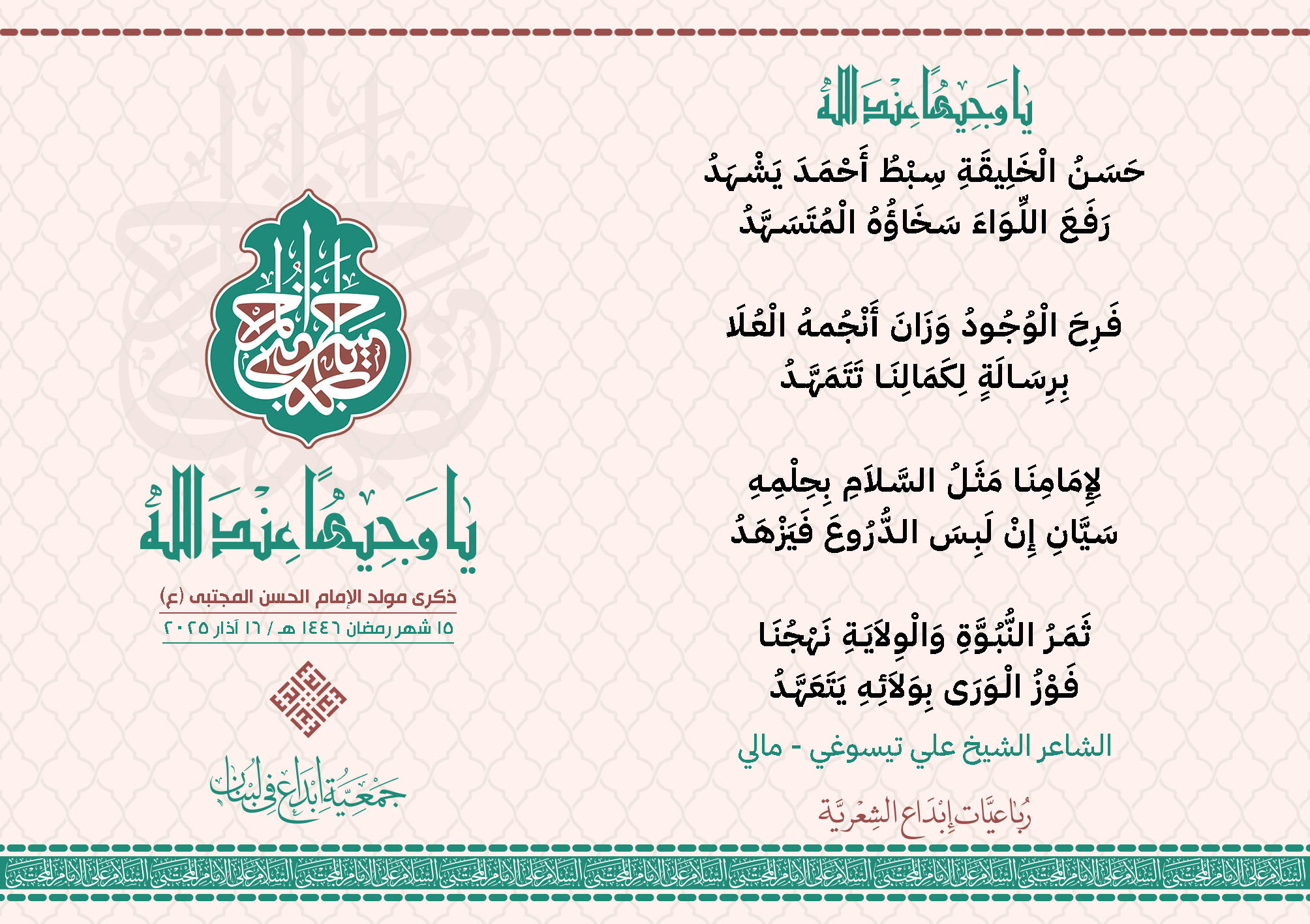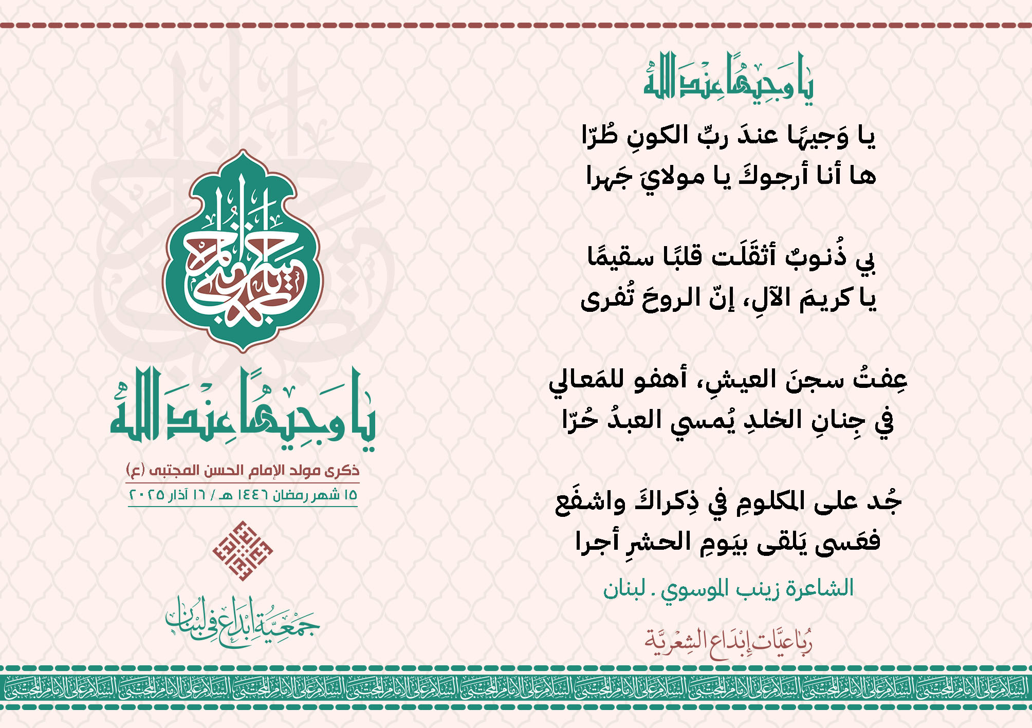 #يا_وجيهاً_عند_الله رباعيات #إبداع الشعرية مولد الإمام #المجتبى (ع) المشاركون في الحملة : 1. الشاعر السيد الحتاني ـ لبنان 2. الشاعر الشيخ علي تيسوغي - مالي 3. الشاعر داوود ال عبد الرسول السماوي ـ العراق 4. الشاعر راضي الفريجي ـ العراق 5. الشاعر عباس السيد حسين ـ لبنان 6. الشاعر عقيل اللواتي ـ سلطنة عُمان 7. الشاعر علي محمد طاهر الصفار ـ العراق 8. الشاعر فايز دقدوق ـ لبنان 9. الشاعر فضل سرور ـ لبنان 10. الشاعر مثيل جبار الزيدي ـ العراق 11. الشاعر محمد علي محمد مهدي السماوي ـ العراق 12. الشاعر محمود شور ـ لبنان 13. الشاعر معن عبد الإله محسن ـ العراق 14. الشاعر ياسين كنعان ـ لبنان 15. الشاعرة آمنه محمد علي السماوي ـ العراق 16. الشاعرة ذكرى الراشدي ـ اليمن 17. الشاعرة زينب الموسوي ـ لبنان 18. الشاعرة سارة اليتامى ـ لبنان 19. الشاعرة سكينة سويدان ـ لبنان 20. الشاعرة غدير نعيم ـ لبنان 21. الشاعرة فاطمة أيوب ـ لبنان 22. الشاعرة مريم عبيد ـ لبنان 23. الشاعرة ناديا الحقاني ـ لبنان 24. الشاعرة نبال رعد ـ لبنان 25. الشاعرة نور مصطفى لمع ـ لبنان 16/3/2025