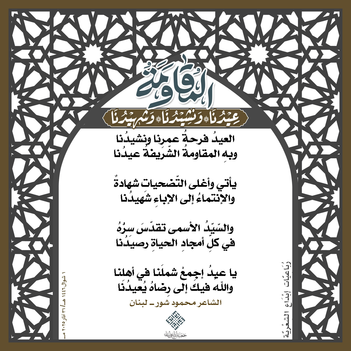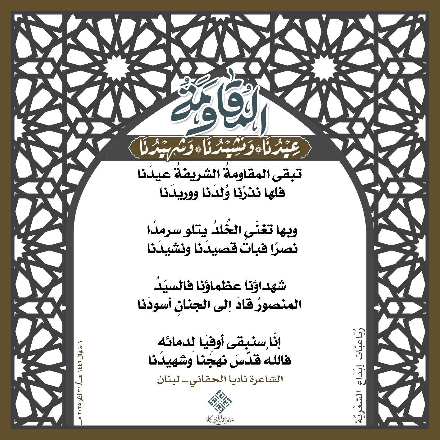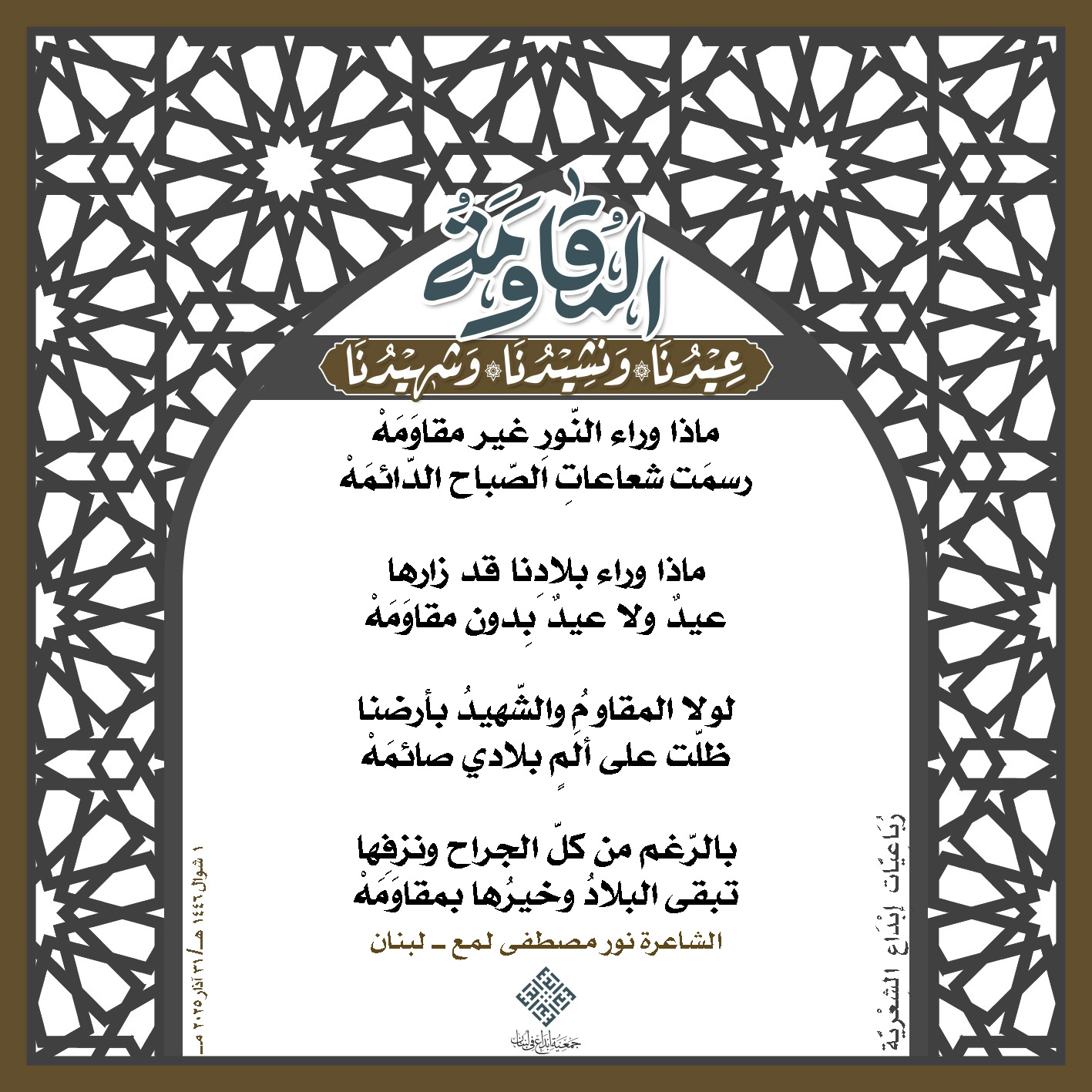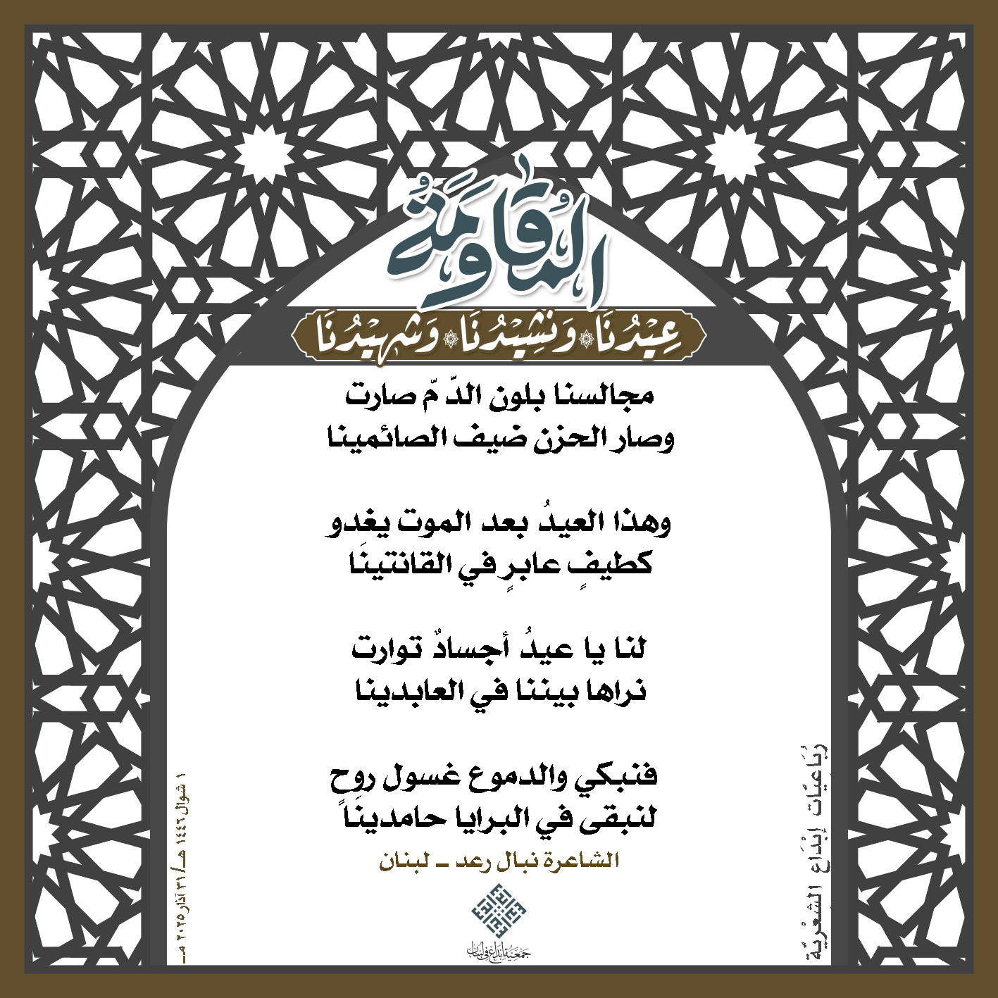 رباعيات ابداع الشعرية #المقاومة_عيدنا_وشهيدنا بمناسبة عيد الفطر السعيد : المشاركون في الحملة الشعرية : • الشاعرة نور مصطفى لمع ـ لبنان • الشاعرة نبال رعد ـ لبنان • الشاعرة ناديا الحقاني ـ لبنان • الشاعرة مريم عصمان ـ لبنان • الشاعرة غدير نعيم ـ لبنان • الشاعرة سارة اليتامى ـ لبنان • الشاعرة زينب الموسوي ـ لبنان • الشاعرة ذكرى الراشدي ـ اليمن • الشاعرة حوراء حميّة ـ لبنان • الشاعر مهدي خليل البزّال ـ لبنان • الشاعر محمود شور ـ لبنان • الشاعر فراس عبود ـ لبنان • الشاعر فايز دقدوق ـ لبنان • الشاعر علي درويش ـ لبنان • الشاعر حيدر حيال ـ العراق • الشاعر حسن شرف الدين المرتضى ـ اليمن • الشاعر حسن البيومي ـ لبنان • الشاعر الشيخ علي تيسوغي - مالي • الشاعر السيد الحتاني ـ لبنان