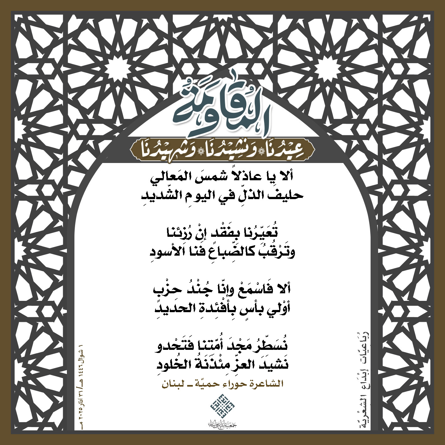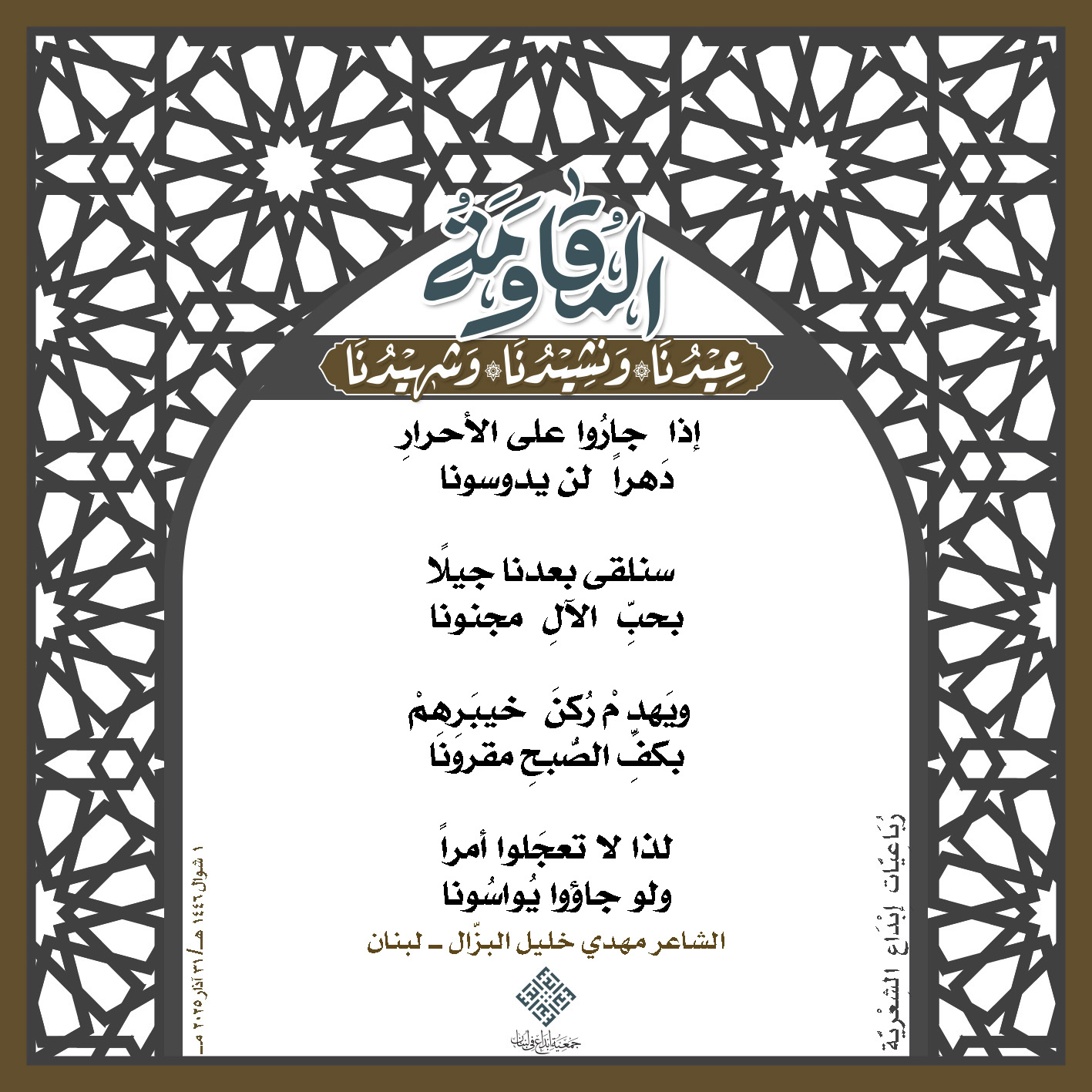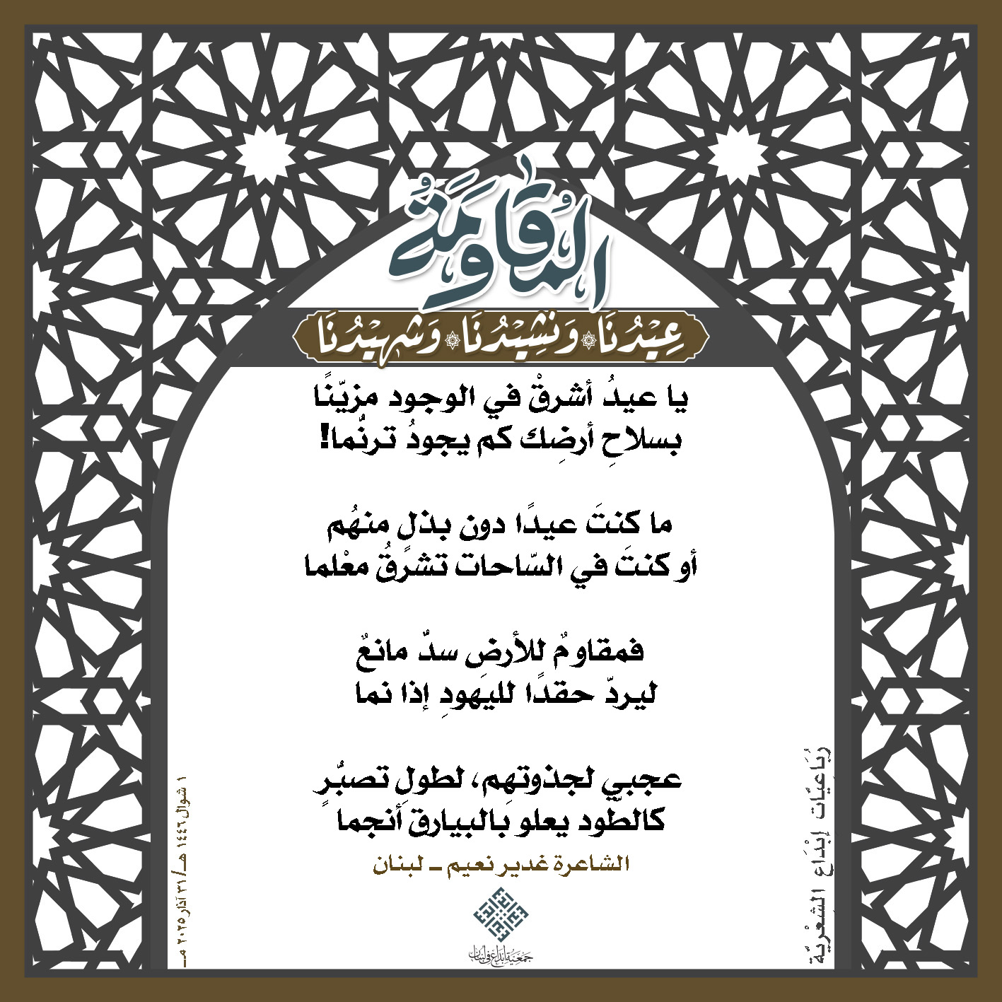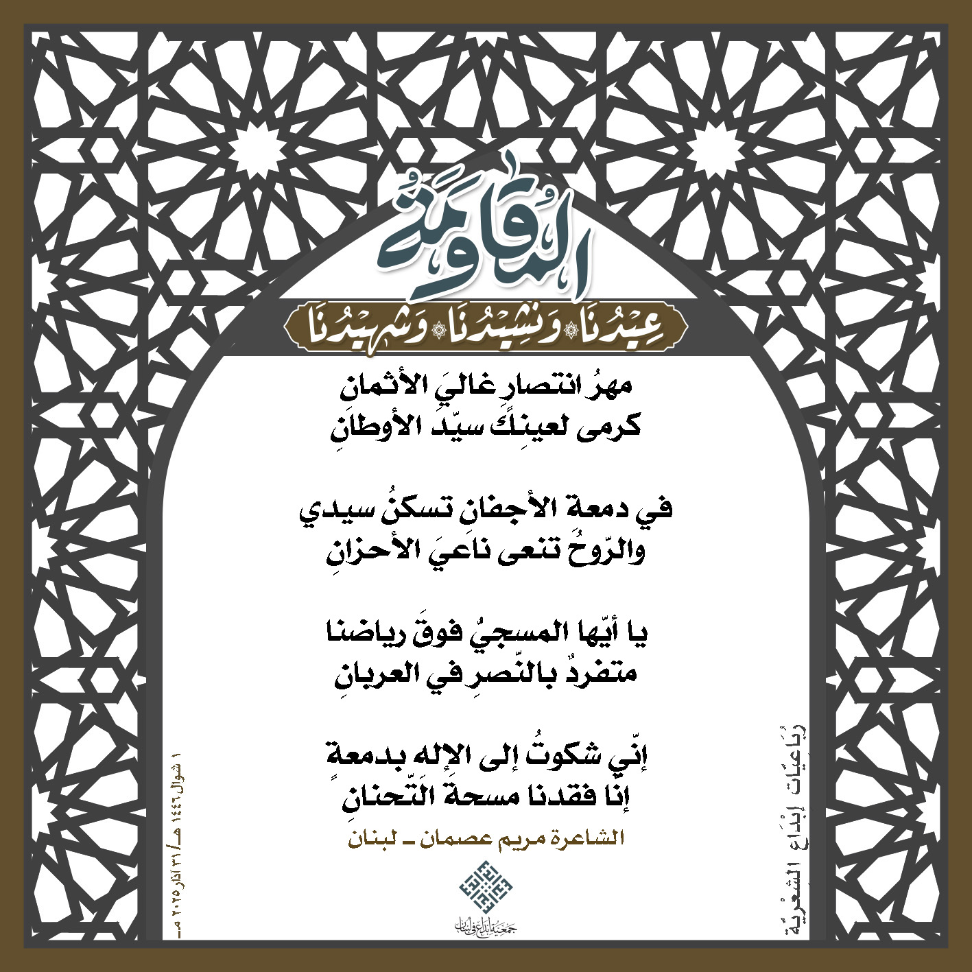رباعيات ابداع الشعرية #المقاومة_عيدنا_وشهيدنا بمناسبة عيد الفطر السعيد : المشاركون في الحملة الشعرية : • الشاعرة نور مصطفى لمع ـ لبنان • الشاعرة نبال رعد ـ لبنان • الشاعرة ناديا الحقاني ـ لبنان • الشاعرة مريم عصمان ـ لبنان • الشاعرة غدير نعيم ـ لبنان • الشاعرة سارة اليتامى ـ لبنان • الشاعرة زينب الموسوي ـ لبنان • الشاعرة ذكرى الراشدي ـ اليمن • الشاعرة حوراء حميّة ـ لبنان • الشاعر مهدي خليل البزّال ـ لبنان • الشاعر محمود شور ـ لبنان • الشاعر فراس عبود ـ لبنان • الشاعر فايز دقدوق ـ لبنان • الشاعر علي درويش ـ لبنان • الشاعر حيدر حيال ـ العراق • الشاعر حسن شرف الدين المرتضى ـ اليمن • الشاعر حسن البيومي ـ لبنان • الشاعر الشيخ علي تيسوغي - مالي • الشاعر السيد الحتاني ـ لبنان