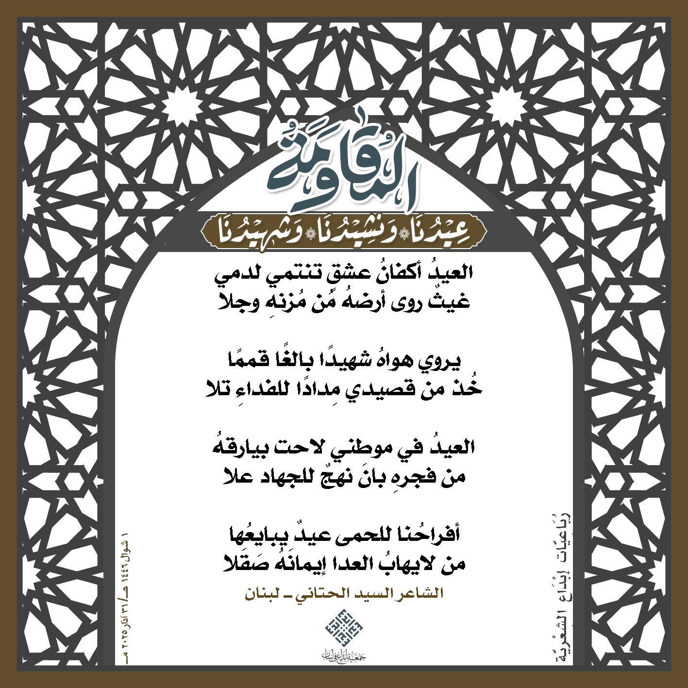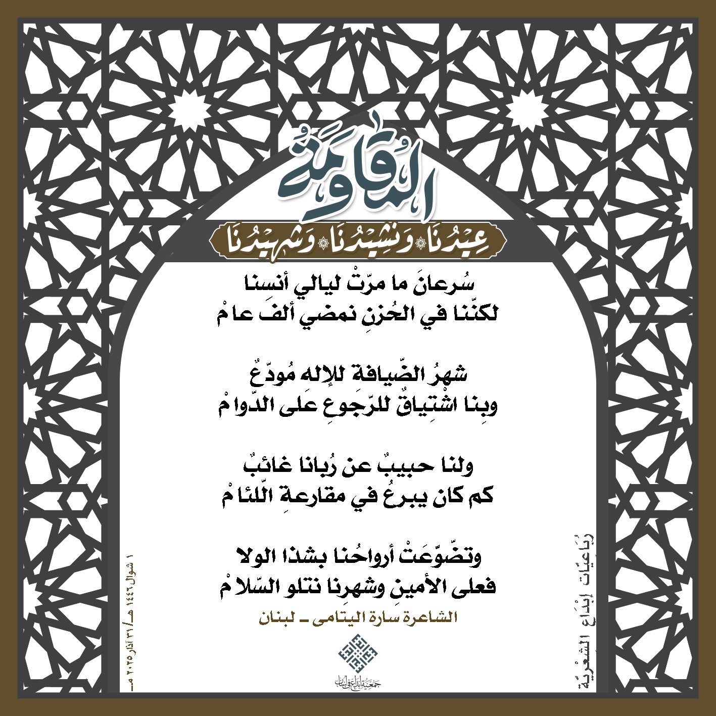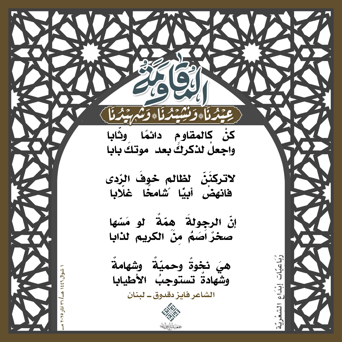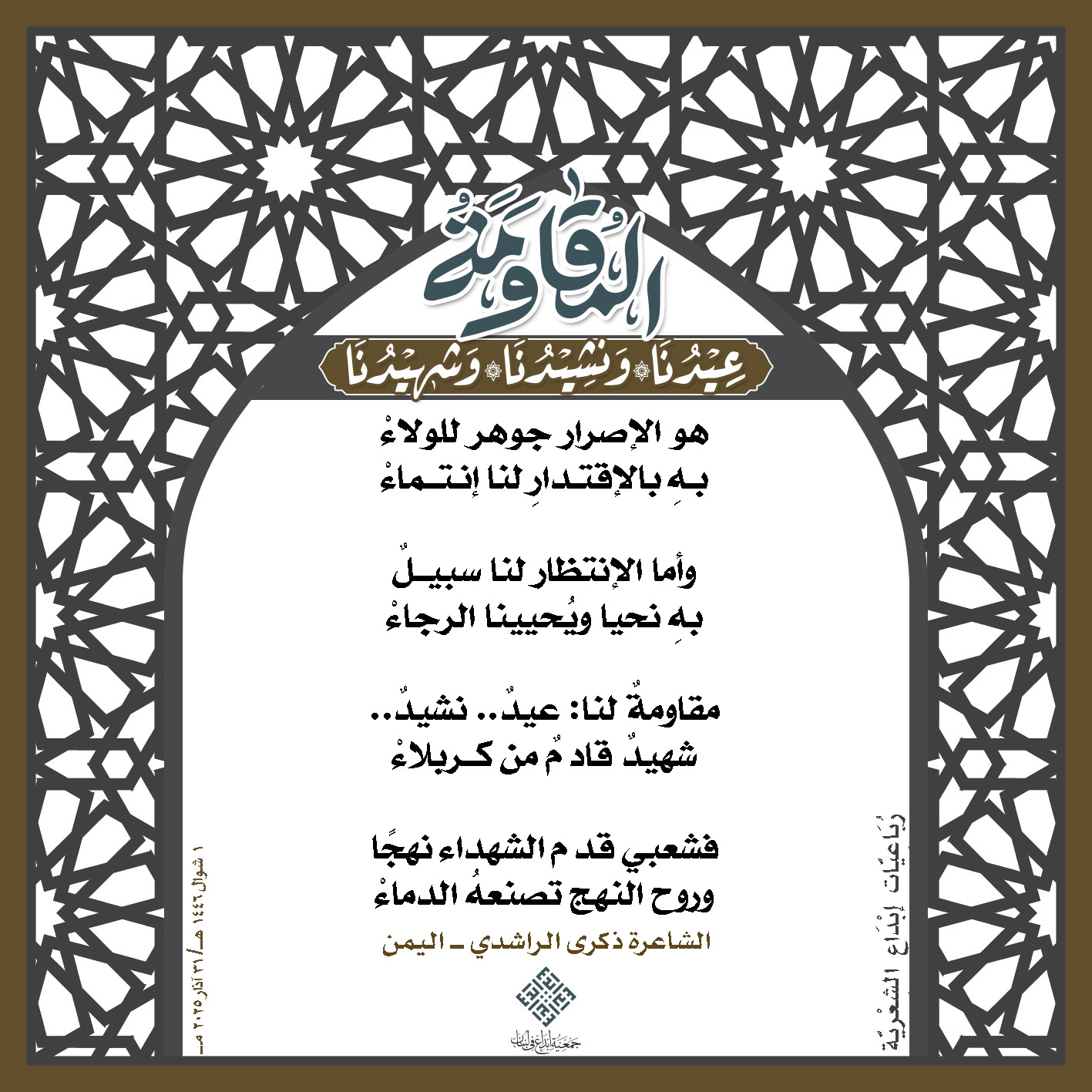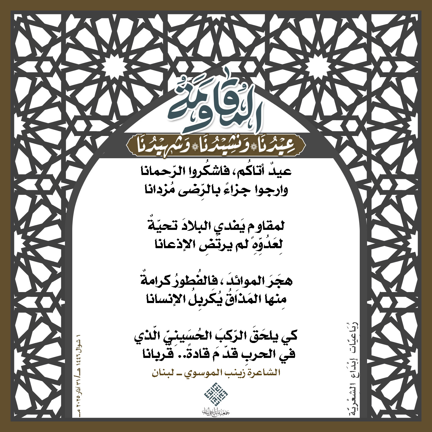 رباعيات ابداع الشعرية #المقاومة_عيدنا_وشهيدنا بمناسبة عيد الفطر السعيد : المشاركون في الحملة الشعرية : • الشاعرة نور مصطفى لمع ـ لبنان • الشاعرة نبال رعد ـ لبنان • الشاعرة ناديا الحقاني ـ لبنان • الشاعرة مريم عصمان ـ لبنان • الشاعرة غدير نعيم ـ لبنان • الشاعرة سارة اليتامى ـ لبنان • الشاعرة زينب الموسوي ـ لبنان • الشاعرة ذكرى الراشدي ـ اليمن • الشاعرة حوراء حميّة ـ لبنان • الشاعر مهدي خليل البزّال ـ لبنان • الشاعر محمود شور ـ لبنان • الشاعر فراس عبود ـ لبنان • الشاعر فايز دقدوق ـ لبنان • الشاعر علي درويش ـ لبنان • الشاعر حيدر حيال ـ العراق • الشاعر حسن شرف الدين المرتضى ـ اليمن • الشاعر حسن البيومي ـ لبنان • الشاعر الشيخ علي تيسوغي - مالي • الشاعر السيد الحتاني ـ لبنان