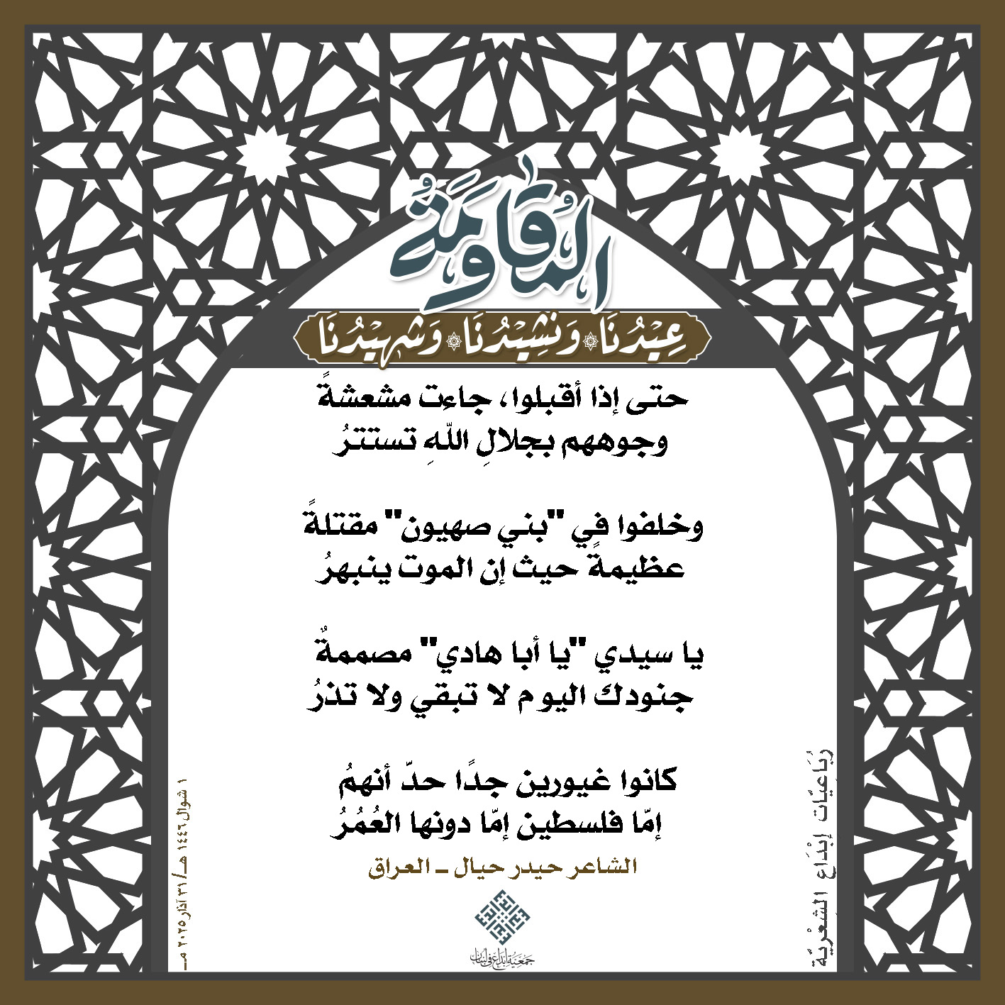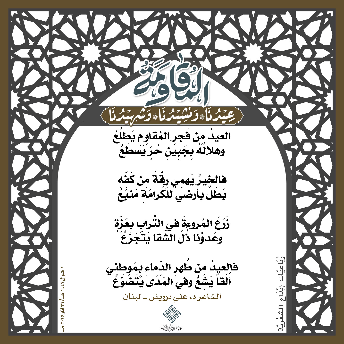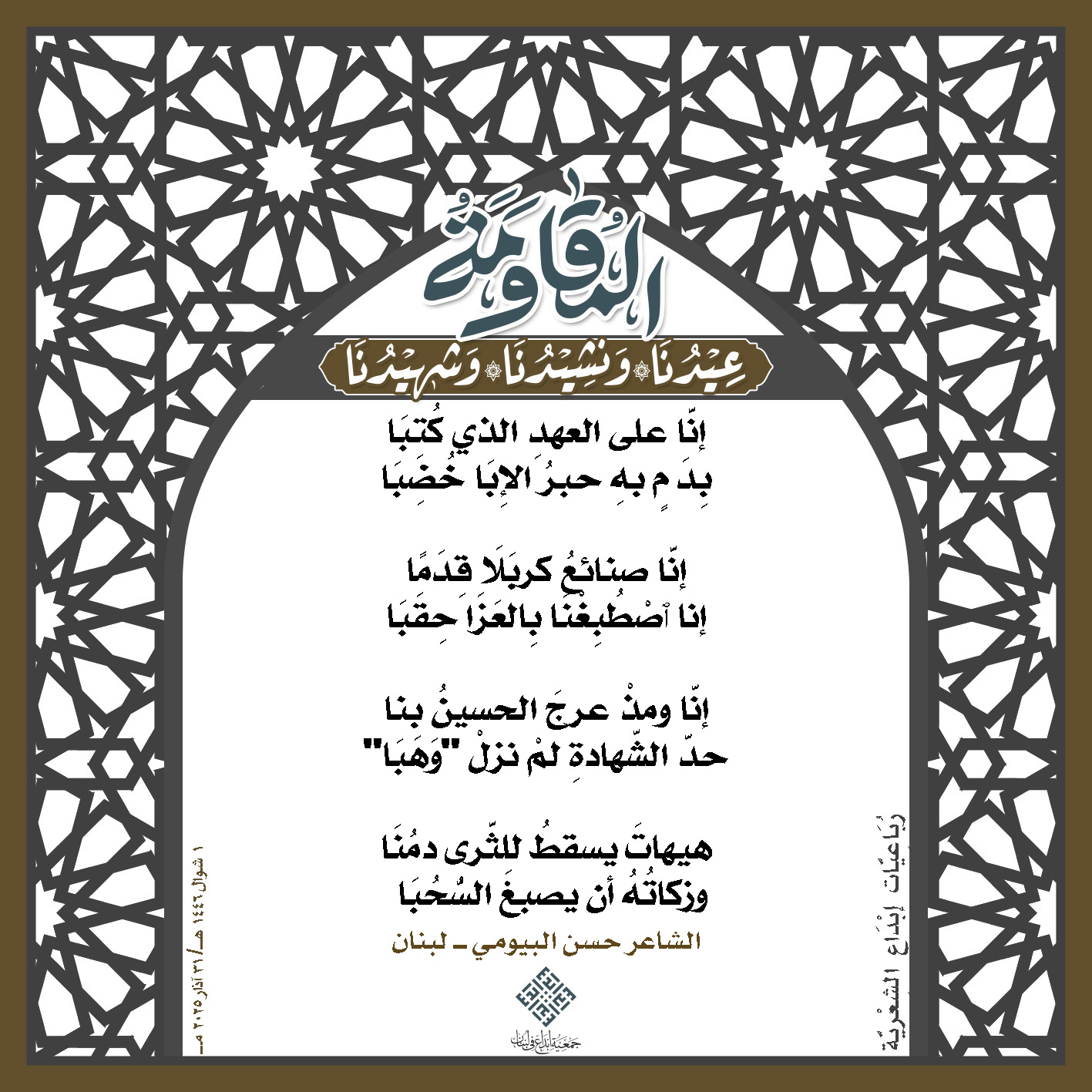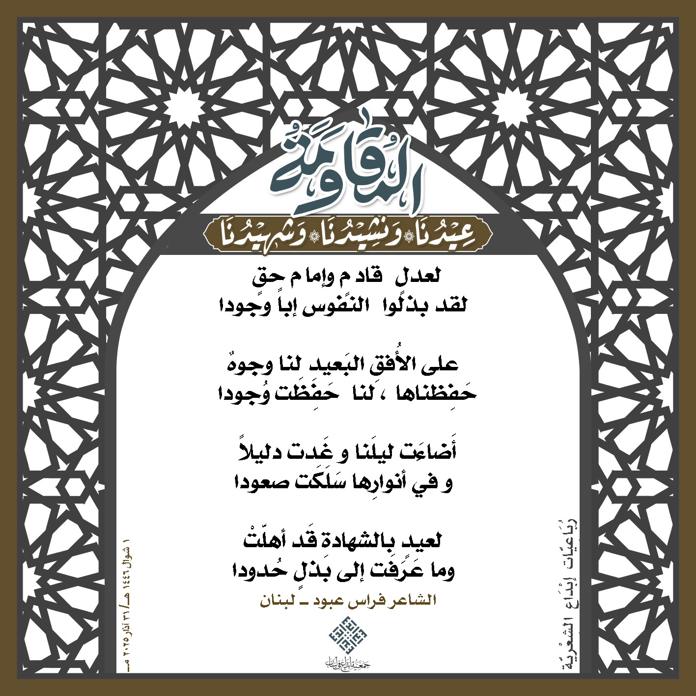 رباعيات ابداع الشعرية #المقاومة_عيدنا_وشهيدنا بمناسبة عيد الفطر السعيد : المشاركون في الحملة الشعرية : • الشاعرة نور مصطفى لمع ـ لبنان • الشاعرة نبال رعد ـ لبنان • الشاعرة ناديا الحقاني ـ لبنان • الشاعرة مريم عصمان ـ لبنان • الشاعرة غدير نعيم ـ لبنان • الشاعرة سارة اليتامى ـ لبنان • الشاعرة زينب الموسوي ـ لبنان • الشاعرة ذكرى الراشدي ـ اليمن • الشاعرة حوراء حميّة ـ لبنان • الشاعر مهدي خليل البزّال ـ لبنان • الشاعر محمود شور ـ لبنان • الشاعر فراس عبود ـ لبنان • الشاعر فايز دقدوق ـ لبنان • الشاعر علي درويش ـ لبنان • الشاعر حيدر حيال ـ العراق • الشاعر حسن شرف الدين المرتضى ـ اليمن • الشاعر حسن البيومي ـ لبنان • الشاعر الشيخ علي تيسوغي - مالي • الشاعر السيد الحتاني ـ لبنان