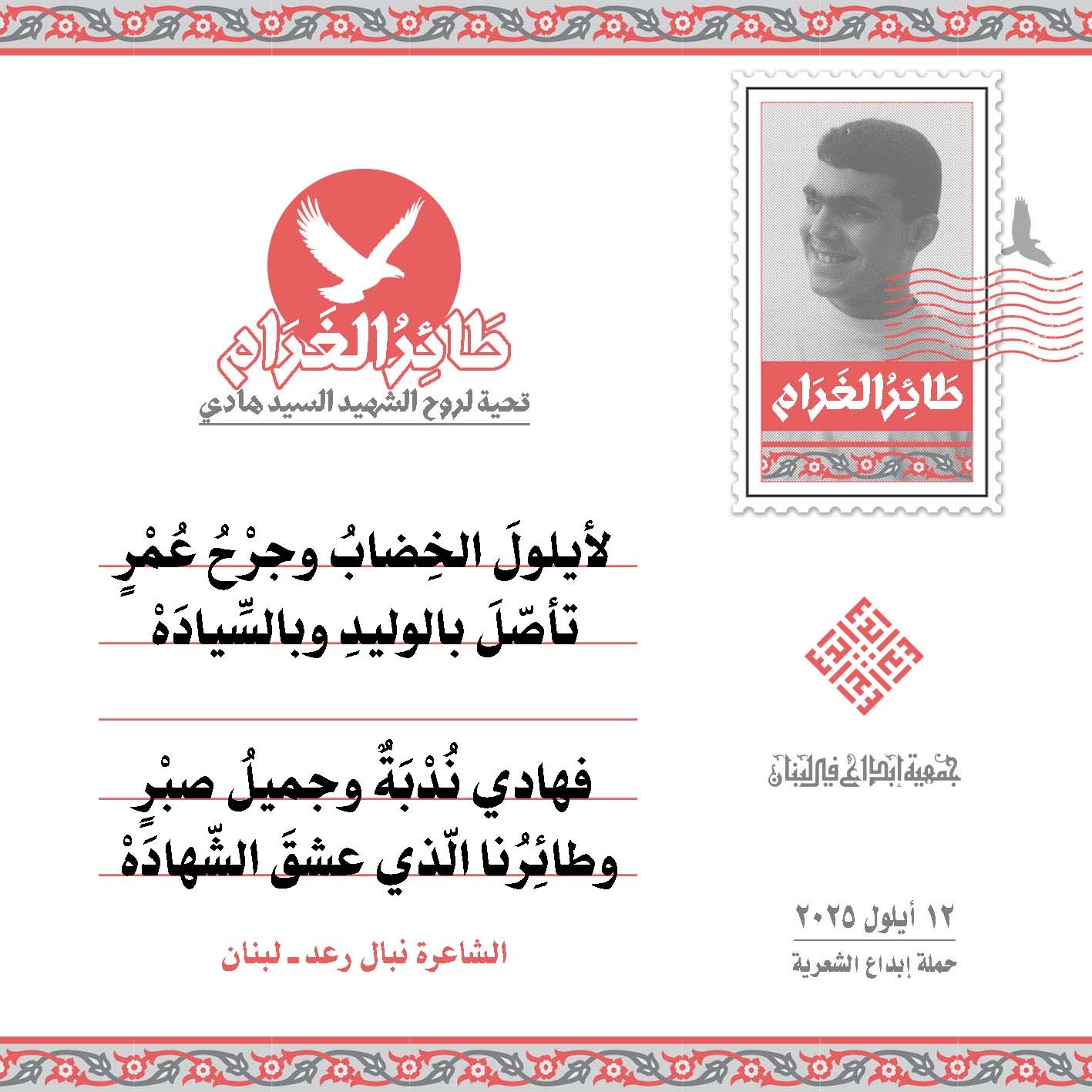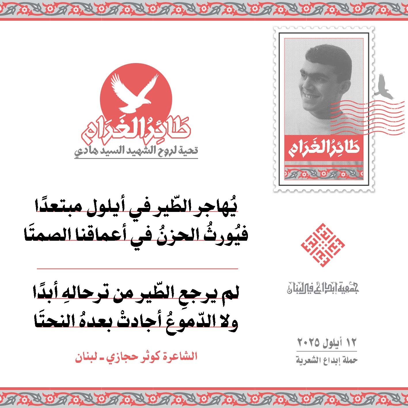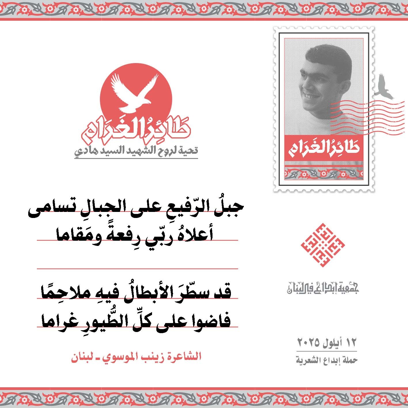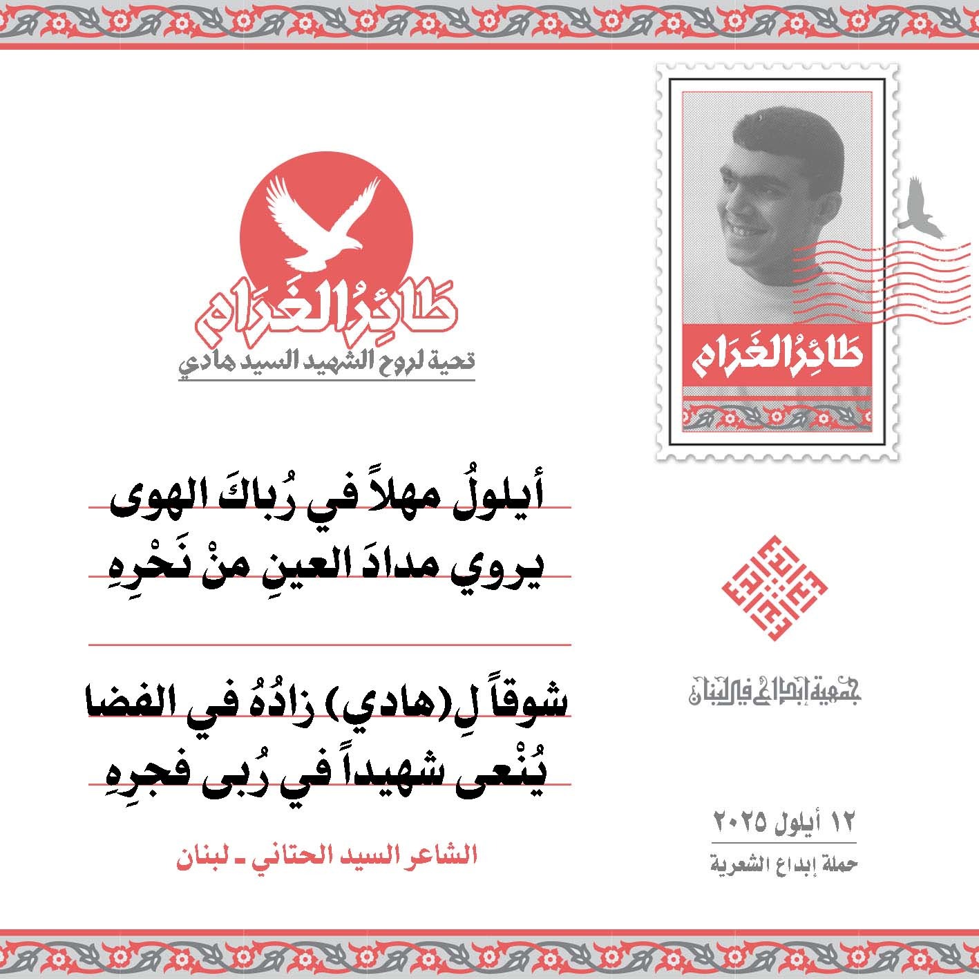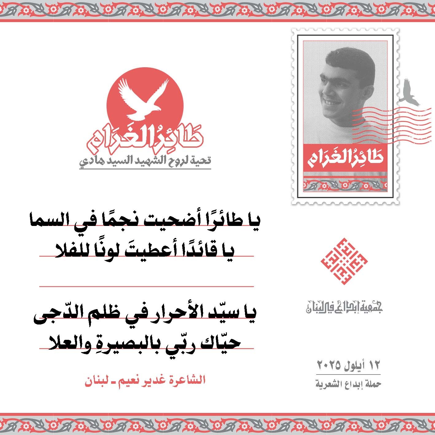 حملة #إبداع الشعرية #طائر_الغرام حملة #إبداع الشعرية #طائر_الغرام في ذكرى استشهاد السيد هادي السيد حسن نصر الله "رضوان الله عليهما" .. المشاركون في الحملة الشعرية : 1. الشاعر السيد الحتاني ـ لبنان 2. الشاعر حيدر حيال ـ العراق 3. الشاعر راضي الفريجي ـ العراق 4. الشاعر فضل سرور ـ لبنان 5. الشاعر محمود شور ـ لبنان 6. الشاعر ياسين كنعان ـ لبنان 7. الشاعرة إسراء لافي عودة ـ لبنان 8. الشاعرة حوراء حميّة ـ لبنان 9. الشاعرة زهراء درويش ـ لبنان 10. الشاعرة زينب الموسوي ـ لبنان 11. الشاعرة سارة اليتامى ـ لبنان 12. الشاعرة غدير نعيم ـ لبنان 13. الشاعرة فاطمة سكاف ـ لبنان 14. الشاعرة كوثر حجازي ـ لبنان 15. الشاعرة مريم عصمان ـ لبنان 16. الشاعرة ناديا الحقاني ـ لبنان 17. الشاعرة نبال رعد ـ لبنان 18. الشاعرة هديل كحيل ـ لبنان #إبداع 12 أيلول 2025 #طائر_الغرام #حملة_شعرية .jpeg)
