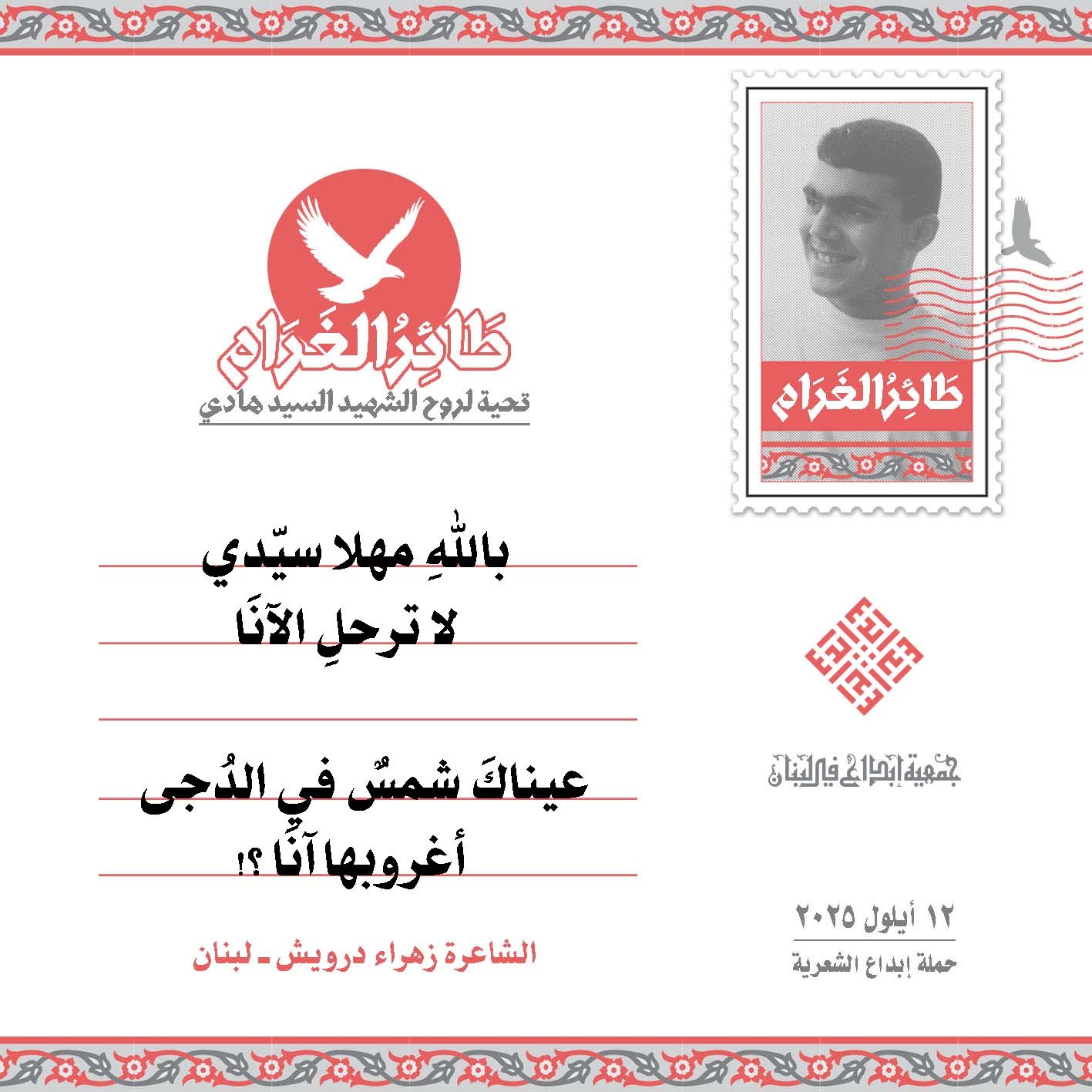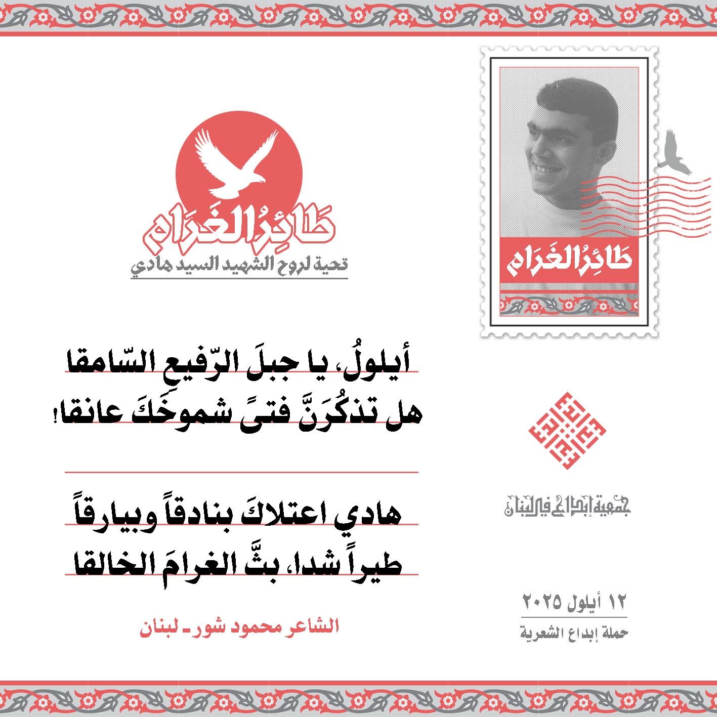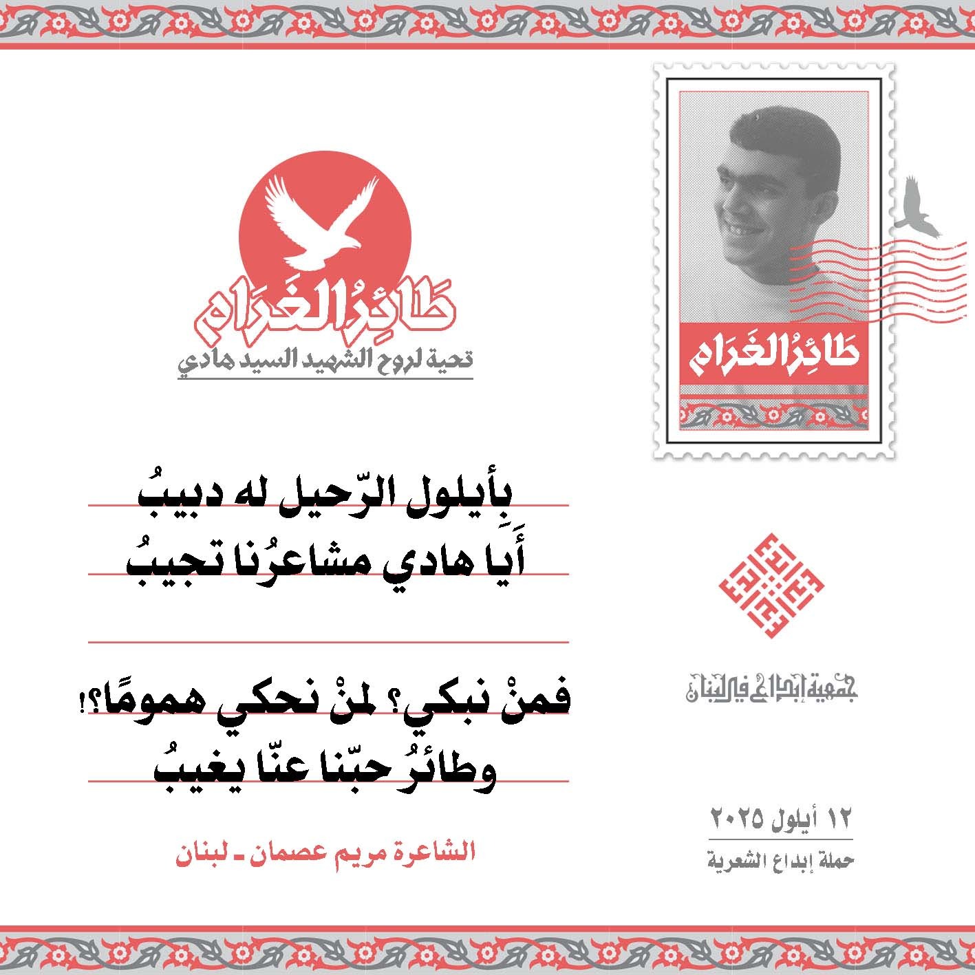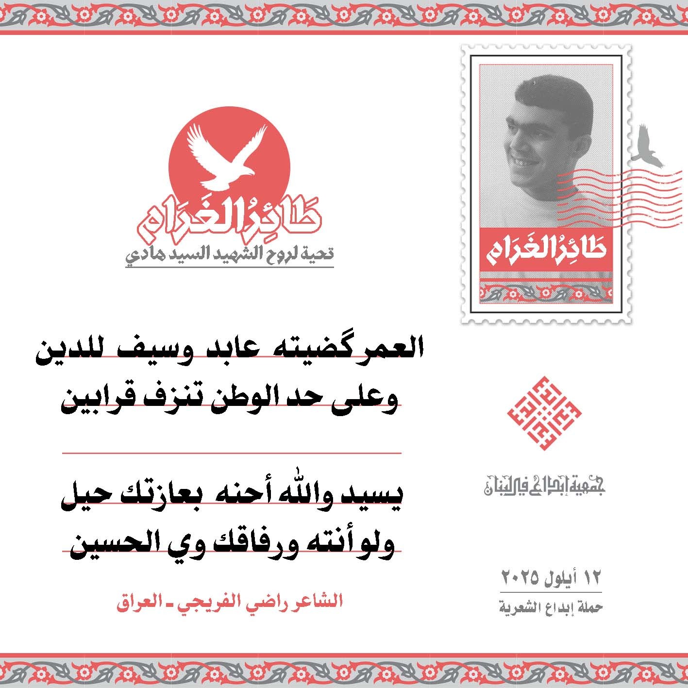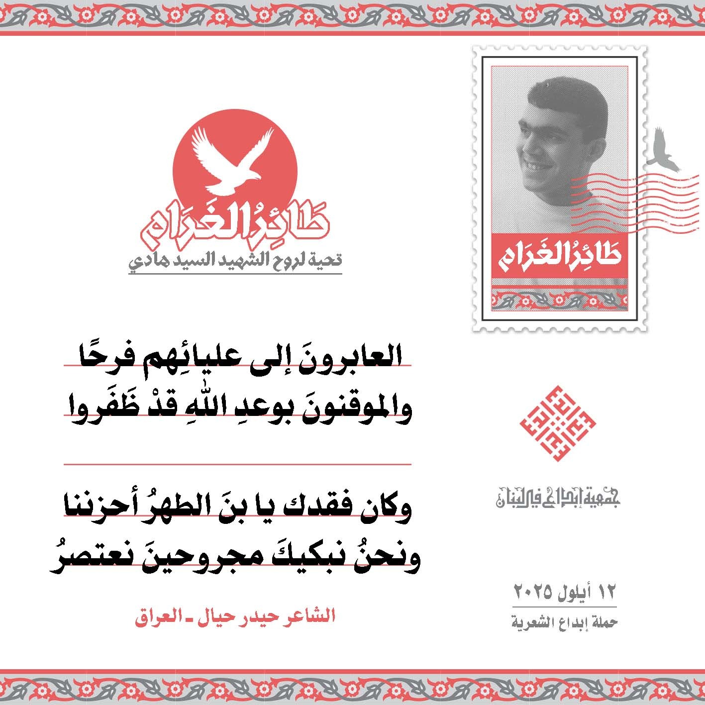حملة #إبداع الشعرية #طائر_الغرام حملة #إبداع الشعرية #طائر_الغرام في ذكرى استشهاد السيد هادي السيد حسن نصر الله "رضوان الله عليهما" .. المشاركون في الحملة الشعرية : 1. الشاعر السيد الحتاني ـ لبنان 2. الشاعر حيدر حيال ـ العراق 3. الشاعر راضي الفريجي ـ العراق 4. الشاعر فضل سرور ـ لبنان 5. الشاعر محمود شور ـ لبنان 6. الشاعر ياسين كنعان ـ لبنان 7. الشاعرة إسراء لافي عودة ـ لبنان 8. الشاعرة حوراء حميّة ـ لبنان 9. الشاعرة زهراء درويش ـ لبنان 10. الشاعرة زينب الموسوي ـ لبنان 11. الشاعرة سارة اليتامى ـ لبنان 12. الشاعرة غدير نعيم ـ لبنان 13. الشاعرة فاطمة سكاف ـ لبنان 14. الشاعرة كوثر حجازي ـ لبنان 15. الشاعرة مريم عصمان ـ لبنان 16. الشاعرة ناديا الحقاني ـ لبنان 17. الشاعرة نبال رعد ـ لبنان 18. الشاعرة هديل كحيل ـ لبنان #إبداع 12 أيلول 2025 #طائر_الغرام #حملة_شعرية .jpeg)