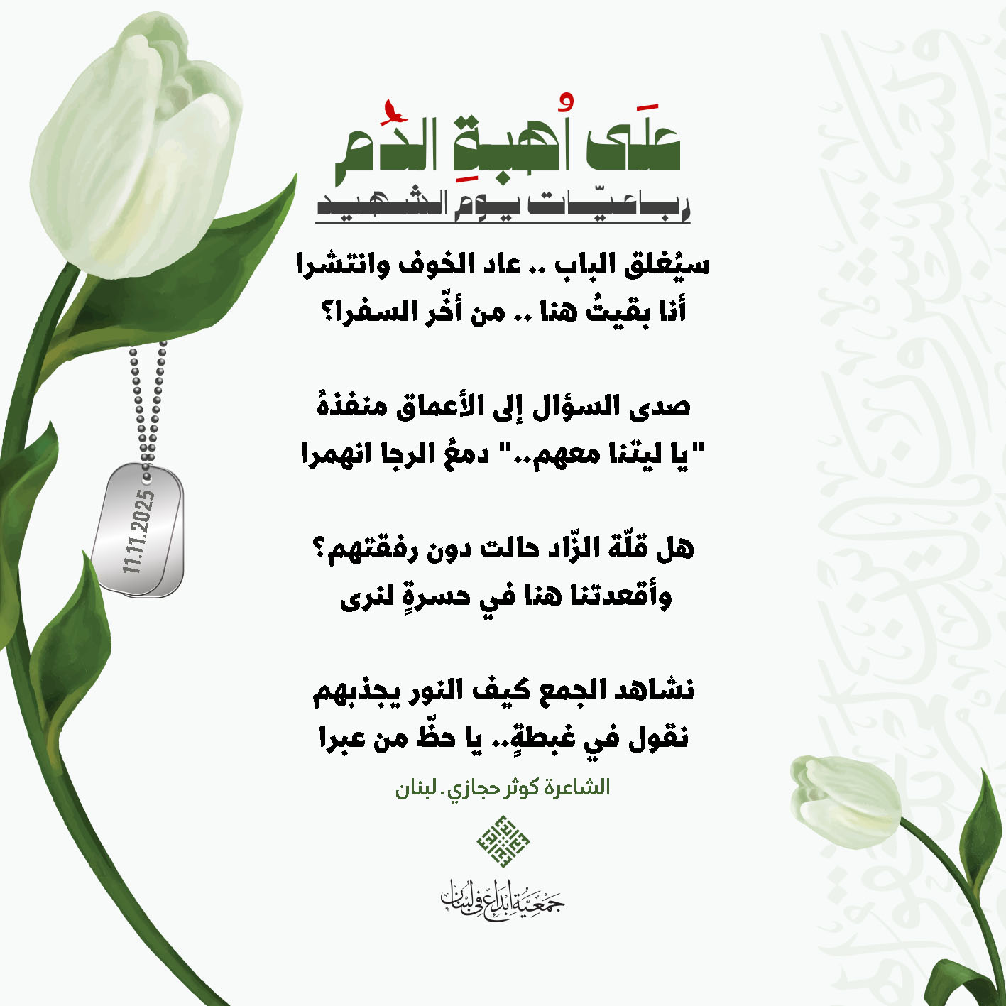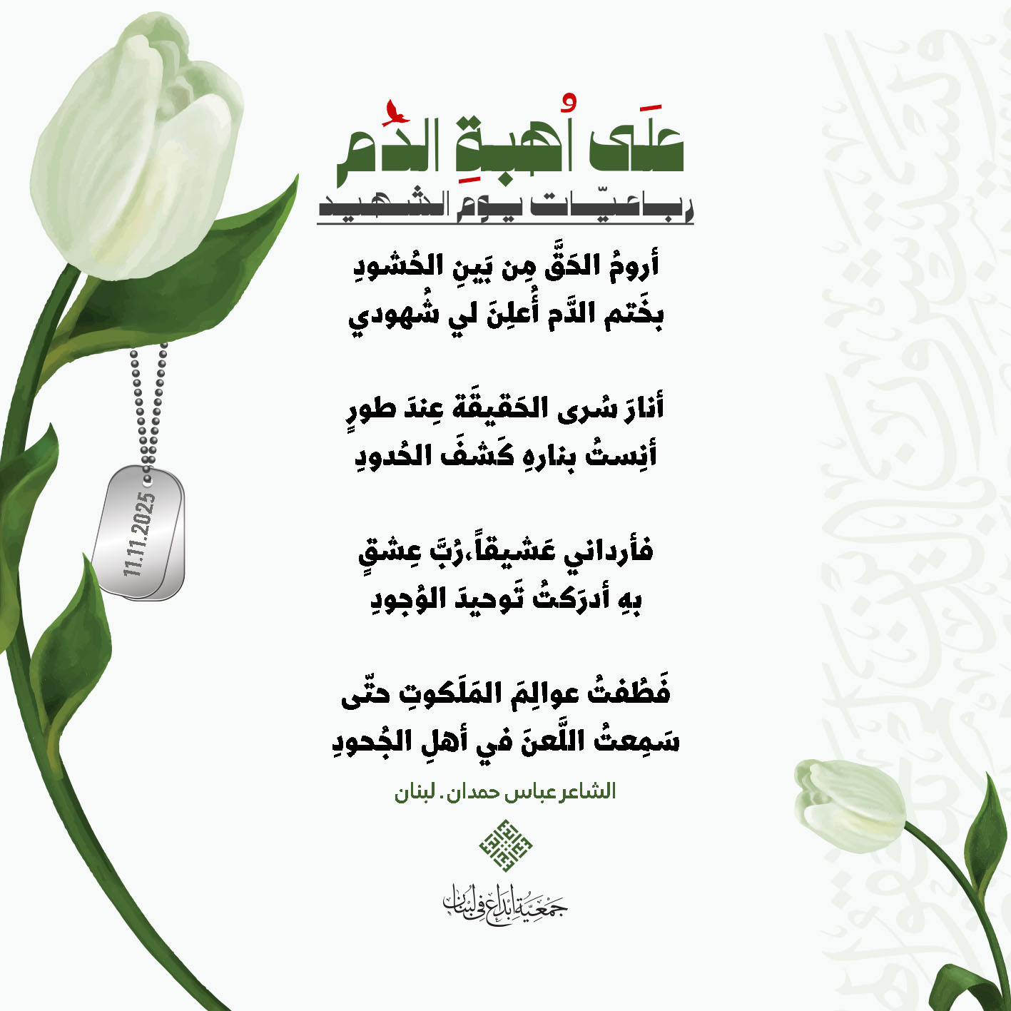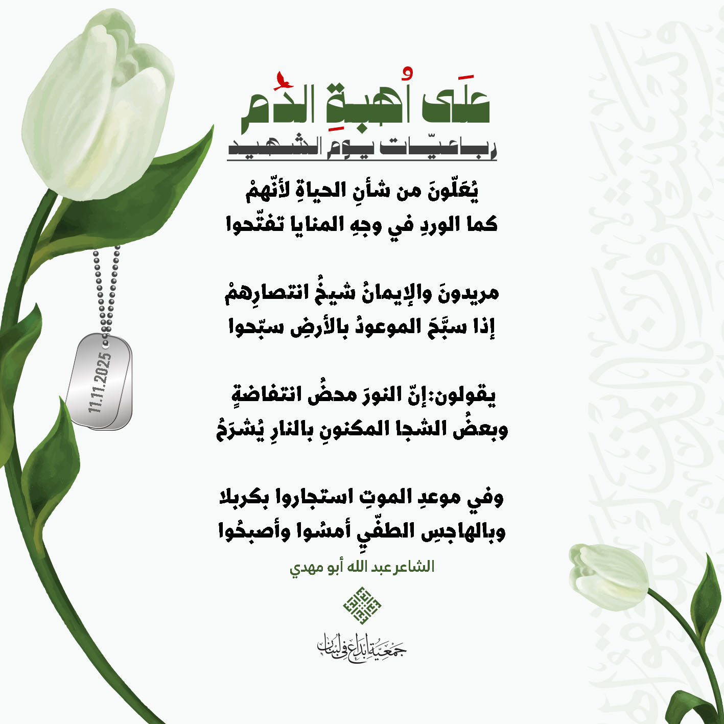 #على_اُهبة_الدم رباعيات #إبداع الشعرية #يوم_الشهيد المشاركون في الرباعيات : 1. الشاعرة هناء إبراهيم ـ لبنان 2. الشاعرة نور مصطفى لمع ـ لبنان 3. الشاعرة نبال رعد ـ لبنان 4. الشاعرة ناديا الحقاني ـ لبنان 5. الشاعرة منال يوسف ـ لبنان 6. الشاعرة مريم عصمان ـ لبنان 7. الشاعرة كوثر حجازي ـ لبنان 8. الشاعرة فاطمة السحمراني ـ لبنان 9. الشاعرة سكينة سويدان ـ لبنان 10. الشاعرة سارة اليتامى ـ لبنان 11. الشاعرة زينب الموسوي ـ لبنان 12. الشاعرة إسراء لافي عودة ـ لبنان 13. الشاعر مهدي البزّال ـ لبنان 14. الشاعر محمود شور ـ لبنان 15. الشاعر محمد ال عبد الرسول السماوي ـ العراق 16. الشاعر مثيل الزيدي ـ العراق 17. الشاعر فضل سرور ـ لبنان 18. الشاعر علي درويش ـ لبنان 19. الشاعر علي إسماعيل شاهين ـ لبنان 20. الشاعر عبد الله أبو مهدي 21. الشاعر عباس حمدان ـ لبنان 22. الشاعر أمير موسى السماوي ـ العراق 23. الشاعر أحمد غالب سرحان ـ لبنان 24. الشاعر أحمد علي أحمد ـ لبنان 25. الشاعر السيد الحتاني ـ لبنان 10/11/2025