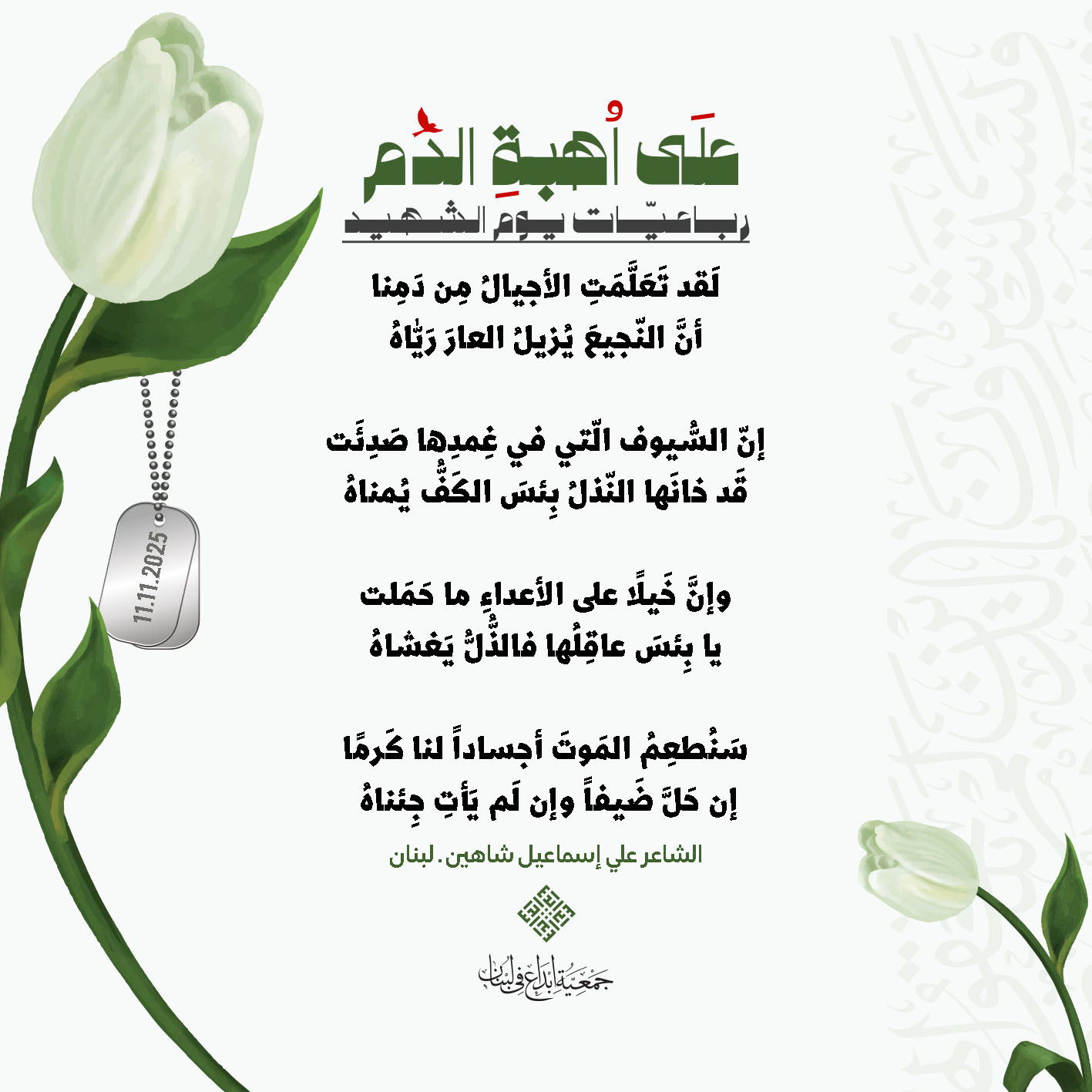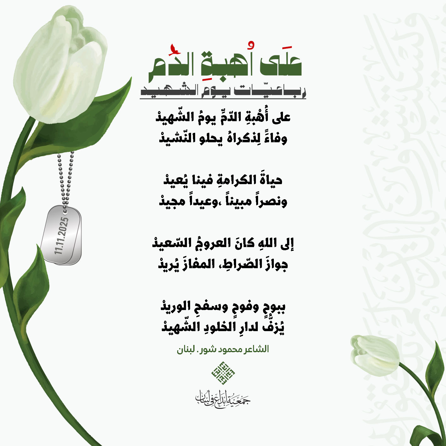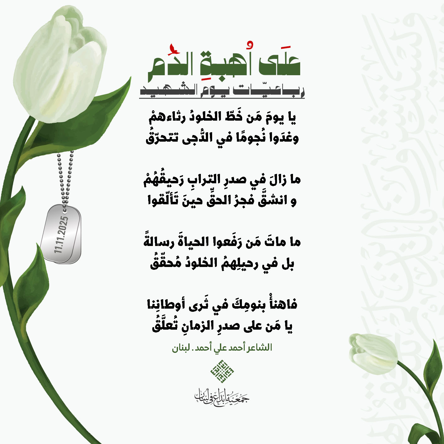 #على_اُهبة_الدم رباعيات #إبداع الشعرية #يوم_الشهيد المشاركون في الرباعيات : 1. الشاعرة هناء إبراهيم ـ لبنان 2. الشاعرة نور مصطفى لمع ـ لبنان 3. الشاعرة نبال رعد ـ لبنان 4. الشاعرة ناديا الحقاني ـ لبنان 5. الشاعرة منال يوسف ـ لبنان 6. الشاعرة مريم عصمان ـ لبنان 7. الشاعرة كوثر حجازي ـ لبنان 8. الشاعرة فاطمة السحمراني ـ لبنان 9. الشاعرة سكينة سويدان ـ لبنان 10. الشاعرة سارة اليتامى ـ لبنان 11. الشاعرة زينب الموسوي ـ لبنان 12. الشاعرة إسراء لافي عودة ـ لبنان 13. الشاعر مهدي البزّال ـ لبنان 14. الشاعر محمود شور ـ لبنان 15. الشاعر محمد ال عبد الرسول السماوي ـ العراق 16. الشاعر مثيل الزيدي ـ العراق 17. الشاعر فضل سرور ـ لبنان 18. الشاعر علي درويش ـ لبنان 19. الشاعر علي إسماعيل شاهين ـ لبنان 20. الشاعر عبد الله أبو مهدي 21. الشاعر عباس حمدان ـ لبنان 22. الشاعر أمير موسى السماوي ـ العراق 23. الشاعر أحمد غالب سرحان ـ لبنان 24. الشاعر أحمد علي أحمد ـ لبنان 25. الشاعر السيد الحتاني ـ لبنان 10/11/2025