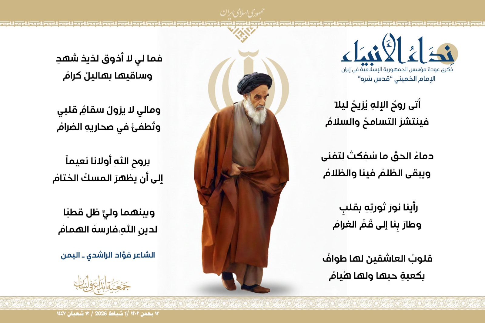 #نداء_الأنبياء #نداء_الأنبياء حملة #إبداع الشعرية في ذكرى عودة الإمام الخميني الراحل إلى #إيران وبداية #عشرة_الفجر لانتصار الثورة الإسلامية في إيران .. شارك في الحملة كل من : 1. الشاعر داوود ال عبد الرسول السماوي ـ العراق 2. الشاعر علي درويش ـ لبنان 3. الشاعر فؤاد الراشدي ـ اليمن 4. الشاعر محمود شور ـ لبنان 5. الشاعر معن عبد الإله محسن ـ العراق 6. الشاعر مهدي البزّال ـ لبنان 7. الشاعرة زهراء درويش ـ لبنان 8. الشاعرة زينب الموسوي ـ لبنان 9. الشاعرة زينب فياض ـ لبنان 10. الشاعرة مريم عصمان ـ لبنان 11. الشاعرة ناديا الحقاني ـ لبنان 12. الشاعرة هناء إبراهيم ـ لبنان #إبداع #نداء_الأنبياء #عودة_الإمام #إيران أول شباط 2026 ......