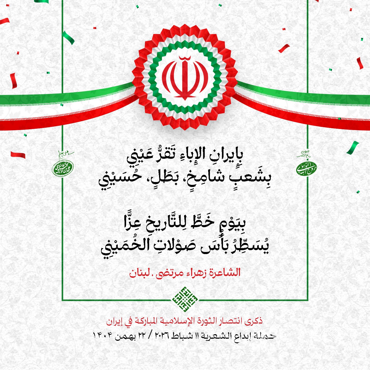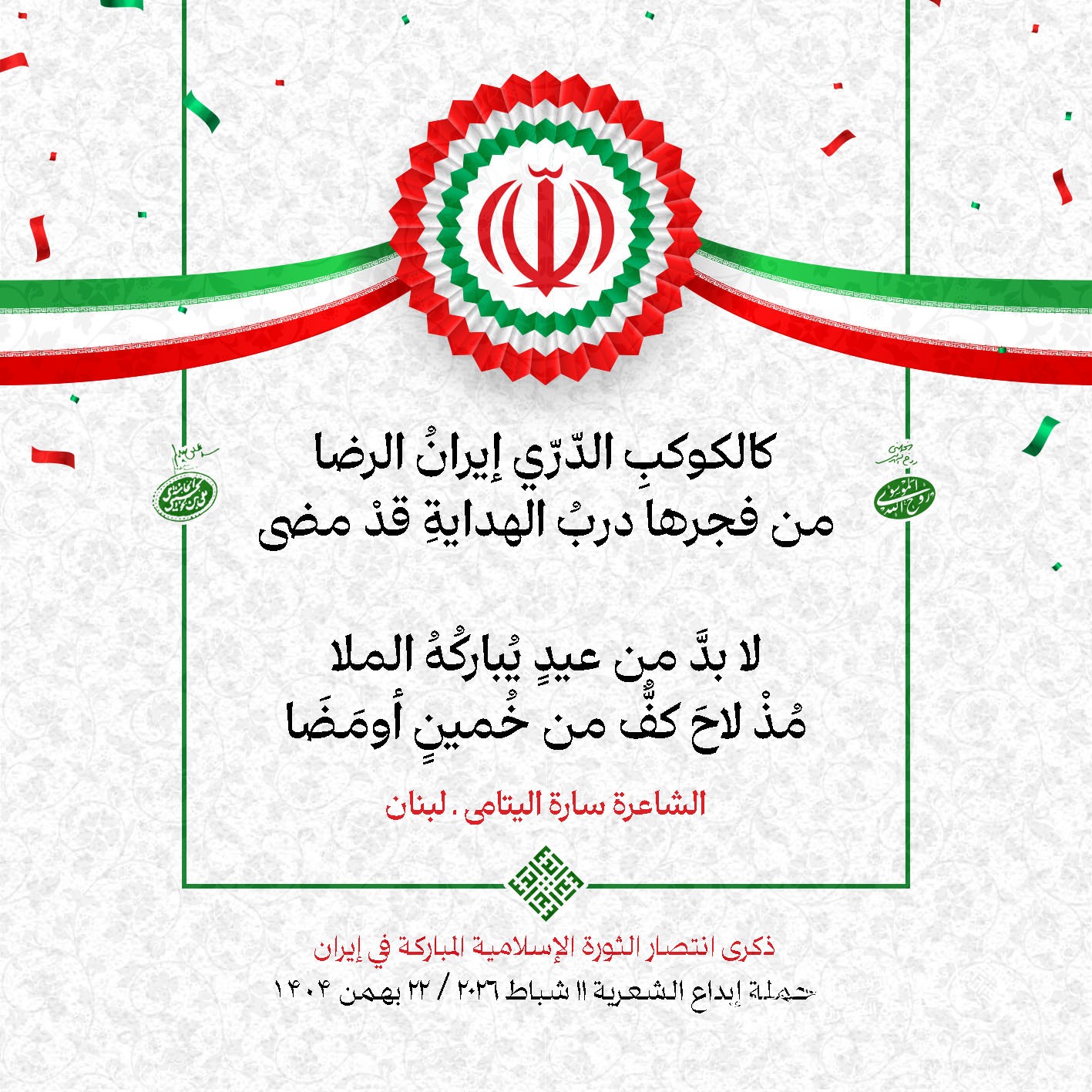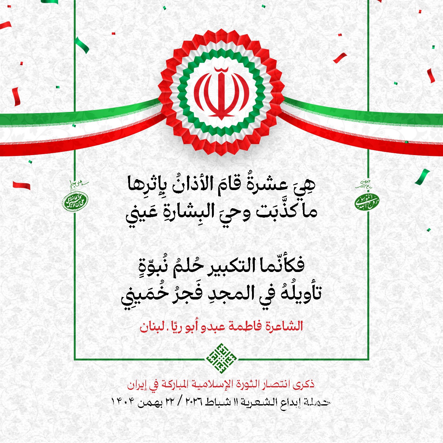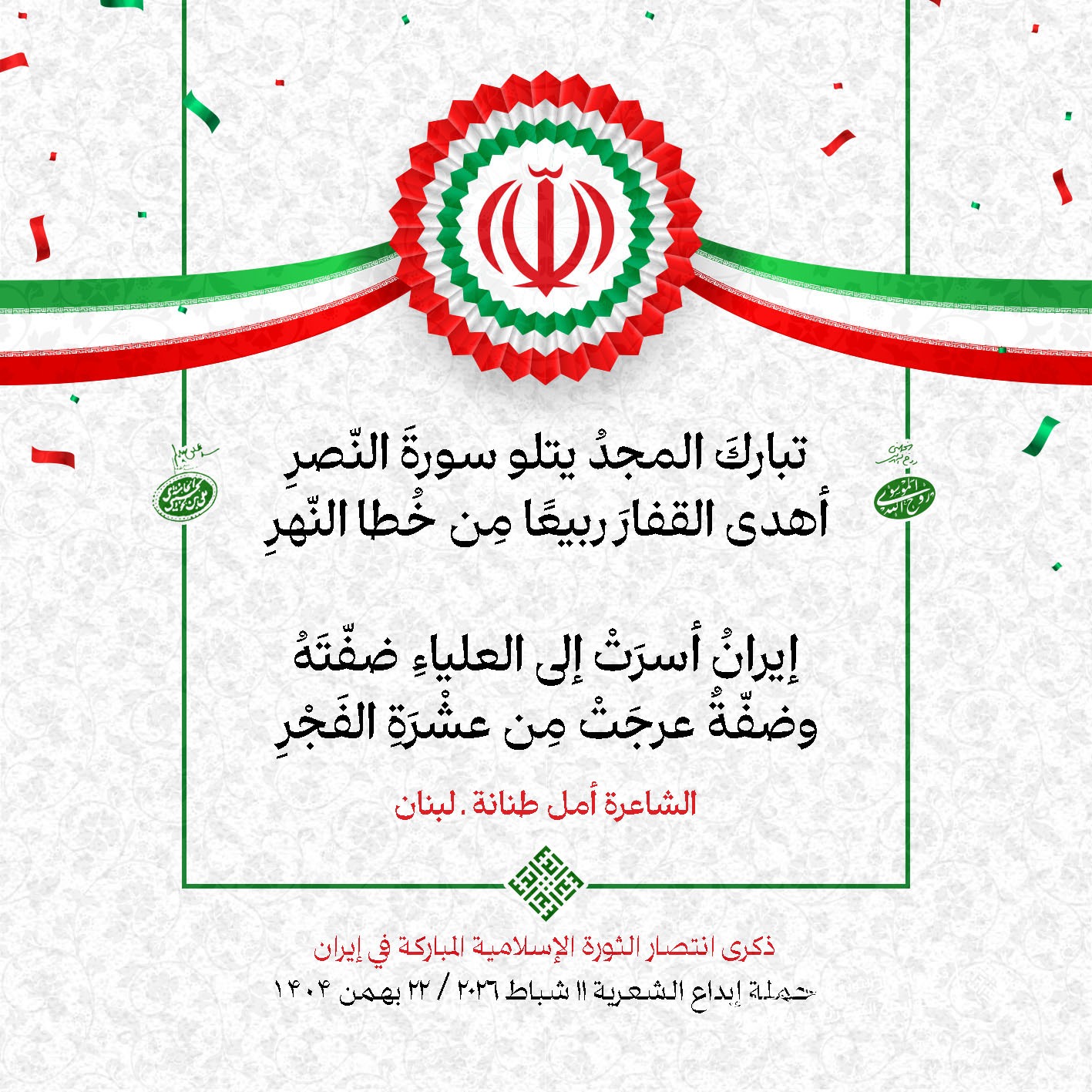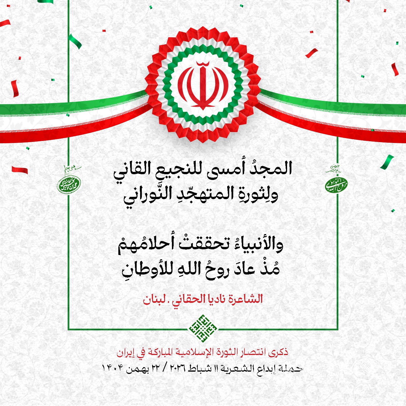 #تبريكات_انتصار_الثورة لمناسبة ذكرى انتصار الثورة الإسلامية في #إيران أطلقت جمعية إبداع في #لبنان حملة شعرية عشية الإنتصار المبارك . وقد شارك في الحملة شعراء وشاعرات من لبنان واليمن والعراق : 1. الشاعر السيد الحتاني ـ لبنان 2. الشاعر الشيخ حسين فقيه ـ لبنان 3. الشاعر الشيخ رضوان الزبيدي ـ العراق 4. الشاعر أحمد غالب سرحان ـ لبنان 5. الشاعر حيدر حيال ـ العراق 6. الشاعر راضي الفريجي ـ العراق 7. الشاعر علي أسامة الحاج دياب ـ لبنان 8. الشاعر علي درويش ـ لبنان 9. الشاعر فؤاد الراشدي ـ اليمن 10. الشاعر محمود شور ـ لبنان 11. الشاعر معن عبد الإله محسن ـ العراق 12. الشاعر مهدي البزّال ـ لبنان 13. الشاعرة أمل سرور ـ لبنان 14. الشاعرة أمل طنانة ـ لبنان 15. الشاعرة حوراء جشي ـ لبنان 16. الشاعرة حوراء مرتضى ـ لبنان 17. الشاعرة زهراء درويش ـ لبنان 18. الشاعرة زهراء مرتضى ـ لبنان 19. الشاعرة زينب الموسوي ـ لبنان 20. الشاعرة سارة اليتامى ـ لبنان 21. الشاعرة سكينة سويدان ـ لبنان 22. الشاعرة عزيزة جميل ـ لبنان 23. الشاعرة غدير نعيم ـ لبنان 24. الشاعرة فاطمة السحمراني ـ لبنان 25. الشاعرة فاطمة عبدو أبو ريّا ـ لبنان 26. الشاعرة كوثر حجازي ـ لبنان 27. الشاعرة مريم عبيد ـ لبنان 28. الشاعرة مريم عصمان ـ لبنان 29. الشاعرة ناديا الحقاني ـ لبنان 30. الشاعرة نبال رعد ـ لبنان #إبداع 11 شباط 2026 #حملة_شعرية #إيران .jpeg)