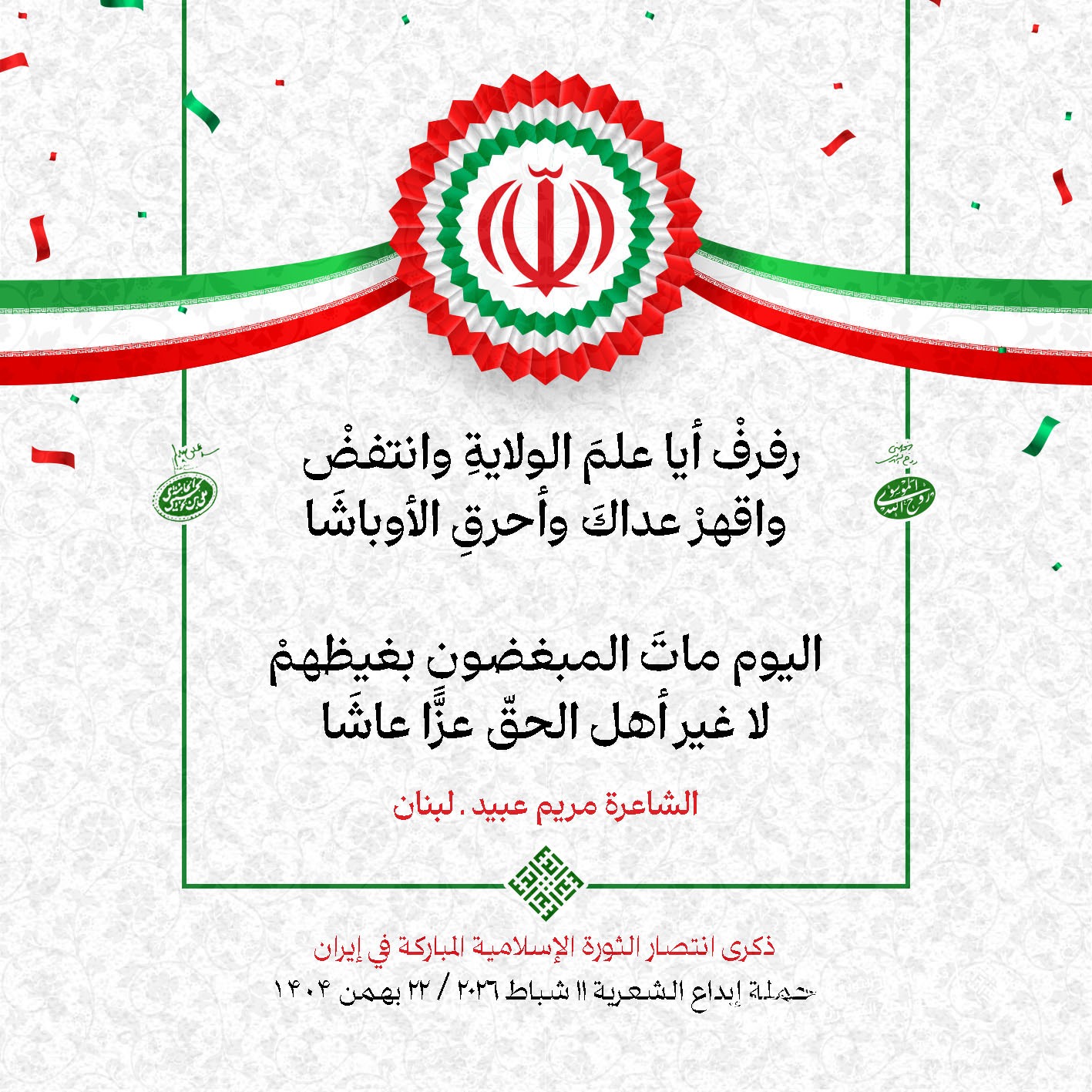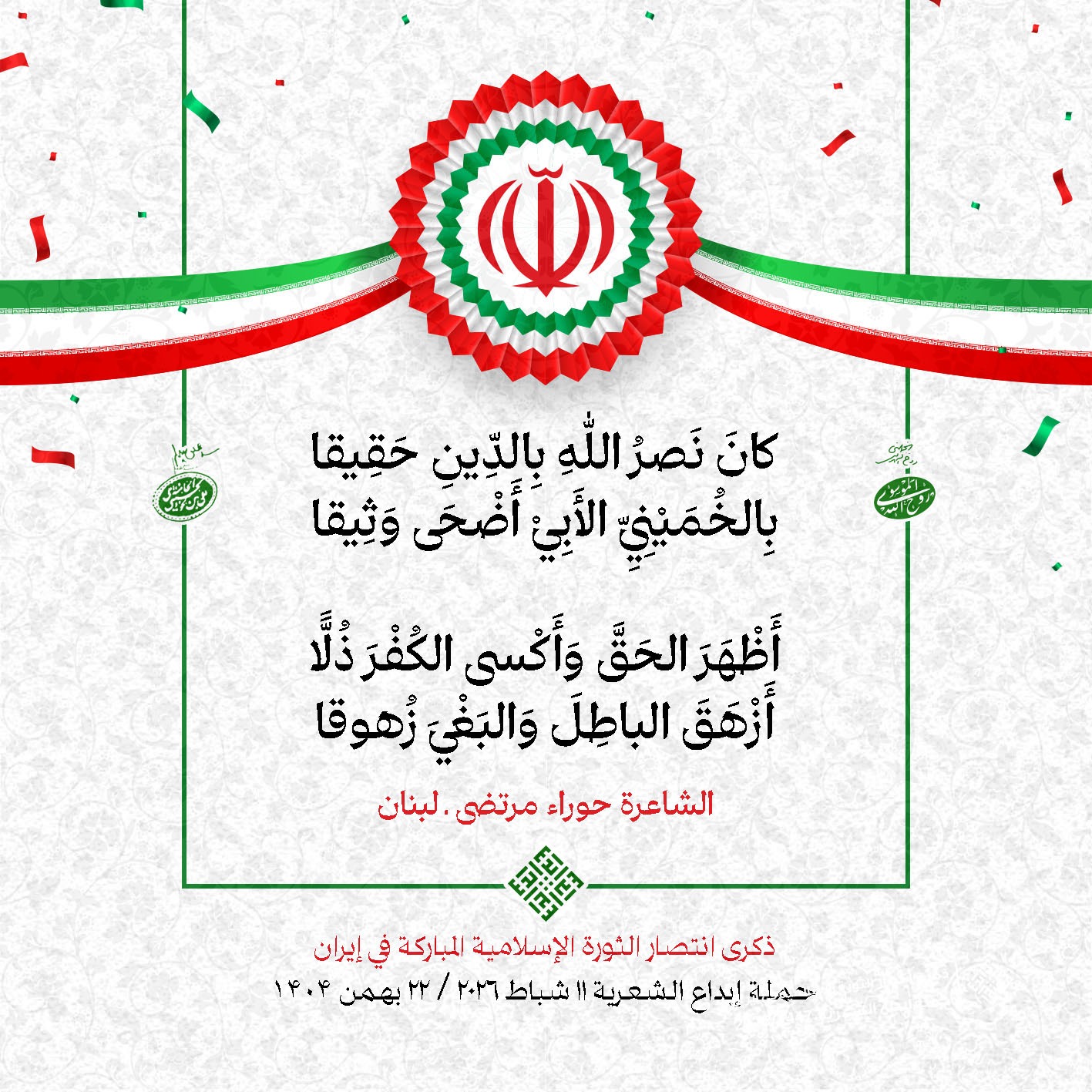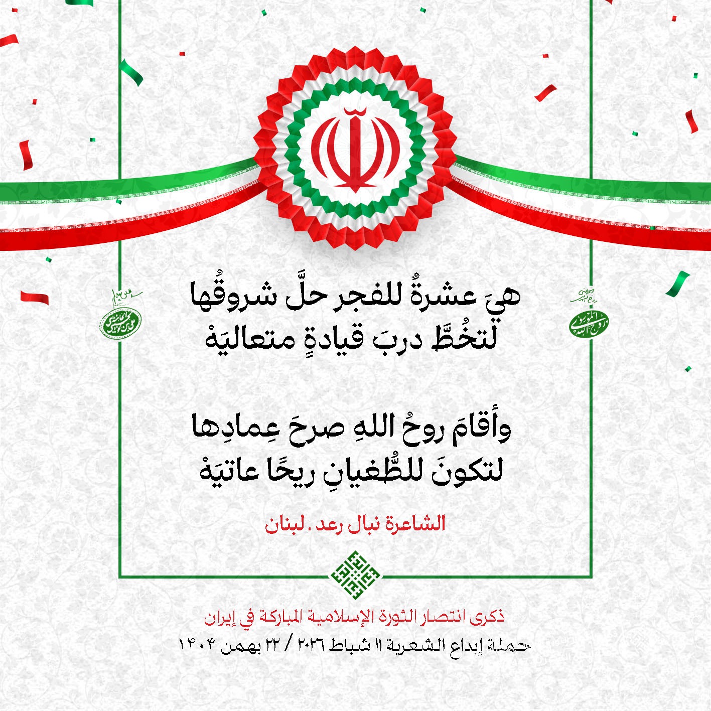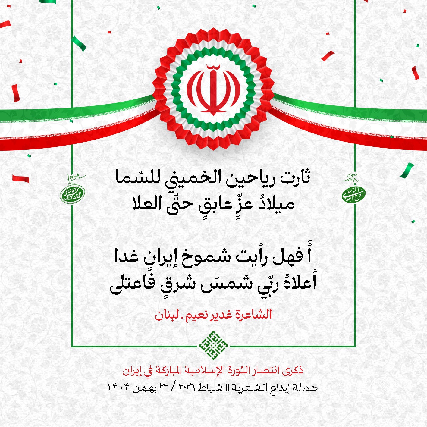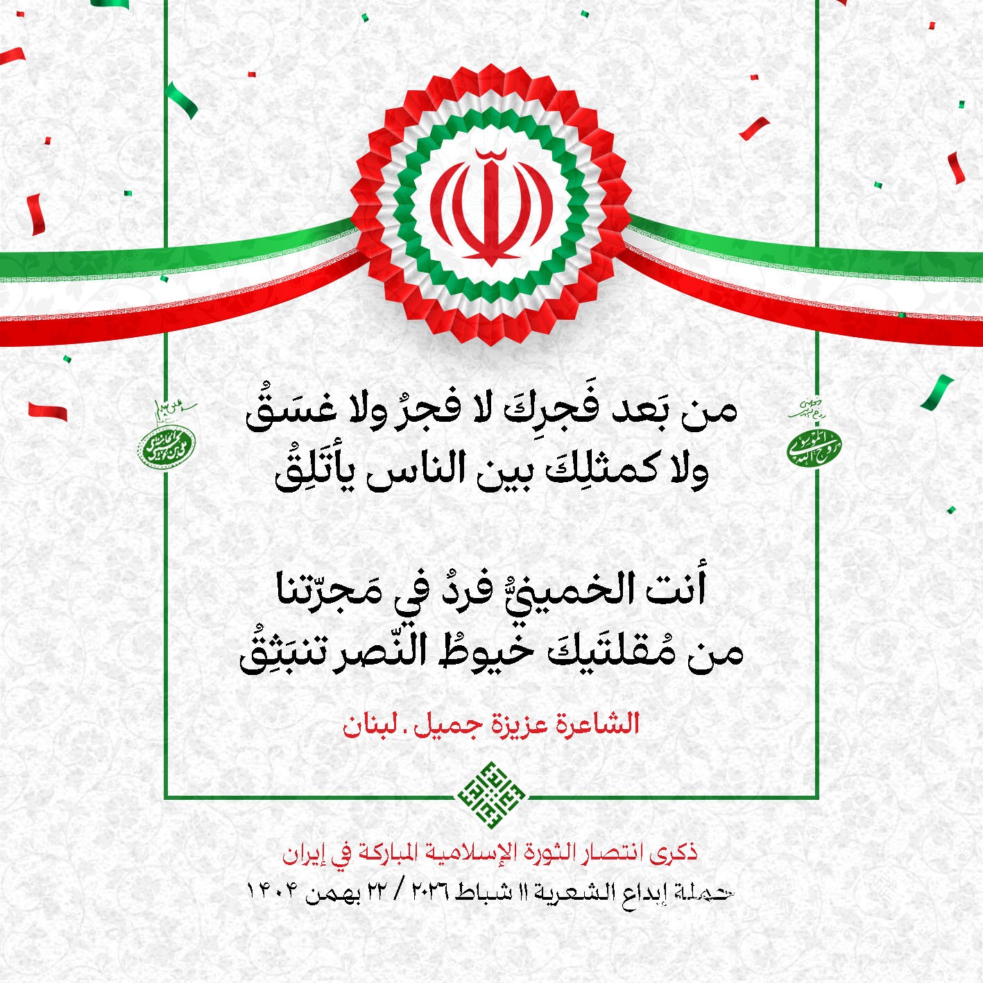 #تبريكات_انتصار_الثورة لمناسبة ذكرى انتصار الثورة الإسلامية في #إيران أطلقت جمعية إبداع في #لبنان حملة شعرية عشية الإنتصار المبارك . وقد شارك في الحملة شعراء وشاعرات من لبنان واليمن والعراق : 1. الشاعر السيد الحتاني ـ لبنان 2. الشاعر الشيخ حسين فقيه ـ لبنان 3. الشاعر الشيخ رضوان الزبيدي ـ العراق 4. الشاعر أحمد غالب سرحان ـ لبنان 5. الشاعر حيدر حيال ـ العراق 6. الشاعر راضي الفريجي ـ العراق 7. الشاعر علي أسامة الحاج دياب ـ لبنان 8. الشاعر علي درويش ـ لبنان 9. الشاعر فؤاد الراشدي ـ اليمن 10. الشاعر محمود شور ـ لبنان 11. الشاعر معن عبد الإله محسن ـ العراق 12. الشاعر مهدي البزّال ـ لبنان 13. الشاعرة أمل سرور ـ لبنان 14. الشاعرة أمل طنانة ـ لبنان 15. الشاعرة حوراء جشي ـ لبنان 16. الشاعرة حوراء مرتضى ـ لبنان 17. الشاعرة زهراء درويش ـ لبنان 18. الشاعرة زهراء مرتضى ـ لبنان 19. الشاعرة زينب الموسوي ـ لبنان 20. الشاعرة سارة اليتامى ـ لبنان 21. الشاعرة سكينة سويدان ـ لبنان 22. الشاعرة عزيزة جميل ـ لبنان 23. الشاعرة غدير نعيم ـ لبنان 24. الشاعرة فاطمة السحمراني ـ لبنان 25. الشاعرة فاطمة عبدو أبو ريّا ـ لبنان 26. الشاعرة كوثر حجازي ـ لبنان 27. الشاعرة مريم عبيد ـ لبنان 28. الشاعرة مريم عصمان ـ لبنان 29. الشاعرة ناديا الحقاني ـ لبنان 30. الشاعرة نبال رعد ـ لبنان #إبداع 11 شباط 2026 #حملة_شعرية #إيران .jpeg)