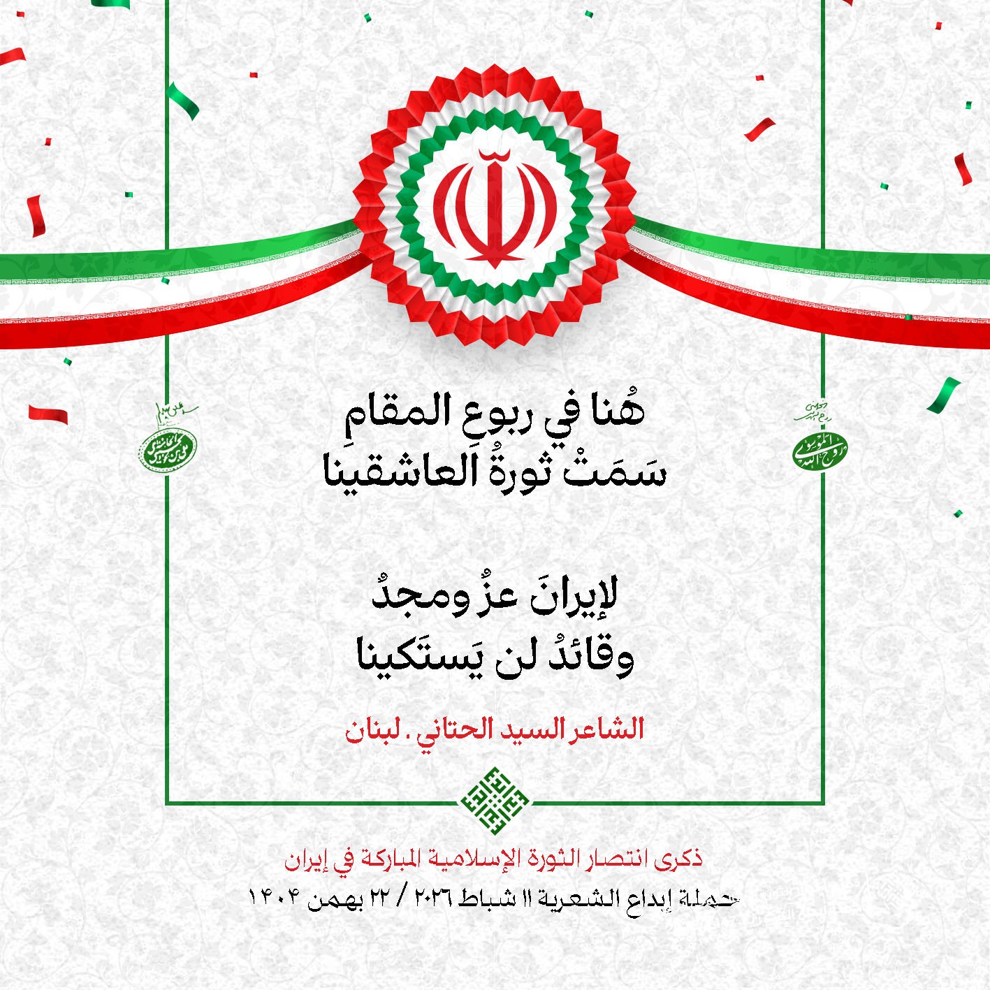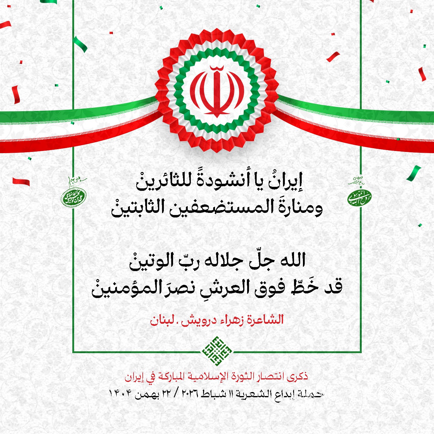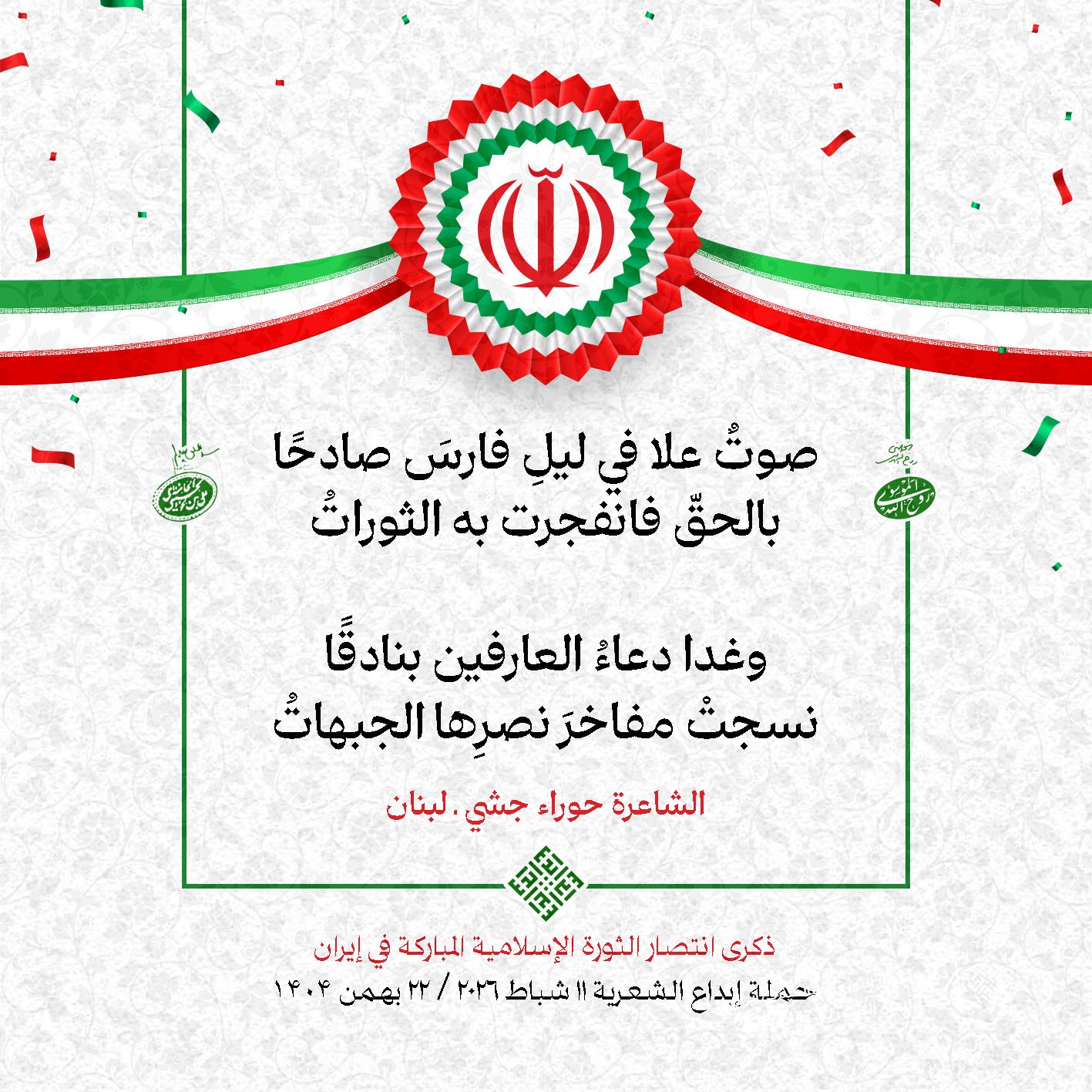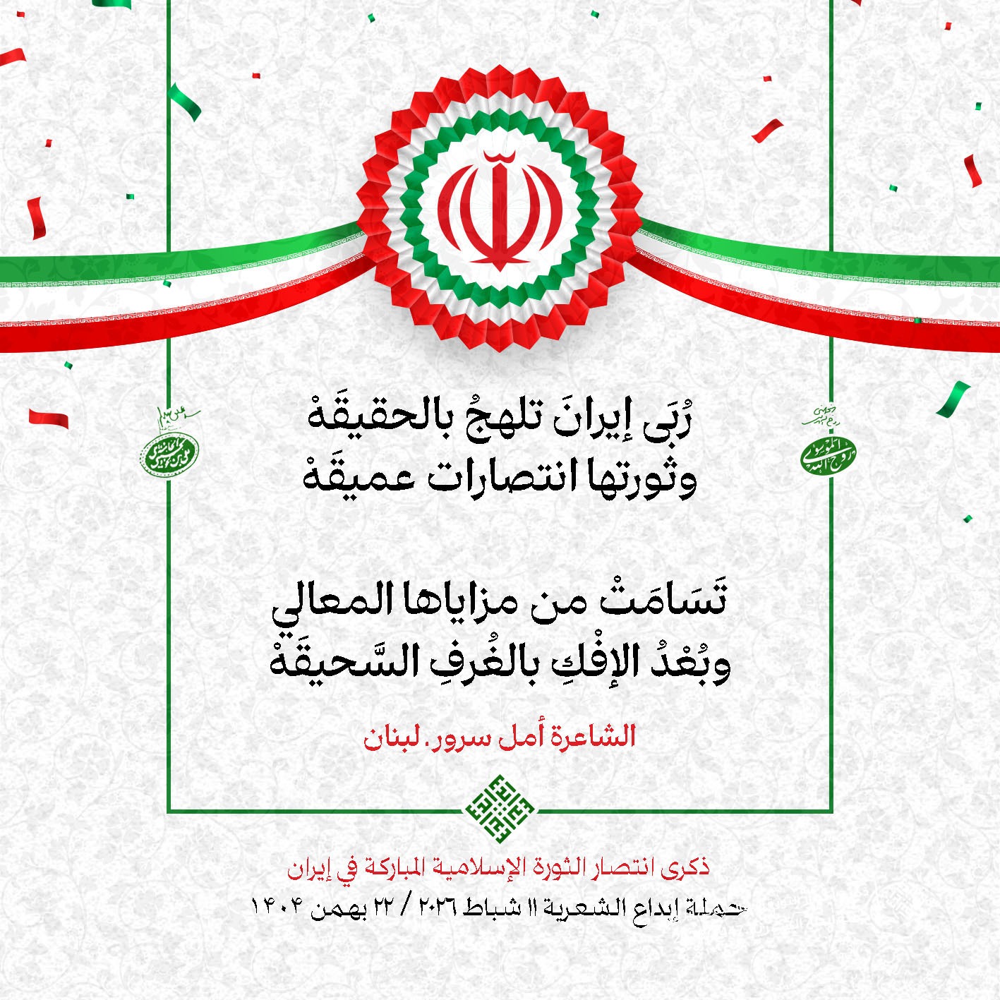 #تبريكات_انتصار_الثورة لمناسبة ذكرى انتصار الثورة الإسلامية في #إيران أطلقت جمعية إبداع في #لبنان حملة شعرية عشية الإنتصار المبارك . وقد شارك في الحملة شعراء وشاعرات من لبنان واليمن والعراق : 1. الشاعر السيد الحتاني ـ لبنان 2. الشاعر الشيخ حسين فقيه ـ لبنان 3. الشاعر الشيخ رضوان الزبيدي ـ العراق 4. الشاعر أحمد غالب سرحان ـ لبنان 5. الشاعر حيدر حيال ـ العراق 6. الشاعر راضي الفريجي ـ العراق 7. الشاعر علي أسامة الحاج دياب ـ لبنان 8. الشاعر علي درويش ـ لبنان 9. الشاعر فؤاد الراشدي ـ اليمن 10. الشاعر محمود شور ـ لبنان 11. الشاعر معن عبد الإله محسن ـ العراق 12. الشاعر مهدي البزّال ـ لبنان 13. الشاعرة أمل سرور ـ لبنان 14. الشاعرة أمل طنانة ـ لبنان 15. الشاعرة حوراء جشي ـ لبنان 16. الشاعرة حوراء مرتضى ـ لبنان 17. الشاعرة زهراء درويش ـ لبنان 18. الشاعرة زهراء مرتضى ـ لبنان 19. الشاعرة زينب الموسوي ـ لبنان 20. الشاعرة سارة اليتامى ـ لبنان 21. الشاعرة سكينة سويدان ـ لبنان 22. الشاعرة عزيزة جميل ـ لبنان 23. الشاعرة غدير نعيم ـ لبنان 24. الشاعرة فاطمة السحمراني ـ لبنان 25. الشاعرة فاطمة عبدو أبو ريّا ـ لبنان 26. الشاعرة كوثر حجازي ـ لبنان 27. الشاعرة مريم عبيد ـ لبنان 28. الشاعرة مريم عصمان ـ لبنان 29. الشاعرة ناديا الحقاني ـ لبنان 30. الشاعرة نبال رعد ـ لبنان #إبداع 11 شباط 2026 #حملة_شعرية #إيران .jpeg)