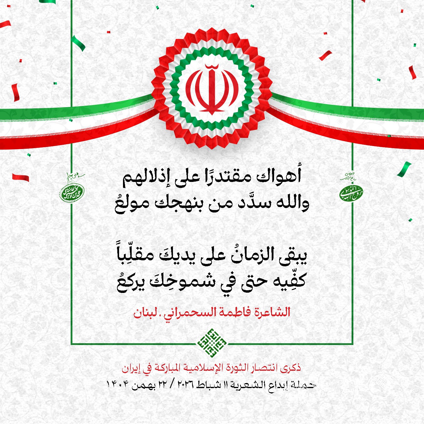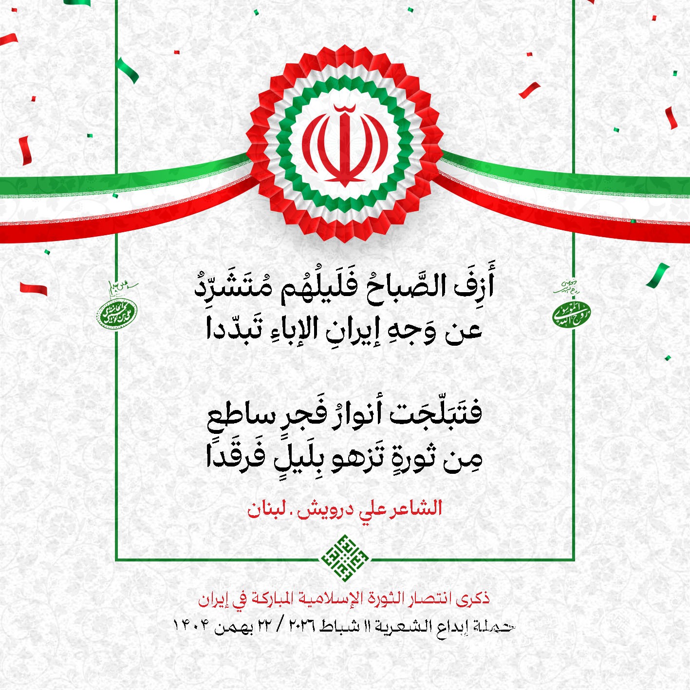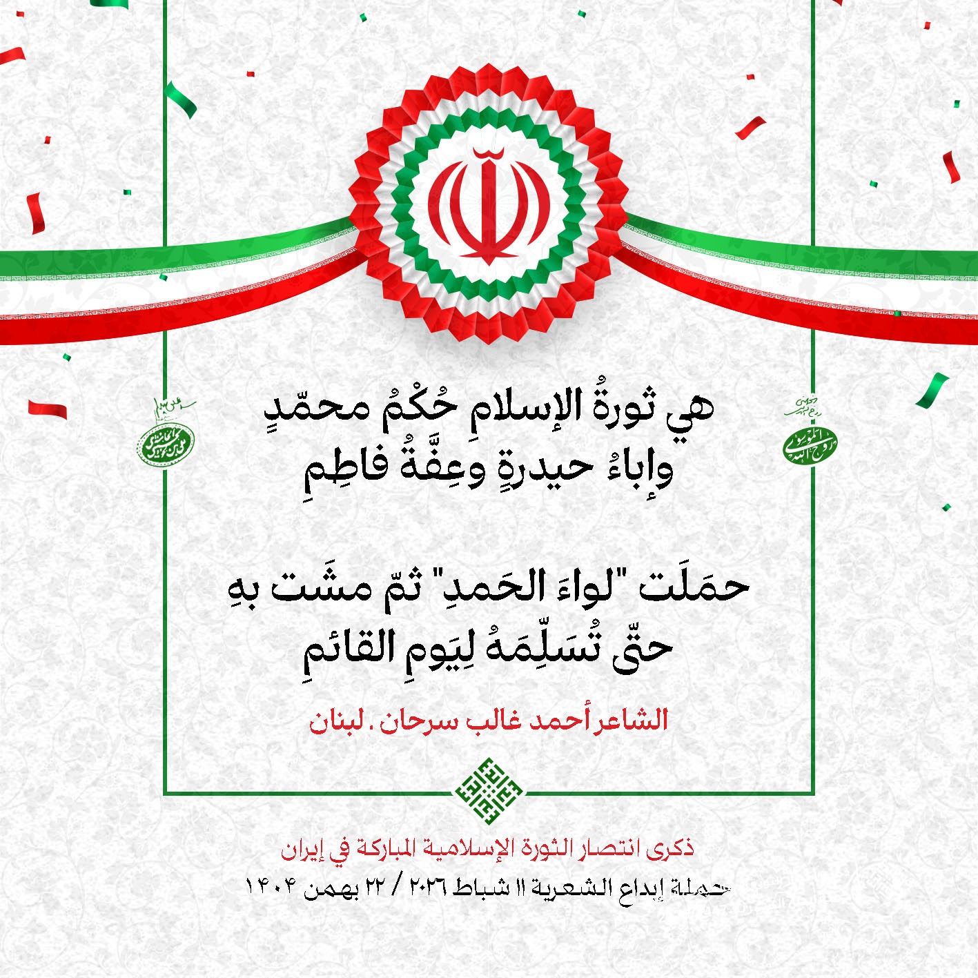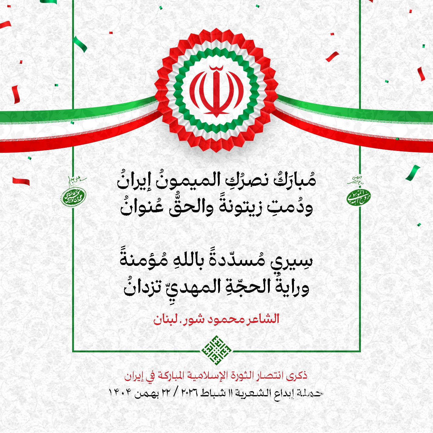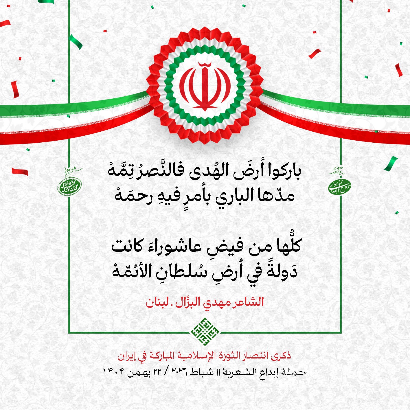 #تبريكات_انتصار_الثورة لمناسبة ذكرى انتصار الثورة الإسلامية في #إيران أطلقت جمعية إبداع في #لبنان حملة شعرية عشية الإنتصار المبارك . وقد شارك في الحملة شعراء وشاعرات من لبنان واليمن والعراق : 1. الشاعر السيد الحتاني ـ لبنان 2. الشاعر الشيخ حسين فقيه ـ لبنان 3. الشاعر الشيخ رضوان الزبيدي ـ العراق 4. الشاعر أحمد غالب سرحان ـ لبنان 5. الشاعر حيدر حيال ـ العراق 6. الشاعر راضي الفريجي ـ العراق 7. الشاعر علي أسامة الحاج دياب ـ لبنان 8. الشاعر علي درويش ـ لبنان 9. الشاعر فؤاد الراشدي ـ اليمن 10. الشاعر محمود شور ـ لبنان 11. الشاعر معن عبد الإله محسن ـ العراق 12. الشاعر مهدي البزّال ـ لبنان 13. الشاعرة أمل سرور ـ لبنان 14. الشاعرة أمل طنانة ـ لبنان 15. الشاعرة حوراء جشي ـ لبنان 16. الشاعرة حوراء مرتضى ـ لبنان 17. الشاعرة زهراء درويش ـ لبنان 18. الشاعرة زهراء مرتضى ـ لبنان 19. الشاعرة زينب الموسوي ـ لبنان 20. الشاعرة سارة اليتامى ـ لبنان 21. الشاعرة سكينة سويدان ـ لبنان 22. الشاعرة عزيزة جميل ـ لبنان 23. الشاعرة غدير نعيم ـ لبنان 24. الشاعرة فاطمة السحمراني ـ لبنان 25. الشاعرة فاطمة عبدو أبو ريّا ـ لبنان 26. الشاعرة كوثر حجازي ـ لبنان 27. الشاعرة مريم عبيد ـ لبنان 28. الشاعرة مريم عصمان ـ لبنان 29. الشاعرة ناديا الحقاني ـ لبنان 30. الشاعرة نبال رعد ـ لبنان #إبداع 11 شباط 2026 #حملة_شعرية #إيران .jpeg)