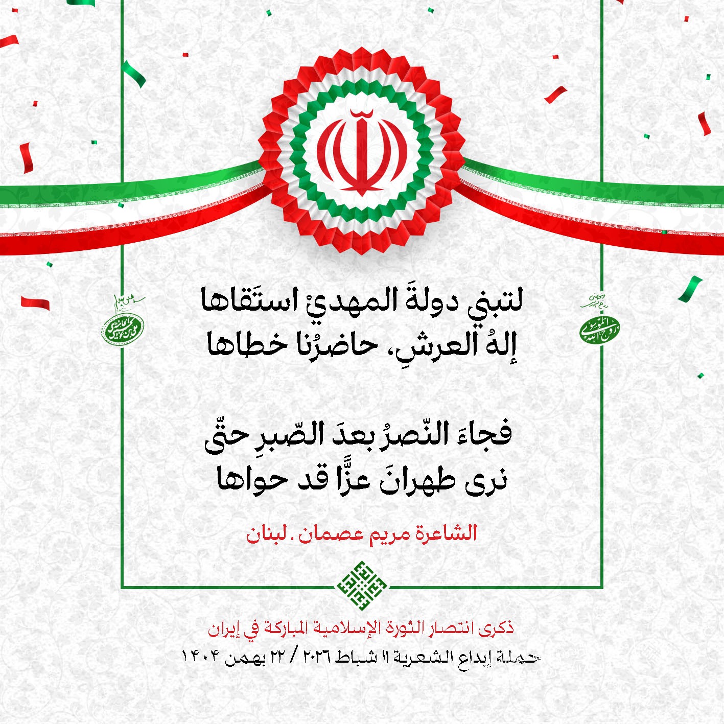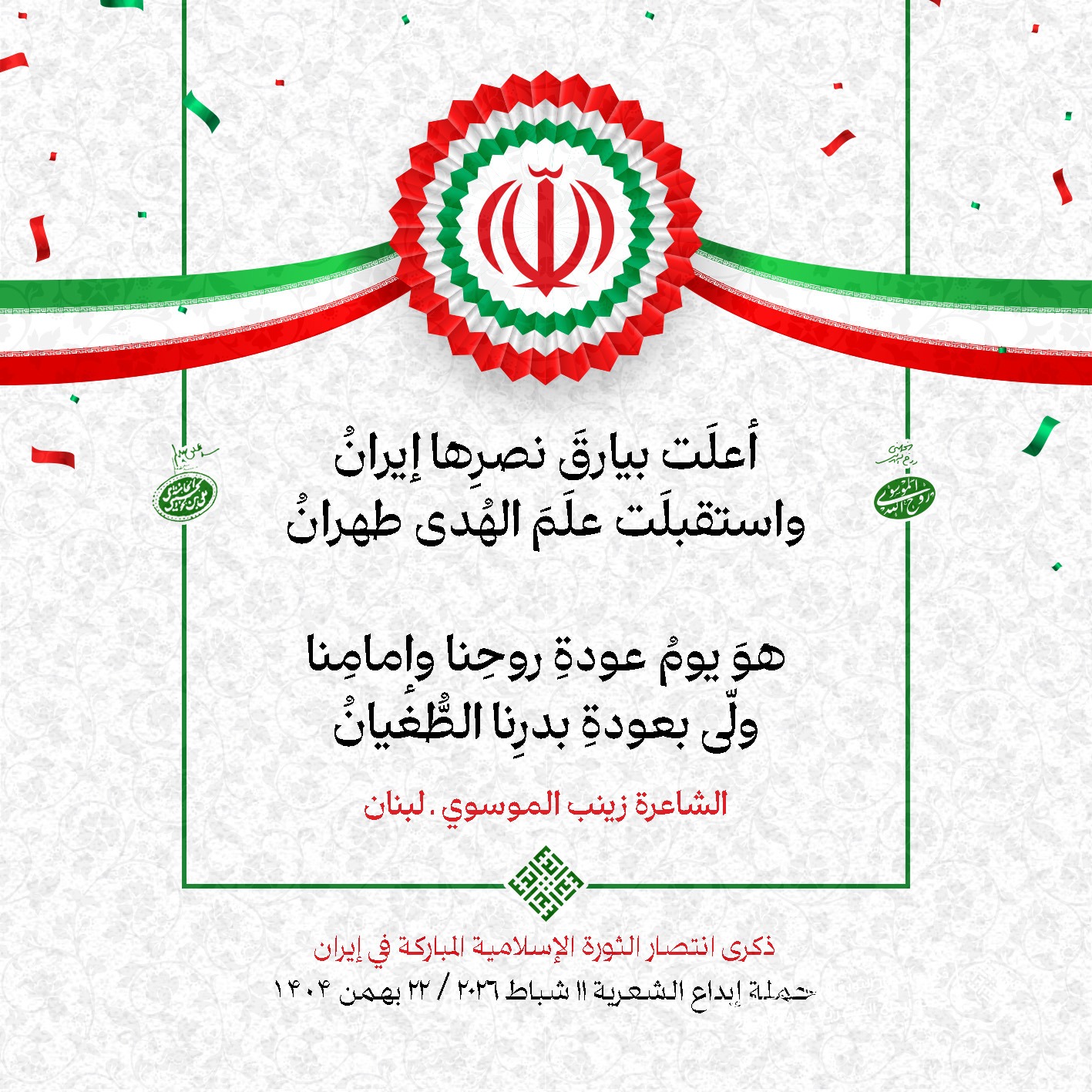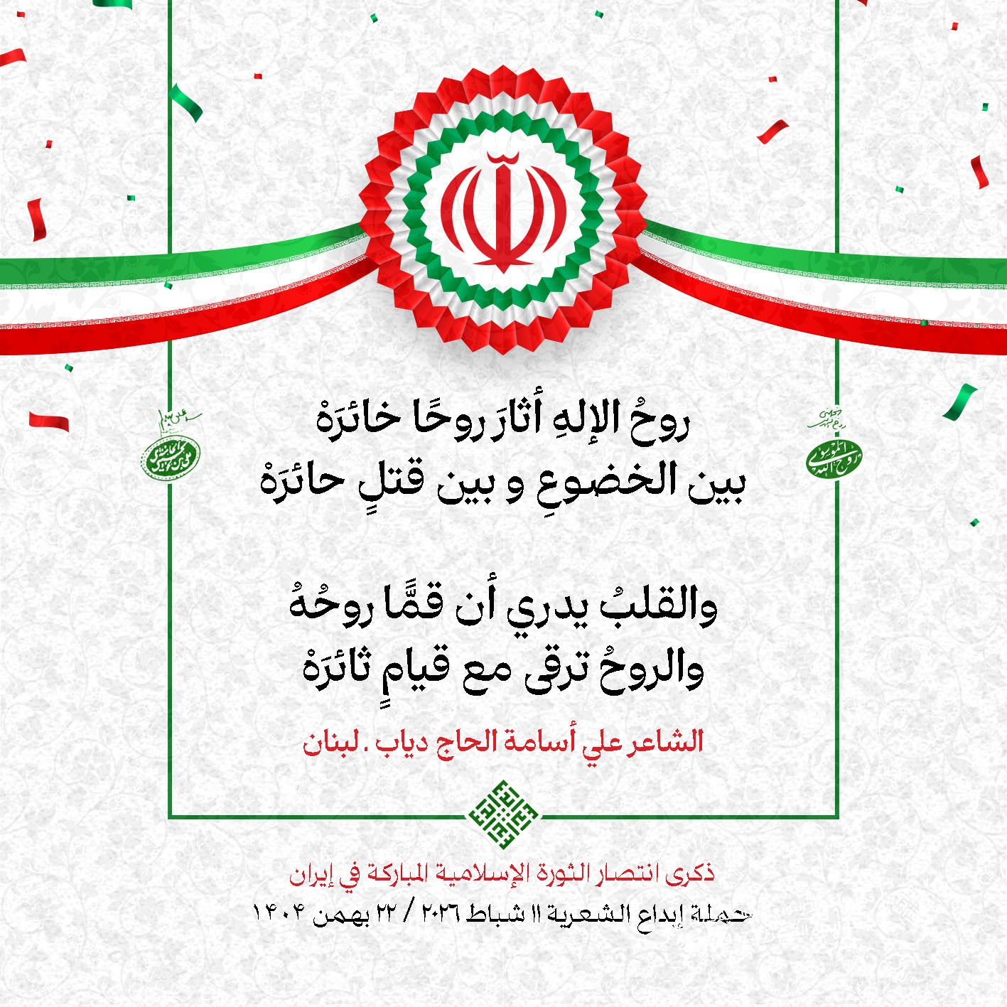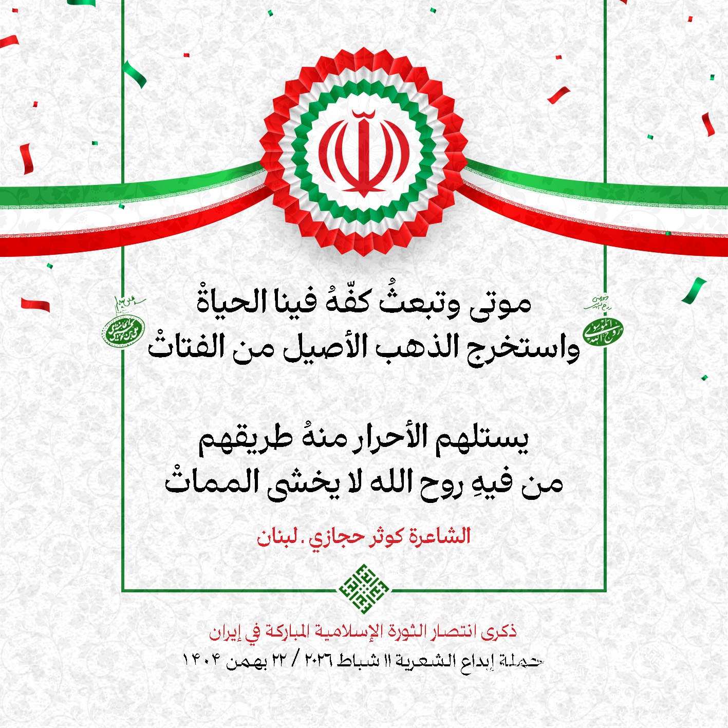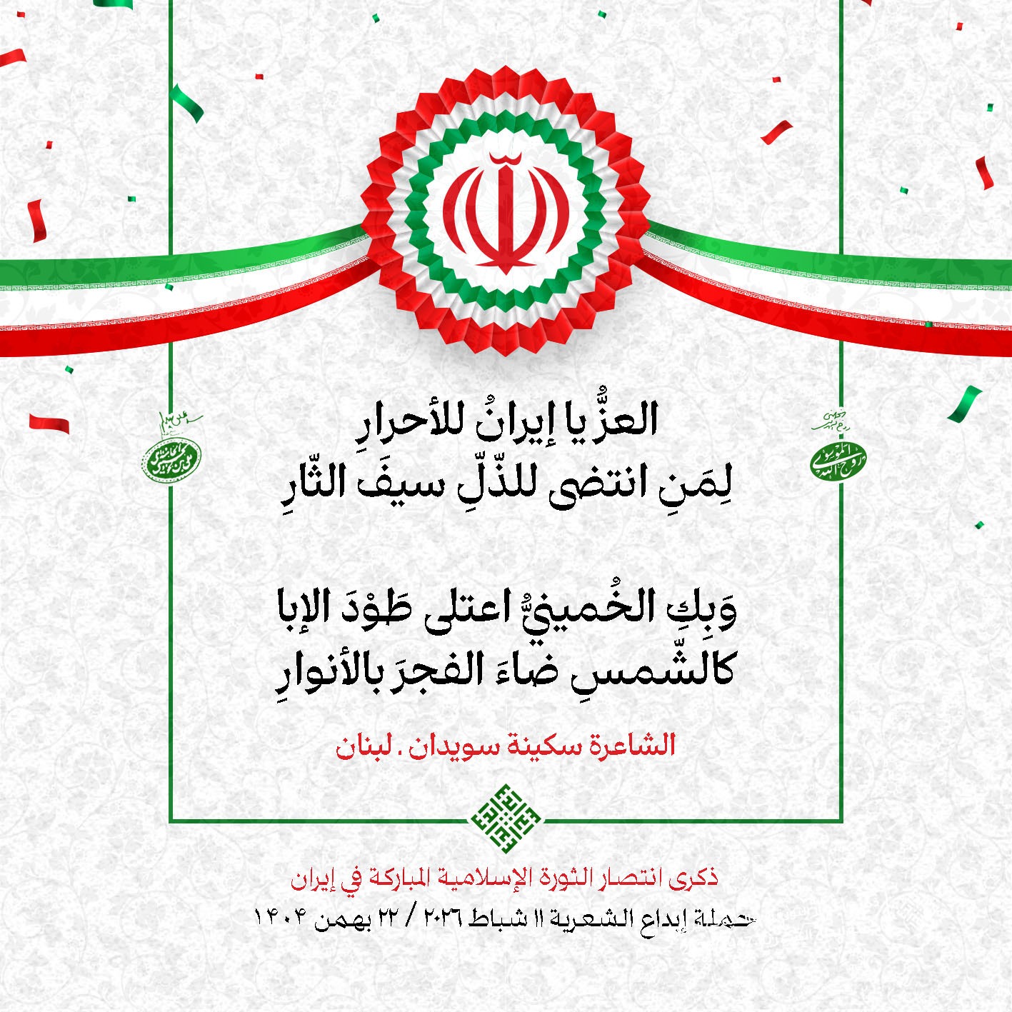 #تبريكات_انتصار_الثورة لمناسبة ذكرى انتصار الثورة الإسلامية في #إيران أطلقت جمعية إبداع في #لبنان حملة شعرية عشية الإنتصار المبارك . وقد شارك في الحملة شعراء وشاعرات من لبنان واليمن والعراق : 1. الشاعر السيد الحتاني ـ لبنان 2. الشاعر الشيخ حسين فقيه ـ لبنان 3. الشاعر الشيخ رضوان الزبيدي ـ العراق 4. الشاعر أحمد غالب سرحان ـ لبنان 5. الشاعر حيدر حيال ـ العراق 6. الشاعر راضي الفريجي ـ العراق 7. الشاعر علي أسامة الحاج دياب ـ لبنان 8. الشاعر علي درويش ـ لبنان 9. الشاعر فؤاد الراشدي ـ اليمن 10. الشاعر محمود شور ـ لبنان 11. الشاعر معن عبد الإله محسن ـ العراق 12. الشاعر مهدي البزّال ـ لبنان 13. الشاعرة أمل سرور ـ لبنان 14. الشاعرة أمل طنانة ـ لبنان 15. الشاعرة حوراء جشي ـ لبنان 16. الشاعرة حوراء مرتضى ـ لبنان 17. الشاعرة زهراء درويش ـ لبنان 18. الشاعرة زهراء مرتضى ـ لبنان 19. الشاعرة زينب الموسوي ـ لبنان 20. الشاعرة سارة اليتامى ـ لبنان 21. الشاعرة سكينة سويدان ـ لبنان 22. الشاعرة عزيزة جميل ـ لبنان 23. الشاعرة غدير نعيم ـ لبنان 24. الشاعرة فاطمة السحمراني ـ لبنان 25. الشاعرة فاطمة عبدو أبو ريّا ـ لبنان 26. الشاعرة كوثر حجازي ـ لبنان 27. الشاعرة مريم عبيد ـ لبنان 28. الشاعرة مريم عصمان ـ لبنان 29. الشاعرة ناديا الحقاني ـ لبنان 30. الشاعرة نبال رعد ـ لبنان #إبداع 11 شباط 2026 #حملة_شعرية #إيران .jpeg)