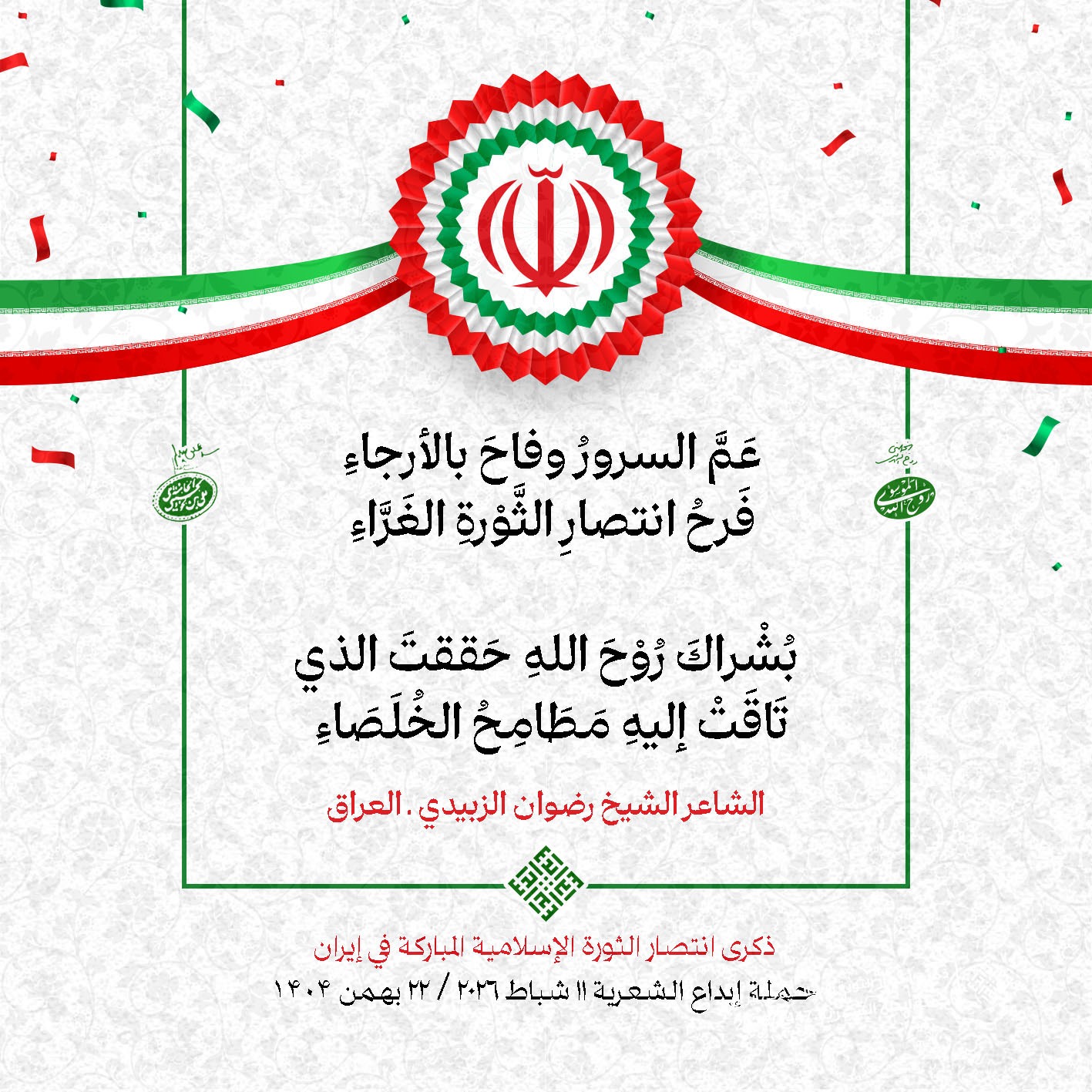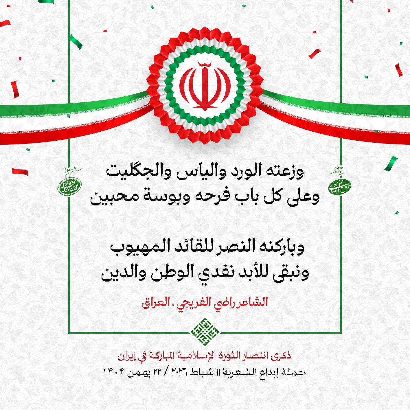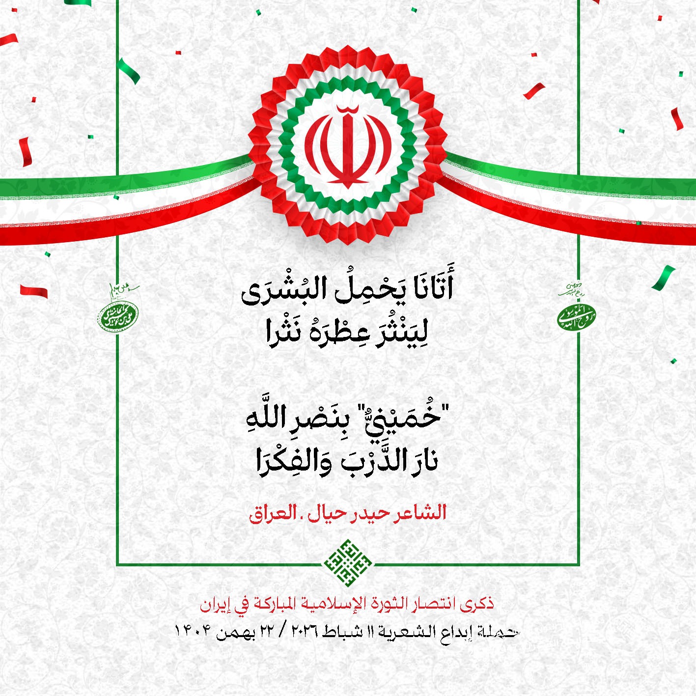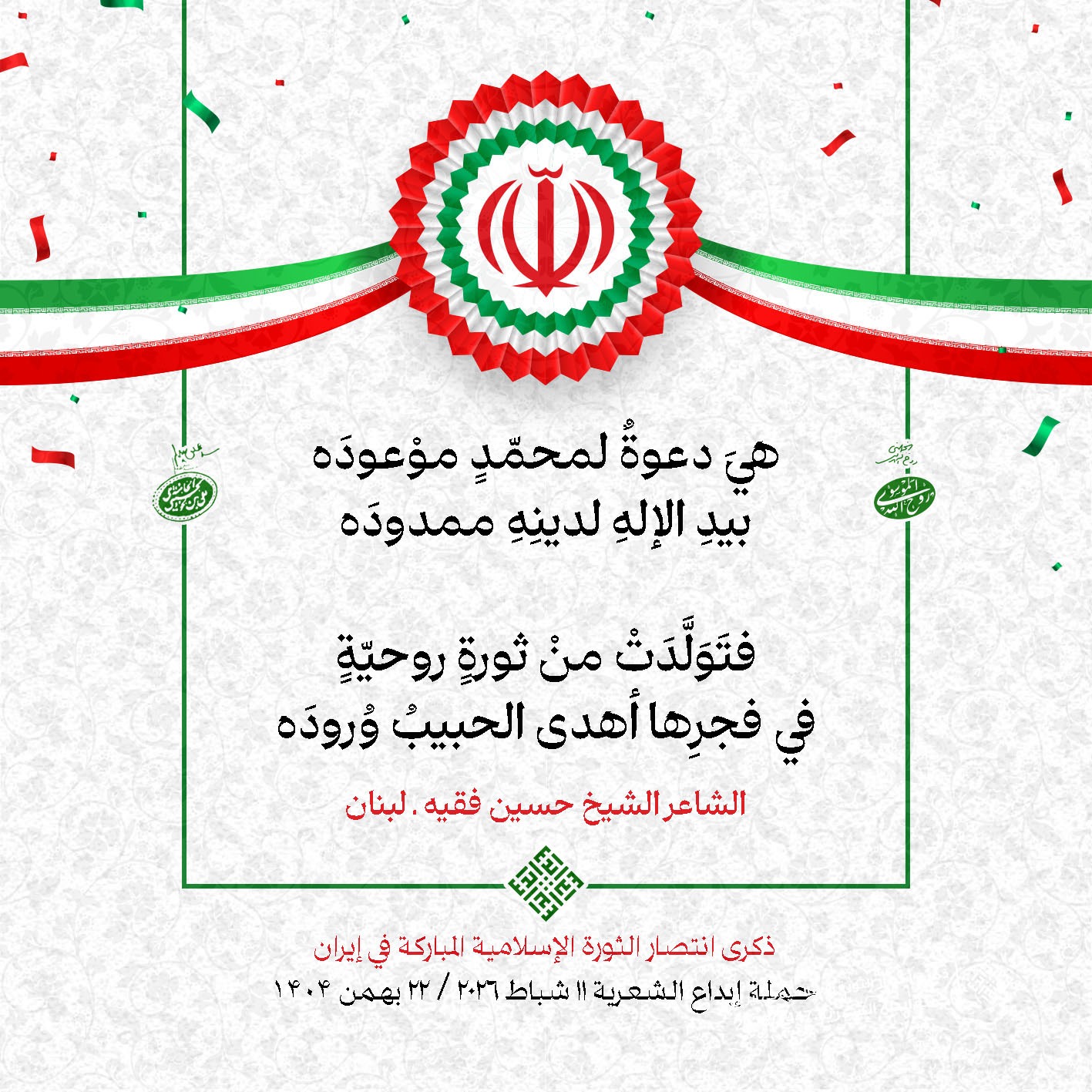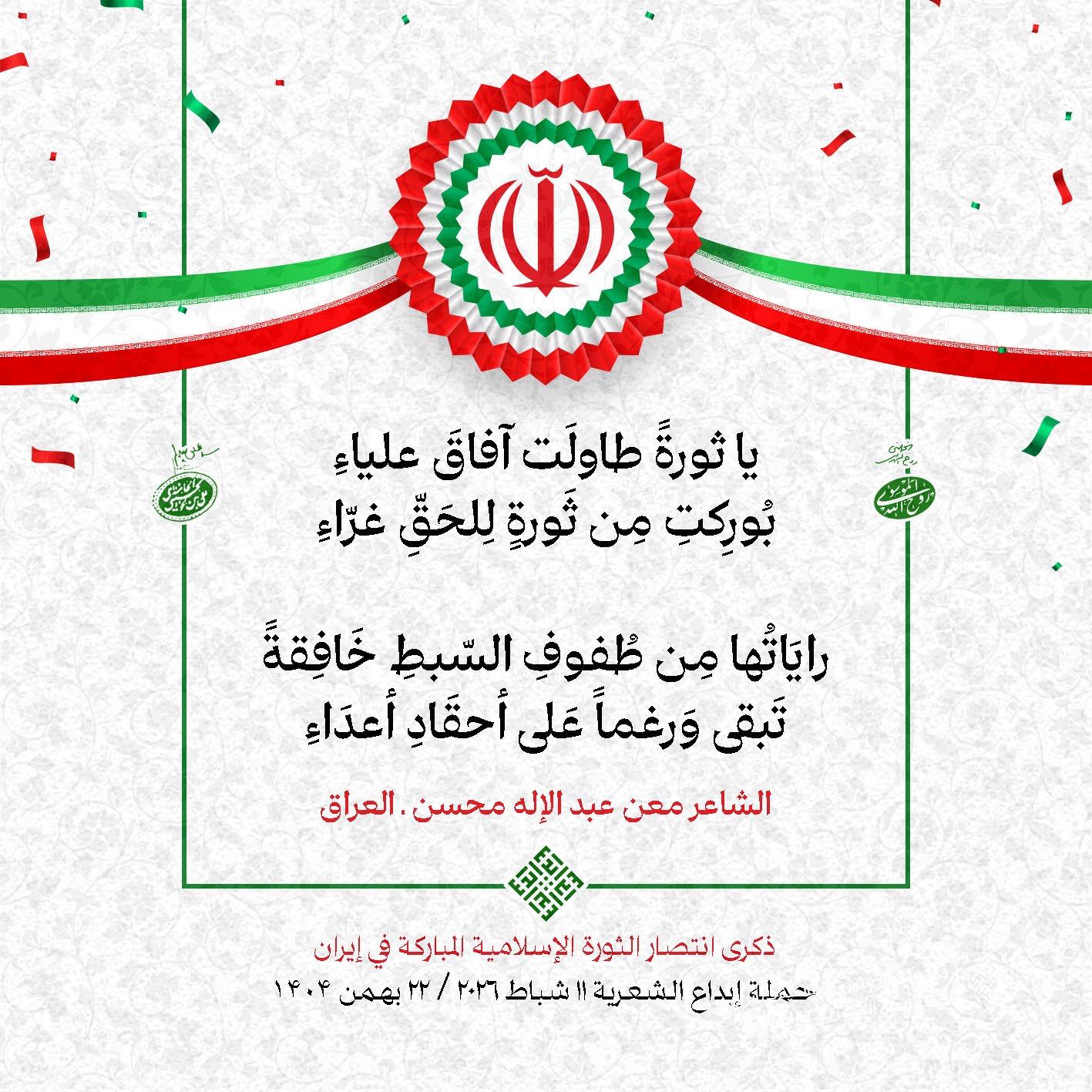 #تبريكات_انتصار_الثورة لمناسبة ذكرى انتصار الثورة الإسلامية في #إيران أطلقت جمعية إبداع في #لبنان حملة شعرية عشية الإنتصار المبارك . وقد شارك في الحملة شعراء وشاعرات من لبنان واليمن والعراق : 1. الشاعر السيد الحتاني ـ لبنان 2. الشاعر الشيخ حسين فقيه ـ لبنان 3. الشاعر الشيخ رضوان الزبيدي ـ العراق 4. الشاعر أحمد غالب سرحان ـ لبنان 5. الشاعر حيدر حيال ـ العراق 6. الشاعر راضي الفريجي ـ العراق 7. الشاعر علي أسامة الحاج دياب ـ لبنان 8. الشاعر علي درويش ـ لبنان 9. الشاعر فؤاد الراشدي ـ اليمن 10. الشاعر محمود شور ـ لبنان 11. الشاعر معن عبد الإله محسن ـ العراق 12. الشاعر مهدي البزّال ـ لبنان 13. الشاعرة أمل سرور ـ لبنان 14. الشاعرة أمل طنانة ـ لبنان 15. الشاعرة حوراء جشي ـ لبنان 16. الشاعرة حوراء مرتضى ـ لبنان 17. الشاعرة زهراء درويش ـ لبنان 18. الشاعرة زهراء مرتضى ـ لبنان 19. الشاعرة زينب الموسوي ـ لبنان 20. الشاعرة سارة اليتامى ـ لبنان 21. الشاعرة سكينة سويدان ـ لبنان 22. الشاعرة عزيزة جميل ـ لبنان 23. الشاعرة غدير نعيم ـ لبنان 24. الشاعرة فاطمة السحمراني ـ لبنان 25. الشاعرة فاطمة عبدو أبو ريّا ـ لبنان 26. الشاعرة كوثر حجازي ـ لبنان 27. الشاعرة مريم عبيد ـ لبنان 28. الشاعرة مريم عصمان ـ لبنان 29. الشاعرة ناديا الحقاني ـ لبنان 30. الشاعرة نبال رعد ـ لبنان #إبداع 11 شباط 2026 #حملة_شعرية #إيران .jpeg)