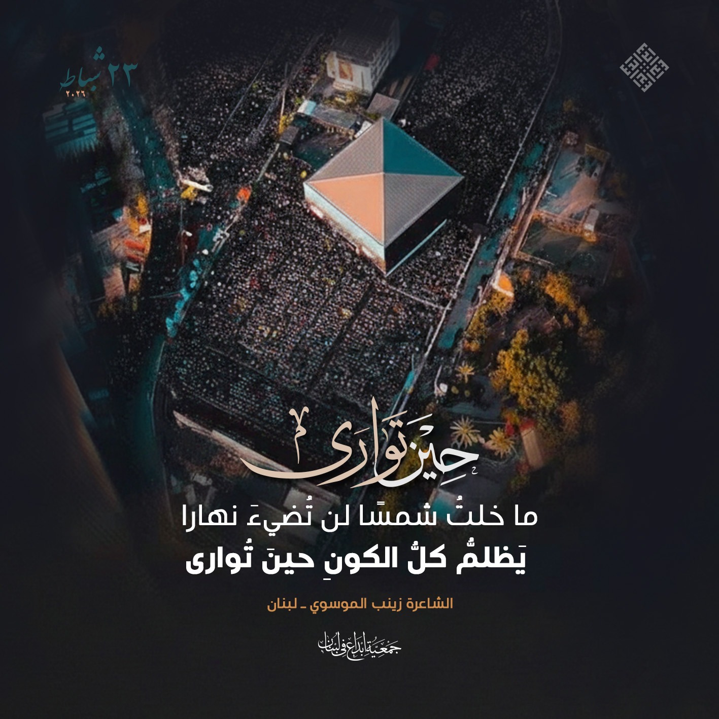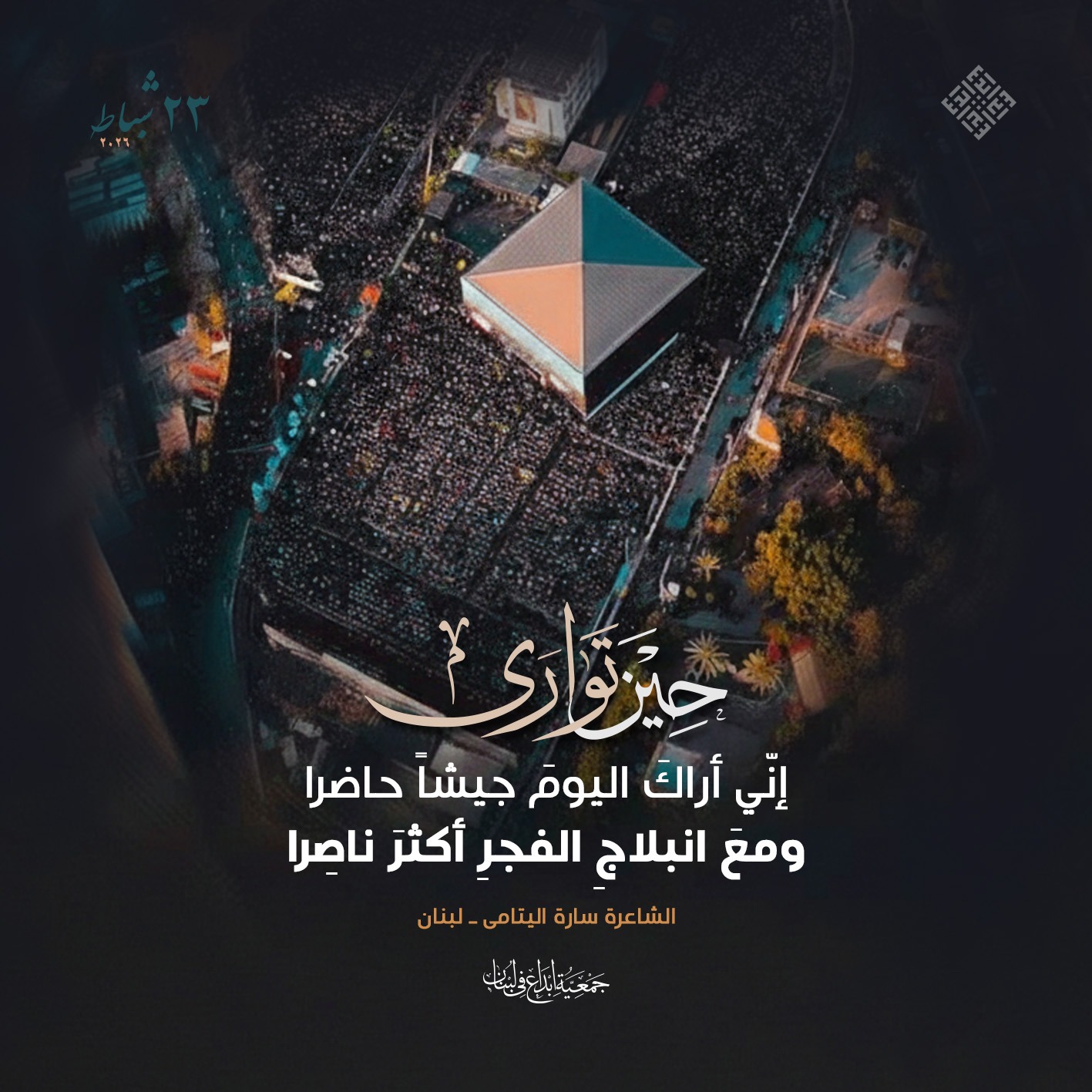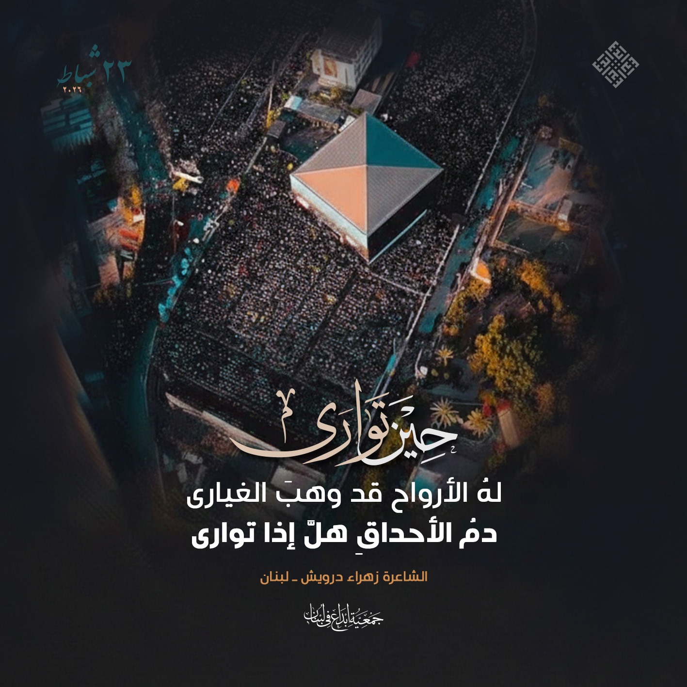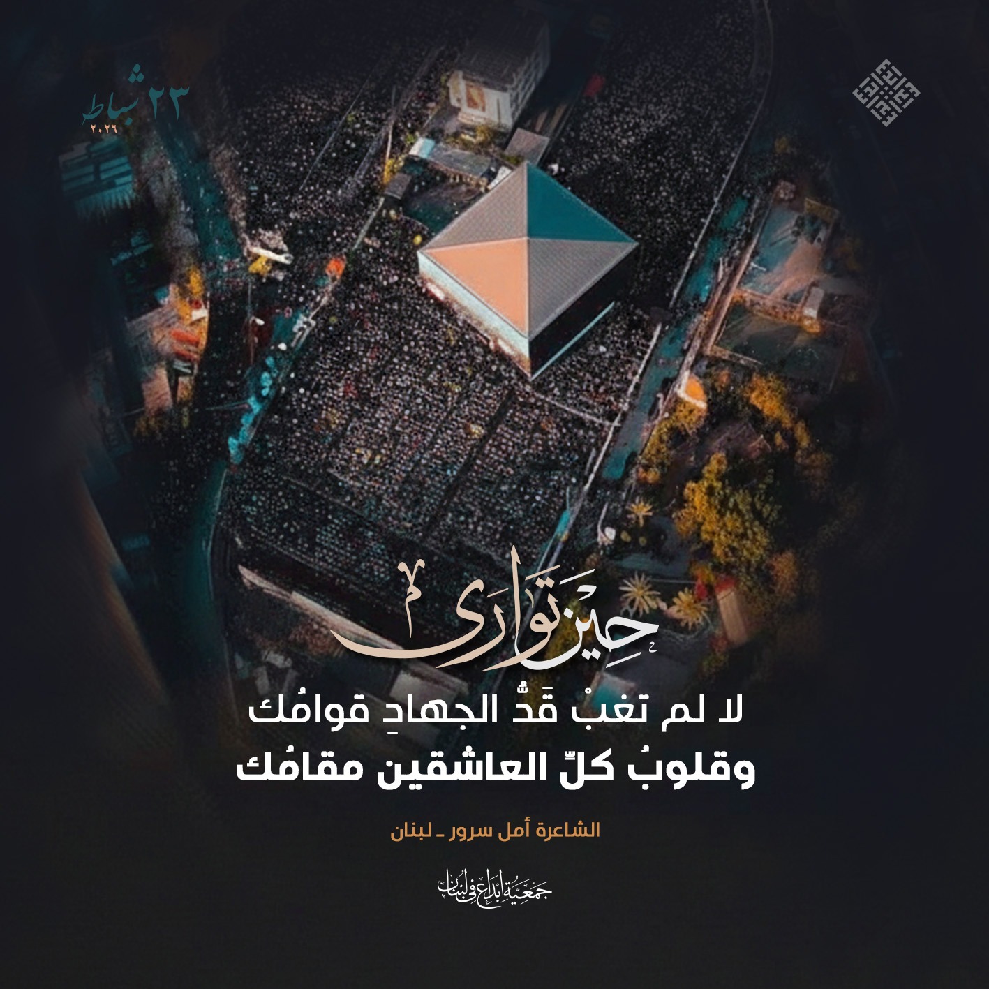 #حين_توارى حملة #إبداع الشعرية بذكرى تشييع مولانا #السيد #المستطاب #سيد_شهداء_الأمة المشاركون في الحملة : 1. الشاعر الشيخ حسين فقيه ـ لبنان 2. الشاعر الشيخ سلمان ال عبد الرسول السماوي ـ العراق 3. الشاعر أبو ميرزا مهدي 4. الشاعر أحمد علي أحمد ـ لبنان 5. الشاعر أحمد غالب سرحان ـ لبنان 6. الشاعر جواد حايك ـ لبنان 7. الشاعر حسن سامي العبد الله ـ العراق 8. الشاعر حسين صفوان ـ لبنان 9. الشاعر داوود ال عبد الرسول السماوي ـ العراق 10. الشاعر زكريا المنخي ـ العراق 11. الشاعر ضياء عاشور ـ العراق 12. الشاعر عبد الله خليفة ـ لبنان 13. الشاعر علي أسامة الحاج دياب ـ لبنان 14. الشاعر علي درويش ـ لبنان 15. الشاعر علي مرتضى السندي ـ العراق 16. الشاعر محمود شور ـ لبنان 17. الشاعر معن عبد الإله محسن ـ العراق 18. الشاعر مهدي البزّال ـ لبنان 19. الشاعر مهدي مصطفى عرار ـ لبنان 20. الشاعرة إسراء شبلي ـ لبنان 21. الشاعرة إسراء لافي عودة ـ لبنان 22. الشاعرة أمل سرور ـ لبنان 23. الشاعرة حوراء حميّة ـ لبنان 24. الشاعرة زهراء درويش ـ لبنان 25. الشاعرة زينب الموسوي ـ لبنان 26. الشاعرة سارة اليتامى ـ لبنان 27. الشاعرة سكينة سويدان ـ لبنان 28. الشاعرة غدير نعيم ـ لبنان 29. الشاعرة فاطمة العوطة ـ لبنان 30. الشاعرة فاطمة سكاف ـ لبنان 31. الشاعرة كوثر العطار ـ لبنان 32. الشاعرة كوثر حجازي ـ لبنان 33. الشاعرة مريم عبيد ـ لبنان 34. الشاعرة مريم عصمان ـ لبنان 35. الشاعرة منال بجيجي ـ لبنان 36. الشاعرة ميسم مغنية ـ لبنان 37. الشاعرة ناديا الحقاني ـ لبنان 38. الشاعرة نبال رعد ـ لبنان 39. الشاعرة نور مصطفى لمع ـ لبنان 40. الشاعرة هناء إبراهيم ـ لبنان ... #إبداع #حين_توارى 23 شباط 2026 #تشييع_السيد