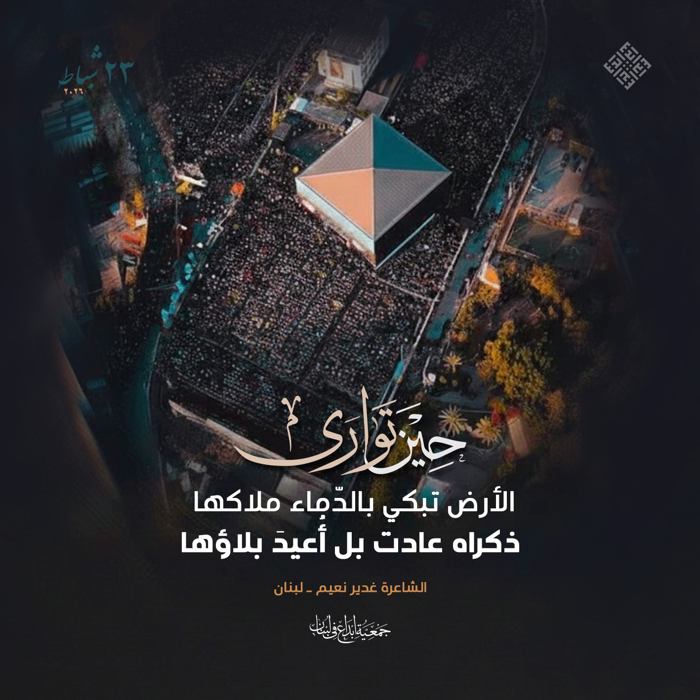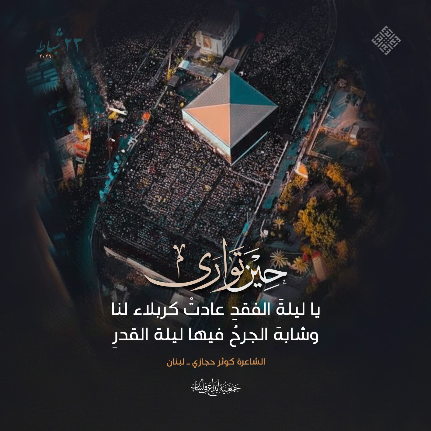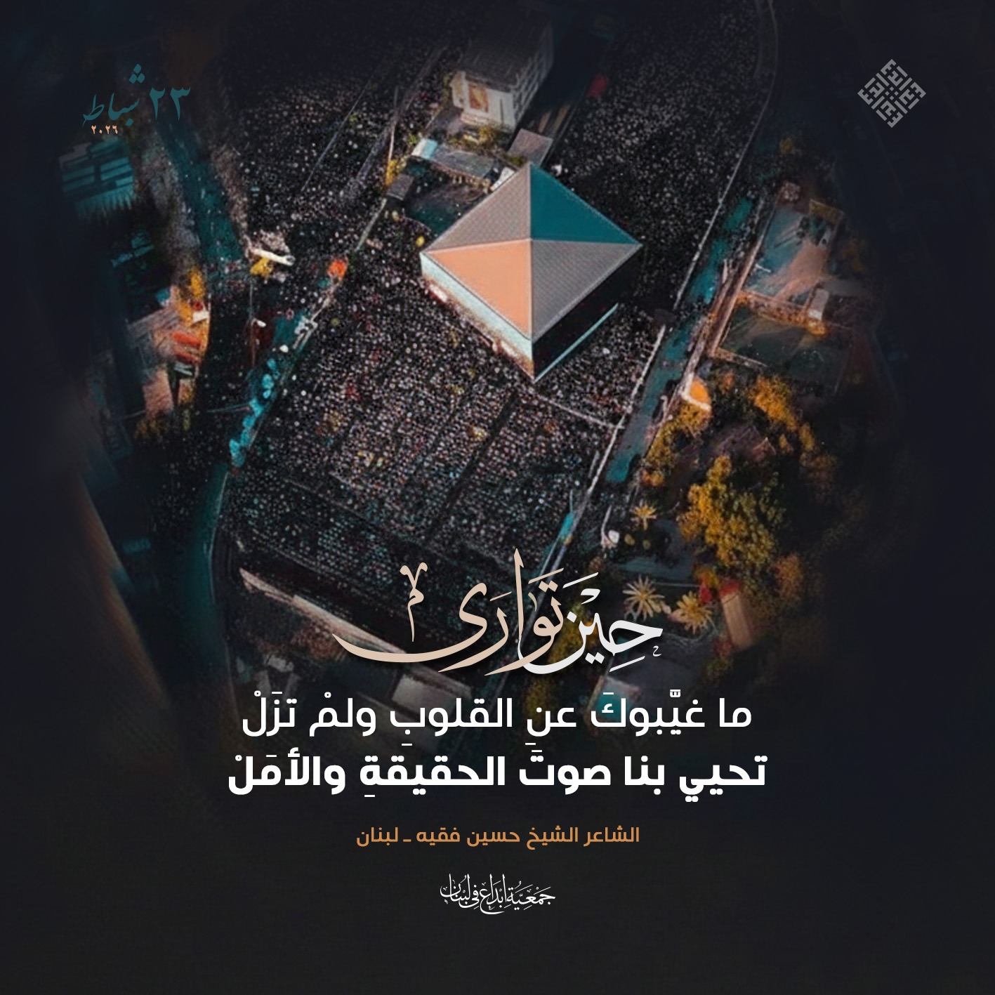 #حين_توارى حملة #إبداع الشعرية بذكرى تشييع مولانا #السيد #المستطاب #سيد_شهداء_الأمة المشاركون في الحملة : 1. الشاعر الشيخ حسين فقيه ـ لبنان 2. الشاعر الشيخ سلمان ال عبد الرسول السماوي ـ العراق 3. الشاعر أبو ميرزا مهدي 4. الشاعر أحمد علي أحمد ـ لبنان 5. الشاعر أحمد غالب سرحان ـ لبنان 6. الشاعر جواد حايك ـ لبنان 7. الشاعر حسن سامي العبد الله ـ العراق 8. الشاعر حسين صفوان ـ لبنان 9. الشاعر داوود ال عبد الرسول السماوي ـ العراق 10. الشاعر زكريا المنخي ـ العراق 11. الشاعر ضياء عاشور ـ العراق 12. الشاعر عبد الله خليفة ـ لبنان 13. الشاعر علي أسامة الحاج دياب ـ لبنان 14. الشاعر علي درويش ـ لبنان 15. الشاعر علي مرتضى السندي ـ العراق 16. الشاعر محمود شور ـ لبنان 17. الشاعر معن عبد الإله محسن ـ العراق 18. الشاعر مهدي البزّال ـ لبنان 19. الشاعر مهدي مصطفى عرار ـ لبنان 20. الشاعرة إسراء شبلي ـ لبنان 21. الشاعرة إسراء لافي عودة ـ لبنان 22. الشاعرة أمل سرور ـ لبنان 23. الشاعرة حوراء حميّة ـ لبنان 24. الشاعرة زهراء درويش ـ لبنان 25. الشاعرة زينب الموسوي ـ لبنان 26. الشاعرة سارة اليتامى ـ لبنان 27. الشاعرة سكينة سويدان ـ لبنان 28. الشاعرة غدير نعيم ـ لبنان 29. الشاعرة فاطمة العوطة ـ لبنان 30. الشاعرة فاطمة سكاف ـ لبنان 31. الشاعرة كوثر العطار ـ لبنان 32. الشاعرة كوثر حجازي ـ لبنان 33. الشاعرة مريم عبيد ـ لبنان 34. الشاعرة مريم عصمان ـ لبنان 35. الشاعرة منال بجيجي ـ لبنان 36. الشاعرة ميسم مغنية ـ لبنان 37. الشاعرة ناديا الحقاني ـ لبنان 38. الشاعرة نبال رعد ـ لبنان 39. الشاعرة نور مصطفى لمع ـ لبنان 40. الشاعرة هناء إبراهيم ـ لبنان ... #إبداع #حين_توارى 23 شباط 2026 #تشييع_السيد