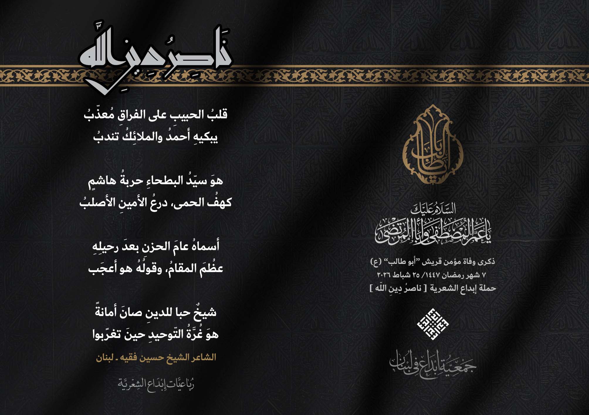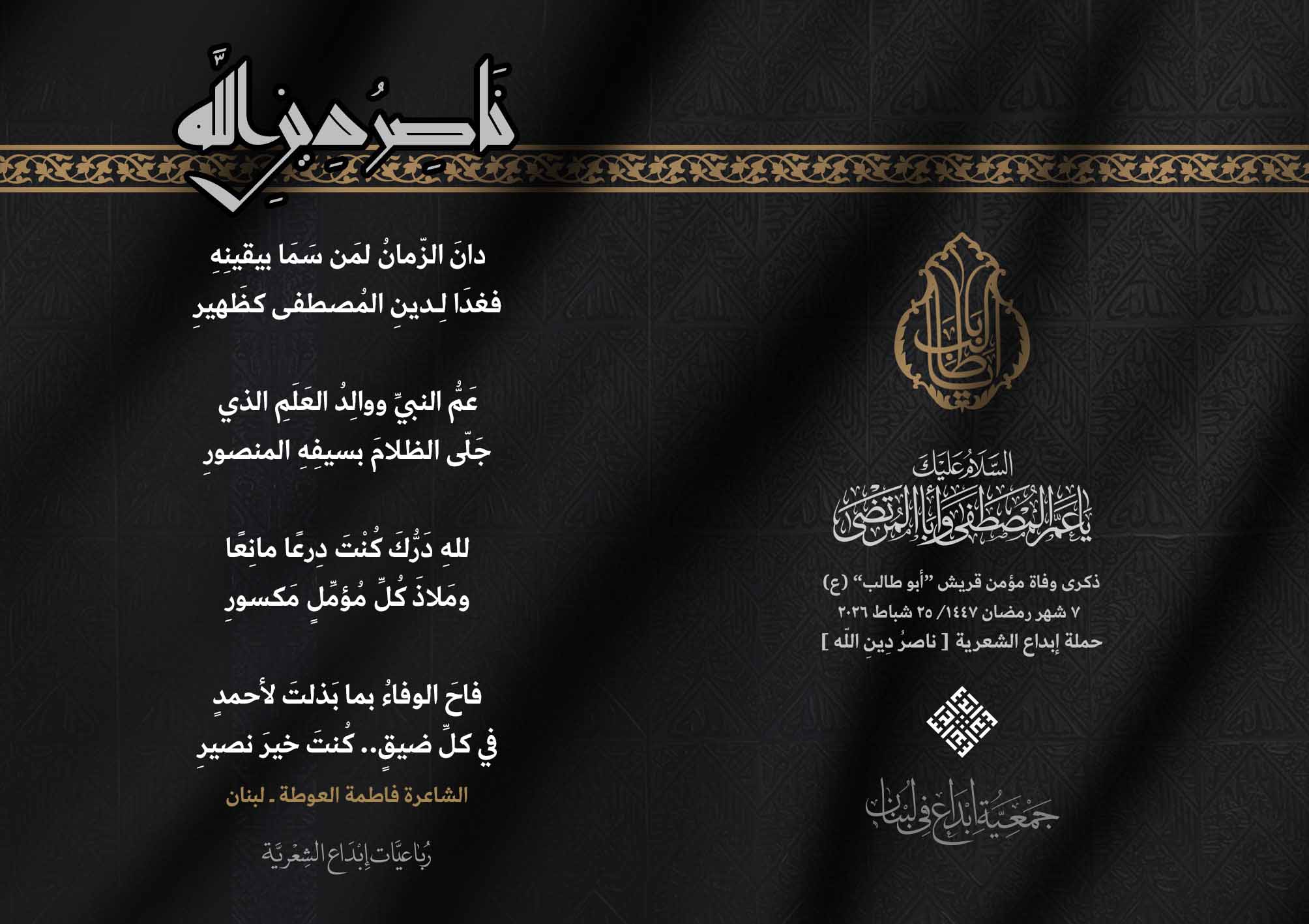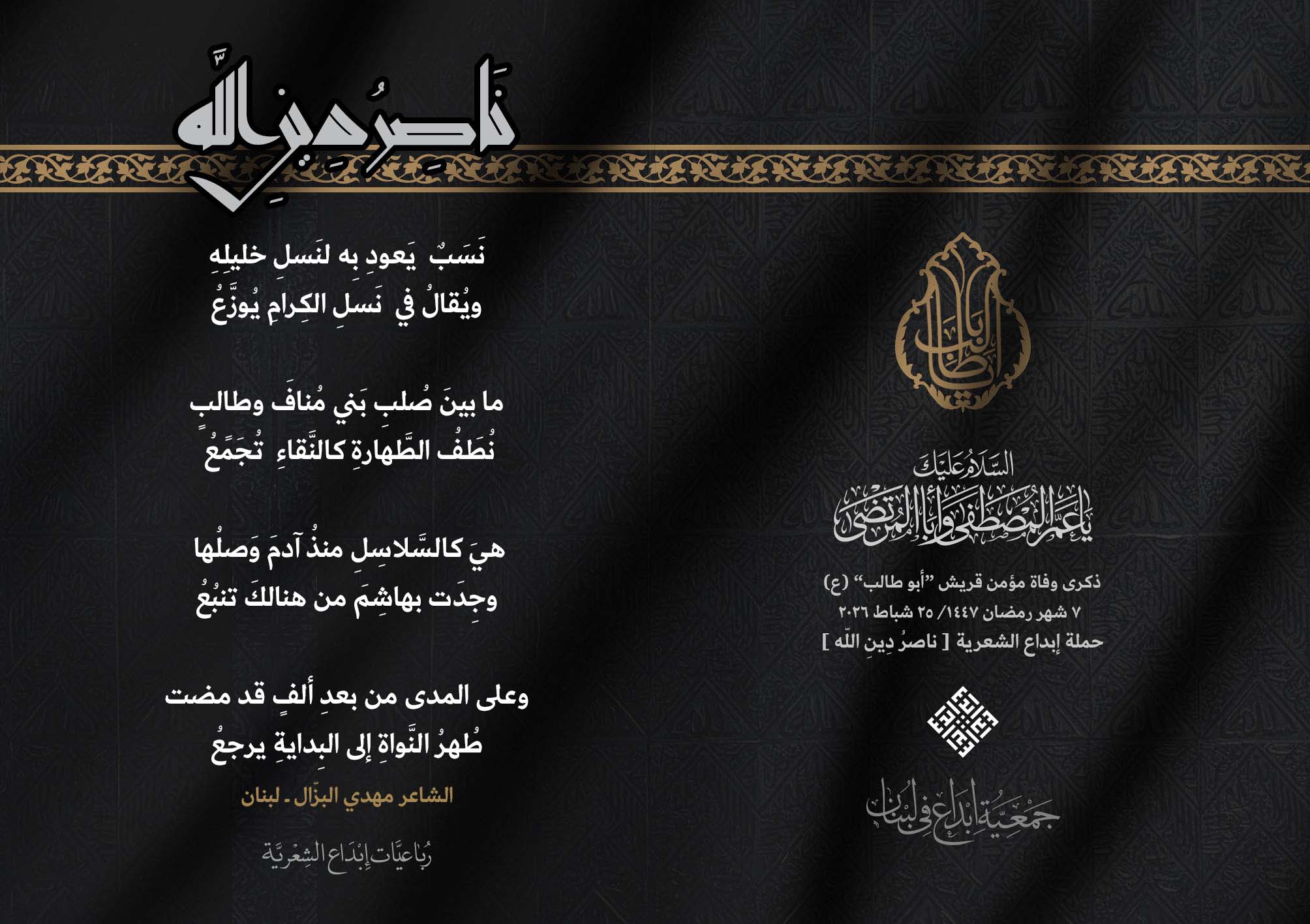 #ناصر_دين_الله أطلقت جمعية #إبداع في لبنان رباعيات #ناصر_دين_الله الشعرية لمناسبة ذكرى وفاة عم النبي محمد (ص) ووالد الإمام علي (ع)، الصحابي الهاشمي كفيل الرسالة وحاميها أبي طالب بن عبد المطلب (عليهما السلام) .. وقد شارك الرباعيات كل من : 1. الشاعر السيد الحتاني ـ لبنان 2. الشاعر الشيخ حسين فقيه ـ لبنان 3. الشاعر أحمد علي أحمد ـ لبنان 4. الشاعر جواد حايك ـ لبنان 5. الشاعر داوود ال عبد الرسول السماوي ـ العراق 6. الشاعر ضياء عاشور ـ العراق 7. الشاعر محمود شور ـ لبنان 8. الشاعر معن عبد الإله محسن ـ العراق 9. الشاعر مهدي البزّال ـ لبنان 10. الشاعرة زينب الموسوي ـ لبنان 11. الشاعرة سارة اليتامى ـ لبنان 12. الشاعرة عزيزة جميل ـ لبنان 13. الشاعرة فاطمة العوطة ـ لبنان 14. الشاعرة فاطمة نظير آل هاني ـ القطيف 15. الشاعرة ميسم مغنية ـ لبنان 16. الشاعرة ناديا الحقاني ـ لبنان 17. الشاعرة نبال رعد ـ لبنان .... #إبداع 25_2_2026 #ناصر_دين_الله #وفاة_أبي_طالب #رباعيات_شعرية