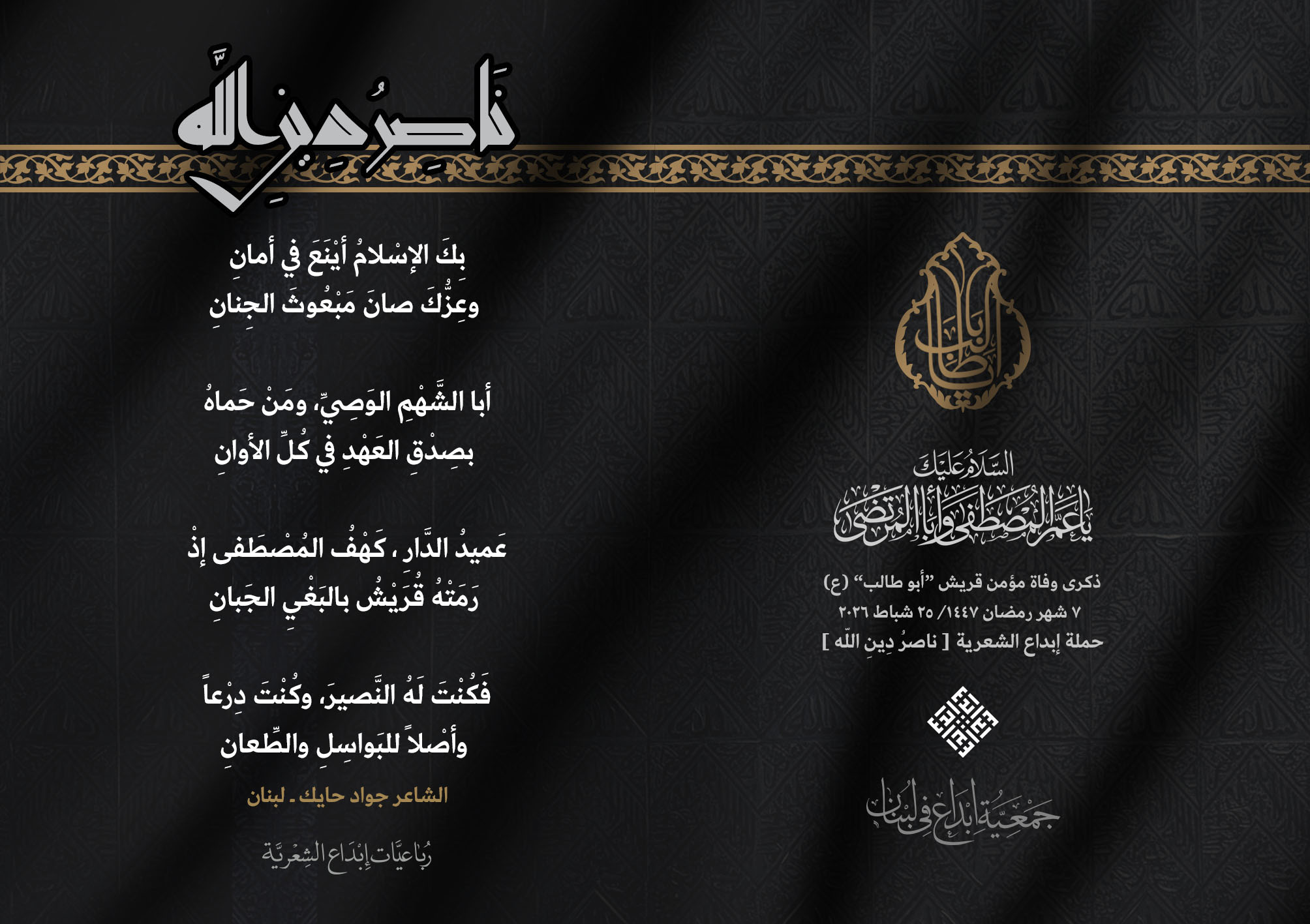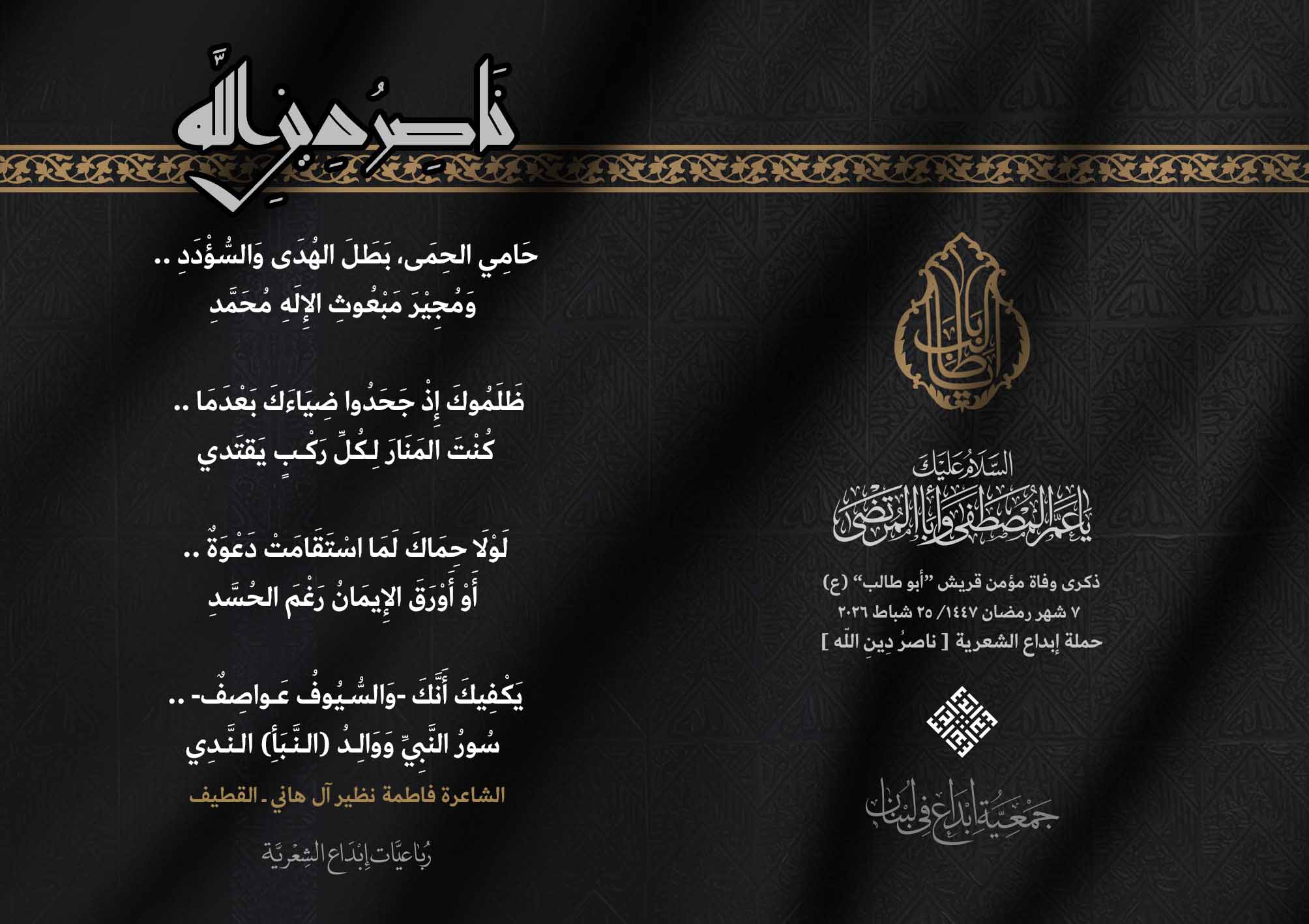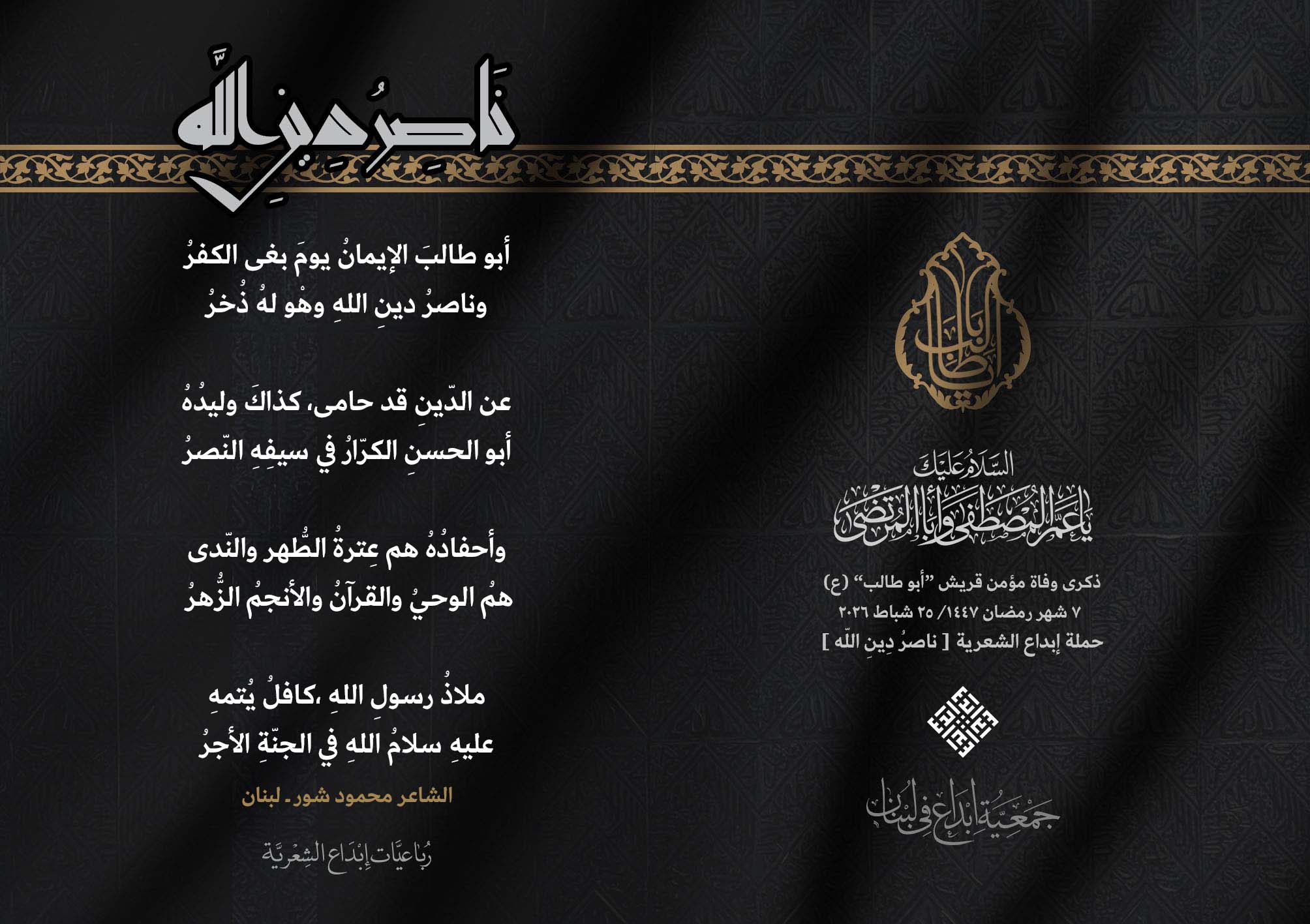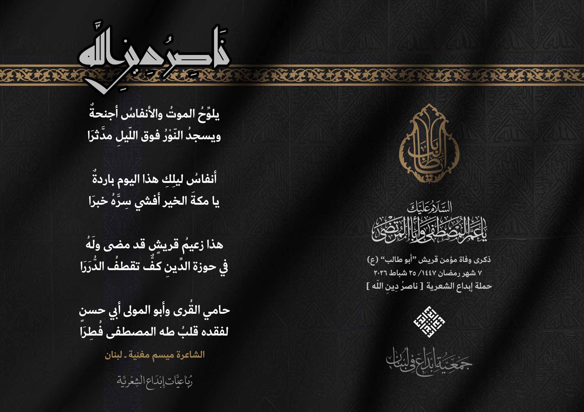 #ناصر_دين_الله أطلقت جمعية #إبداع في لبنان رباعيات #ناصر_دين_الله الشعرية لمناسبة ذكرى وفاة عم النبي محمد (ص) ووالد الإمام علي (ع)، الصحابي الهاشمي كفيل الرسالة وحاميها أبي طالب بن عبد المطلب (عليهما السلام) .. وقد شارك الرباعيات كل من : 1. الشاعر السيد الحتاني ـ لبنان 2. الشاعر الشيخ حسين فقيه ـ لبنان 3. الشاعر أحمد علي أحمد ـ لبنان 4. الشاعر جواد حايك ـ لبنان 5. الشاعر داوود ال عبد الرسول السماوي ـ العراق 6. الشاعر ضياء عاشور ـ العراق 7. الشاعر محمود شور ـ لبنان 8. الشاعر معن عبد الإله محسن ـ العراق 9. الشاعر مهدي البزّال ـ لبنان 10. الشاعرة زينب الموسوي ـ لبنان 11. الشاعرة سارة اليتامى ـ لبنان 12. الشاعرة عزيزة جميل ـ لبنان 13. الشاعرة فاطمة العوطة ـ لبنان 14. الشاعرة فاطمة نظير آل هاني ـ القطيف 15. الشاعرة ميسم مغنية ـ لبنان 16. الشاعرة ناديا الحقاني ـ لبنان 17. الشاعرة نبال رعد ـ لبنان .... #إبداع 25_2_2026 #ناصر_دين_الله #وفاة_أبي_طالب #رباعيات_شعرية