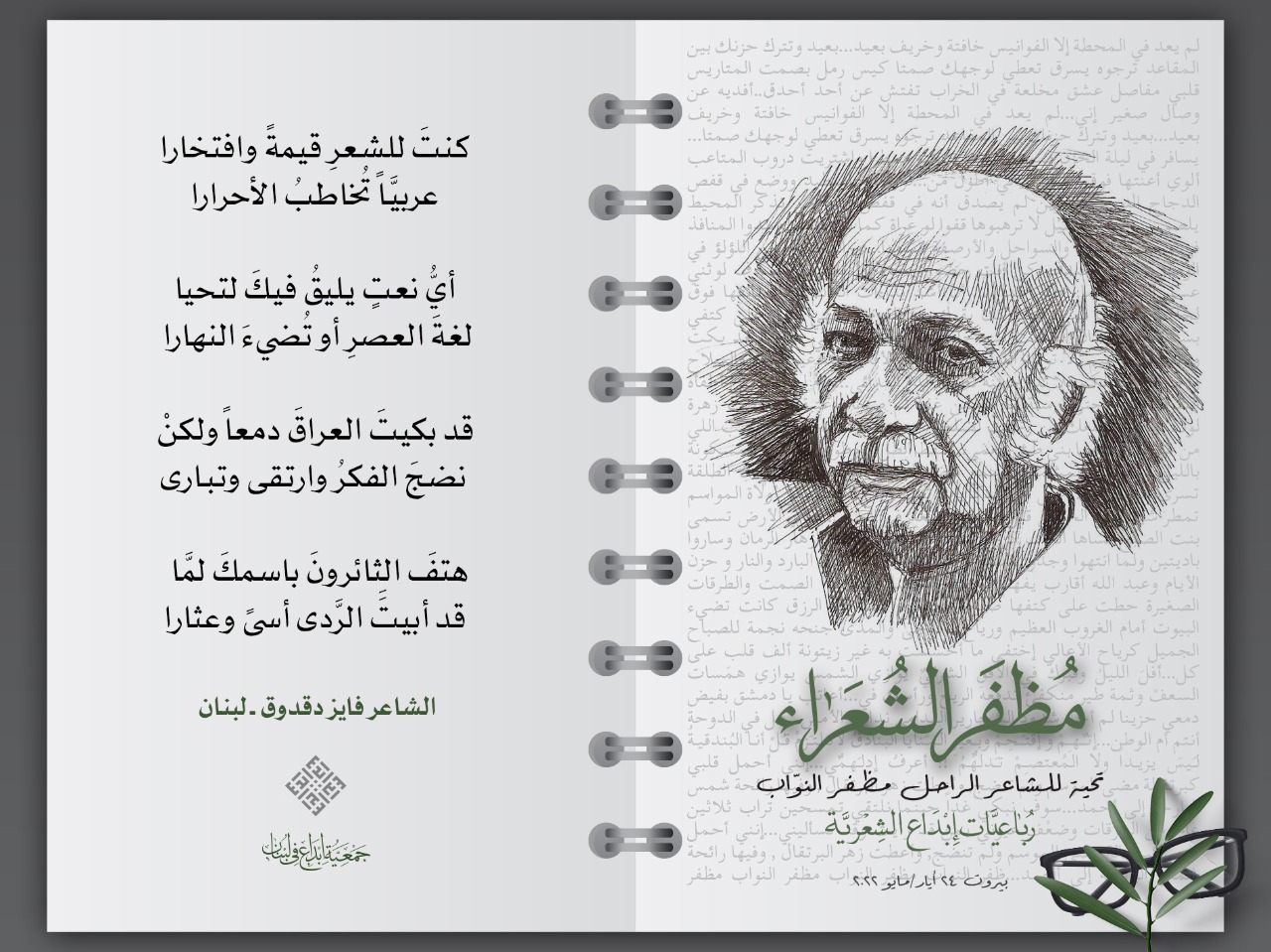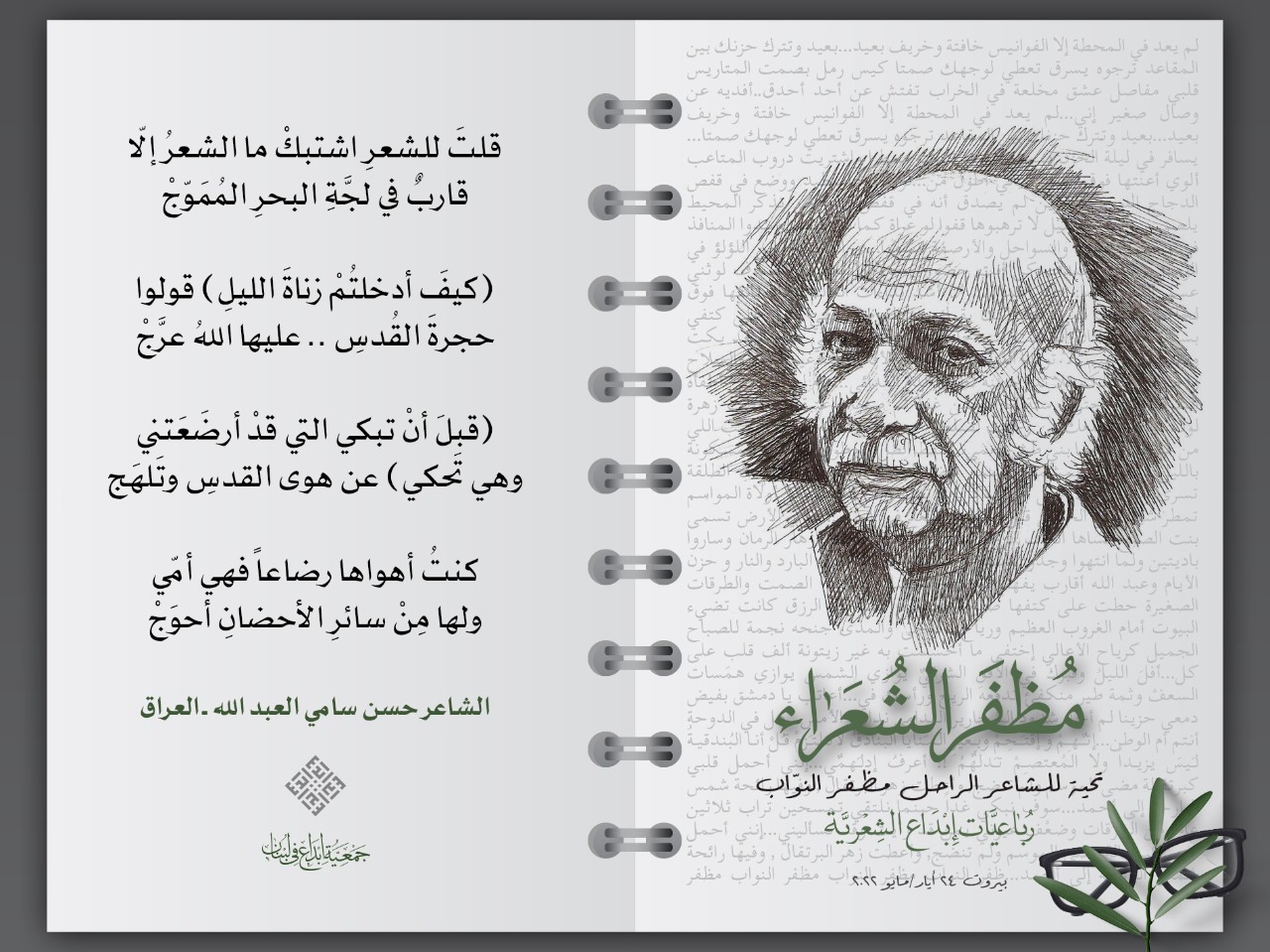 رباعيات "مظفر الشعرية" تحية للراحل الشاعر مظفرالنوّاب مع رحيل الشاعر الثوري الكبير مظفر النوّاب اطلق شعراء ابداع رباعيات شعرية بعنوان #مظفر_الشعراء هي جمعية ابداع في لبنان نقف الى عتبة الشعر الثوري المقاوم للظلم والعدوان ووفاء منها للمواقف الشعرية الثورية التي حفلت بها سني الراحل الشاعر الكبير مظفر النواب كانت رباعيات #مظفر_الشعراء . وقد شارك في الحملة الشعرية : 1. الشاعر حسن سامي العبد الله ـ العراق 2. الشاعر حسين وهبي ـ لبنان 3. الشاعر داوود ال عبد الرسول السماوي ـ العراق 4. الشاعر فايز دقدوق ـ لبنان 5. الشاعر فضل سرور ـ لبنان 6. الشاعر محمد برو ـ لبنان 7. الشاعر محمد علي محمد مهدي السماوي ـ العراق 8. الشاعر محمود شور ـ لبنان 9. الشاعر معن عبدالإله محسن ـ العراق 10. الشاعرة أمل سرور ـ لبنان 11. الشاعرة حوراء خليفة ـ لبنان 12. الشاعرة زينب فياض ـ لبنان 13. الشاعرة سارة اليتامى ـ لبنان 14. الشاعرة سكينة سويدان ـ لبنان 15. الشاعرة مريم عصمان ـ لبنان 16. الشاعرة ناديا الحقاني ـ لبنان 17. الشاعرة نغـم جمّول ـ لبنان #ابداع 22_5_2022 #مظفر_الشعراء رباعيات_شعرية