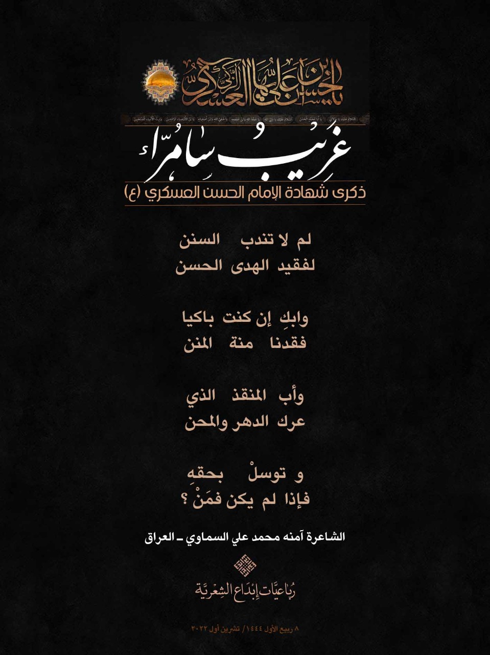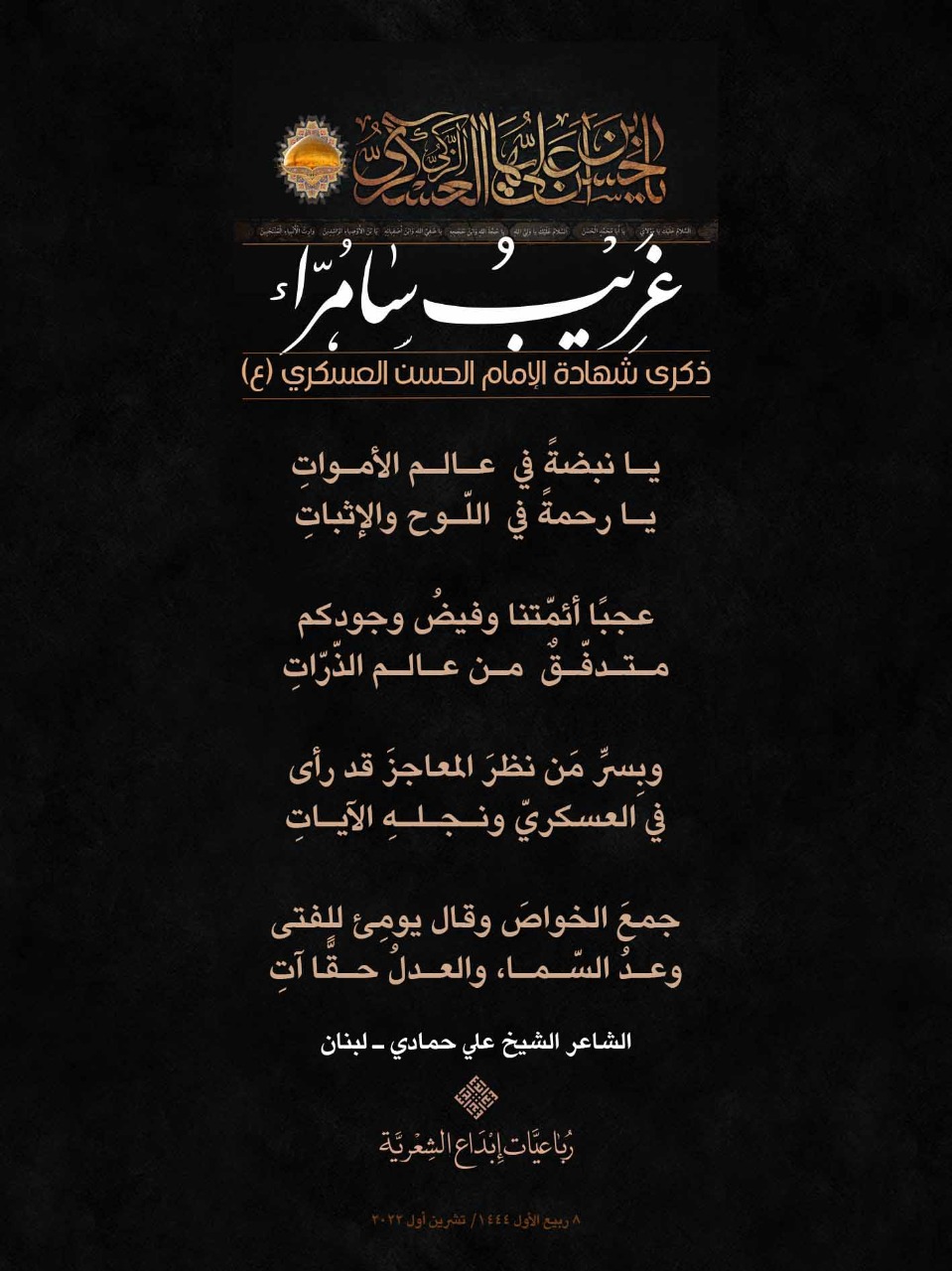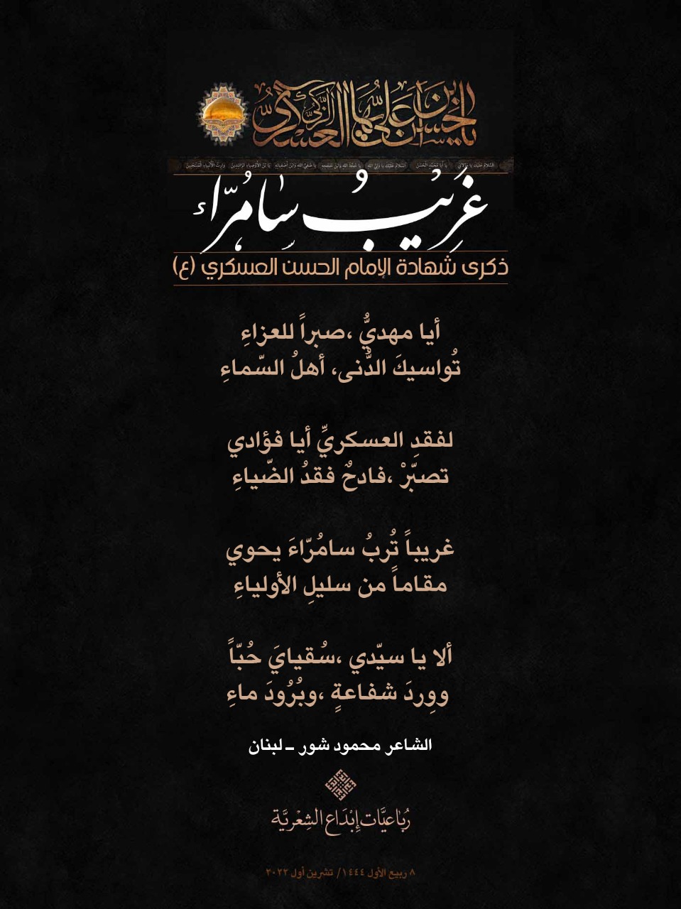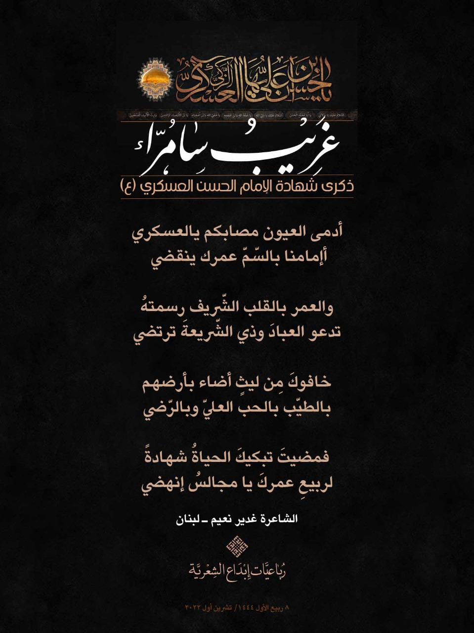رباعيات #غريب_سامراء الشعرية باستشهاد الامام العسكري (ع) لمناسبة ذكرى استشهاد الإمام الحسن بن علي العسكري (ع) أطلقت جمعية إبداع في لبنان حملة شعرية بعنوان *رباعيات #غريب_سامراء الشعرية #ابداع 4-10-2022 #استشهاد_العسكري #رباعيات_شعرية