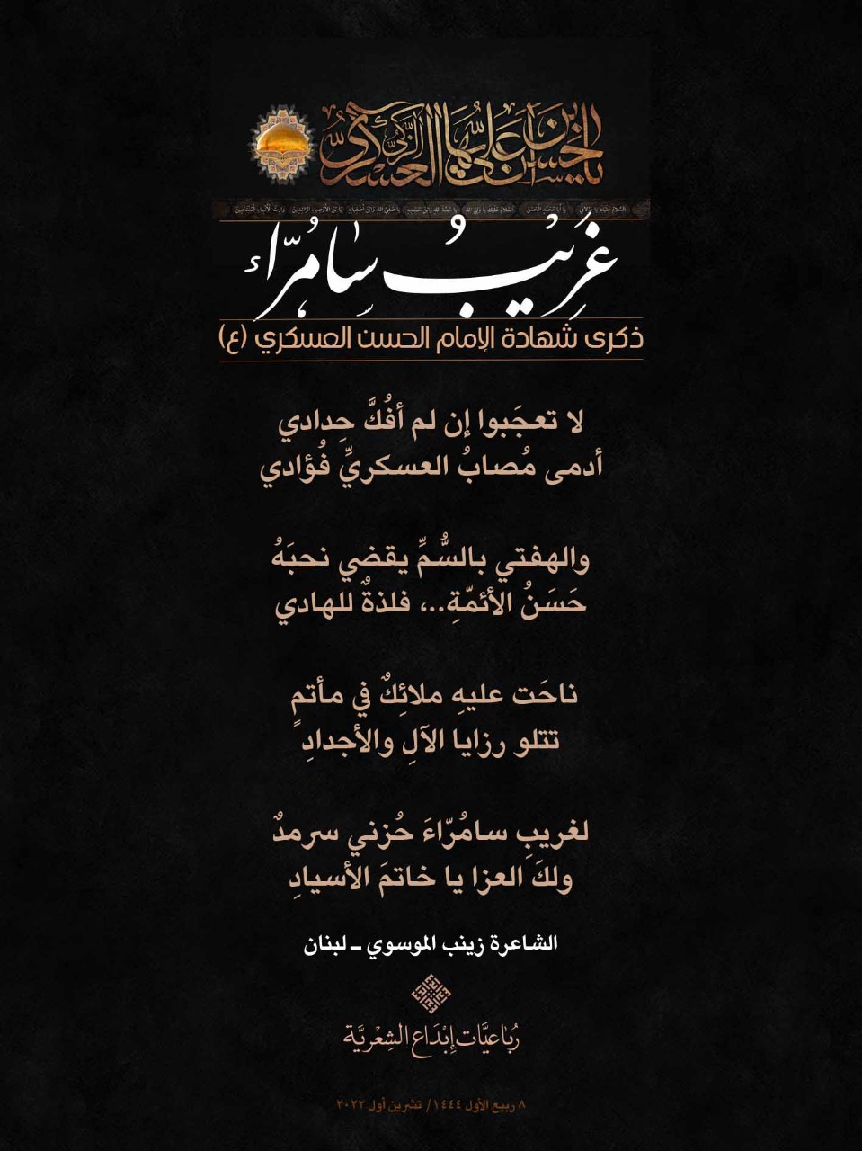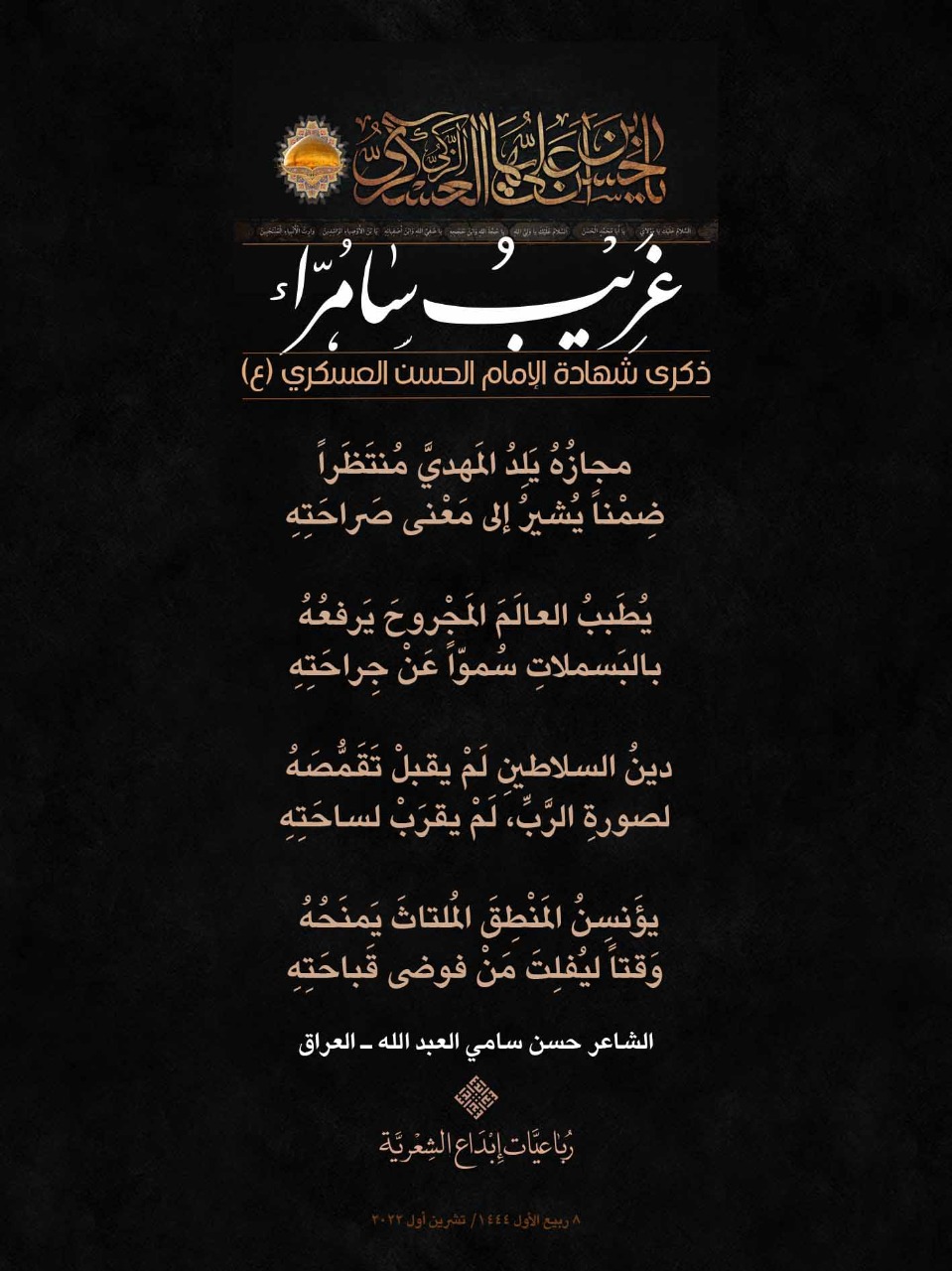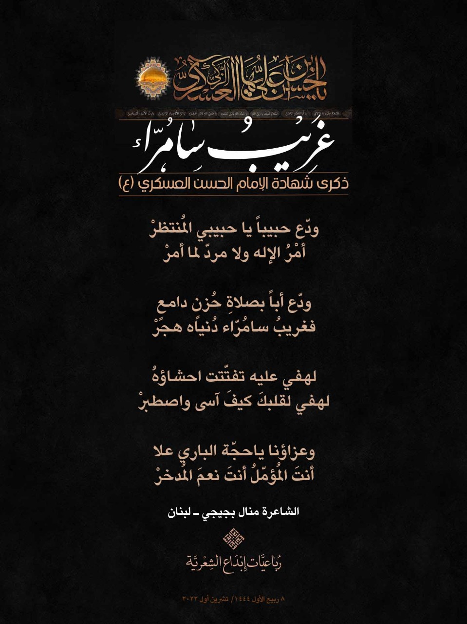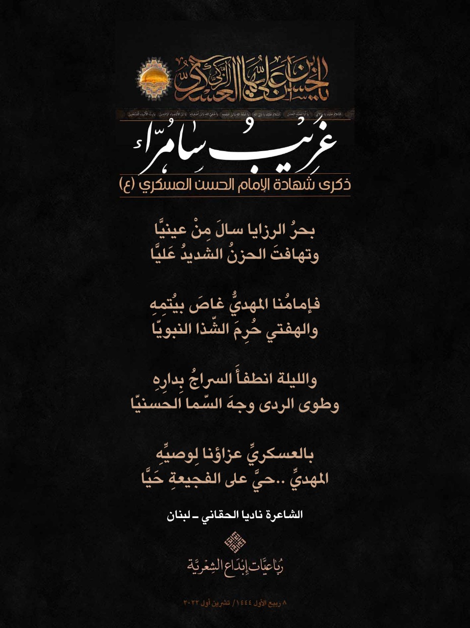رباعيات #غريب_سامراء الشعرية باستشهاد الامام العسكري (ع) لمناسبة ذكرى استشهاد الإمام الحسن بن علي العسكري (ع) أطلقت جمعية إبداع في لبنان حملة شعرية بعنوان *رباعيات #غريب_سامراء الشعرية #ابداع 4-10-2022 #استشهاد_العسكري #رباعيات_شعرية
