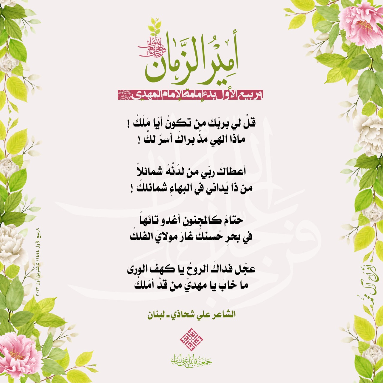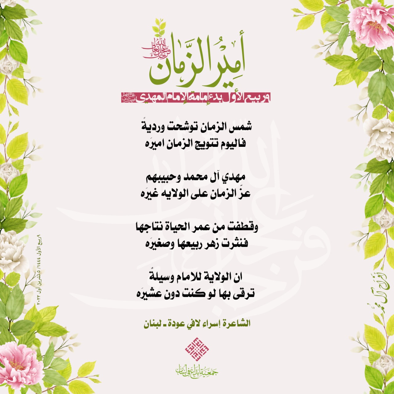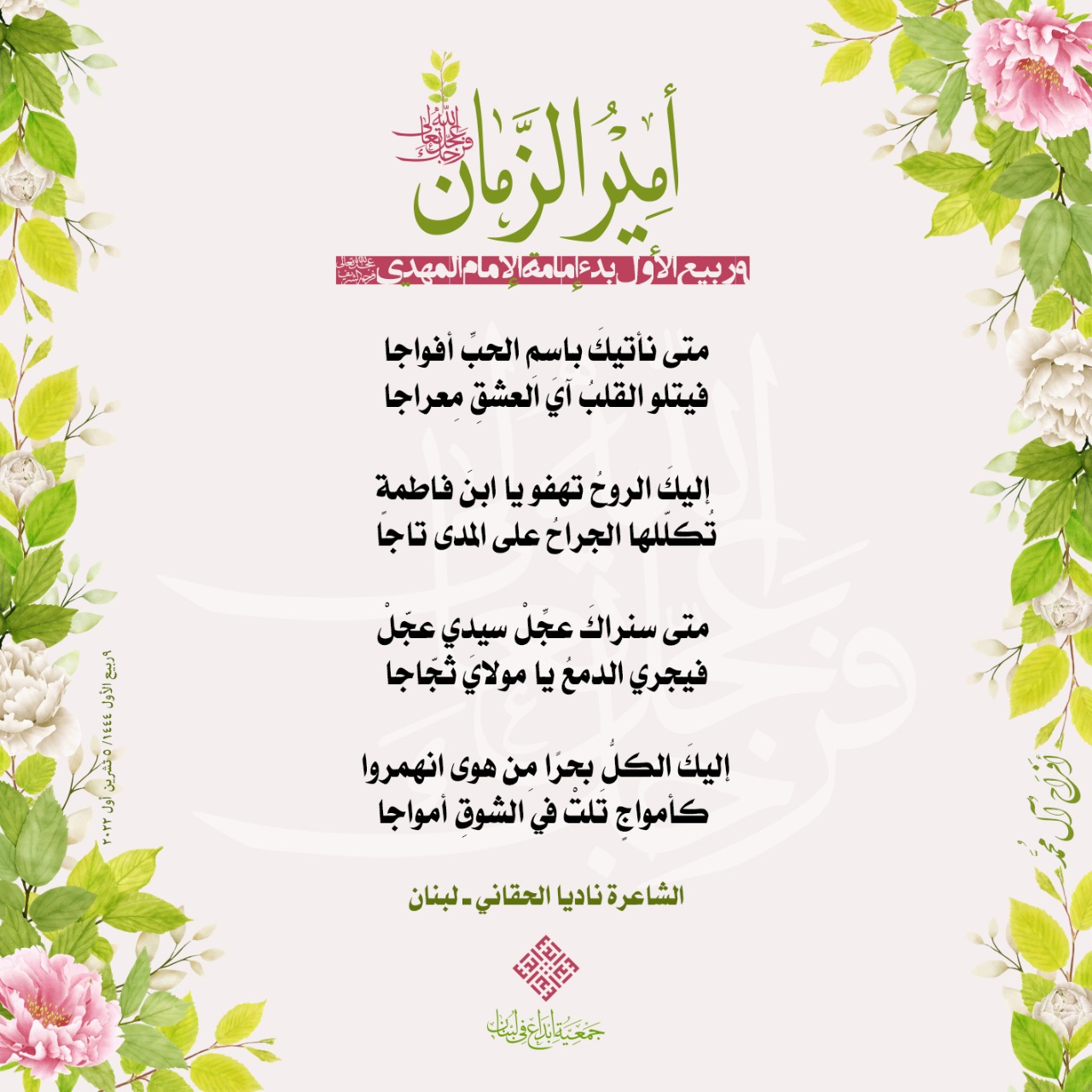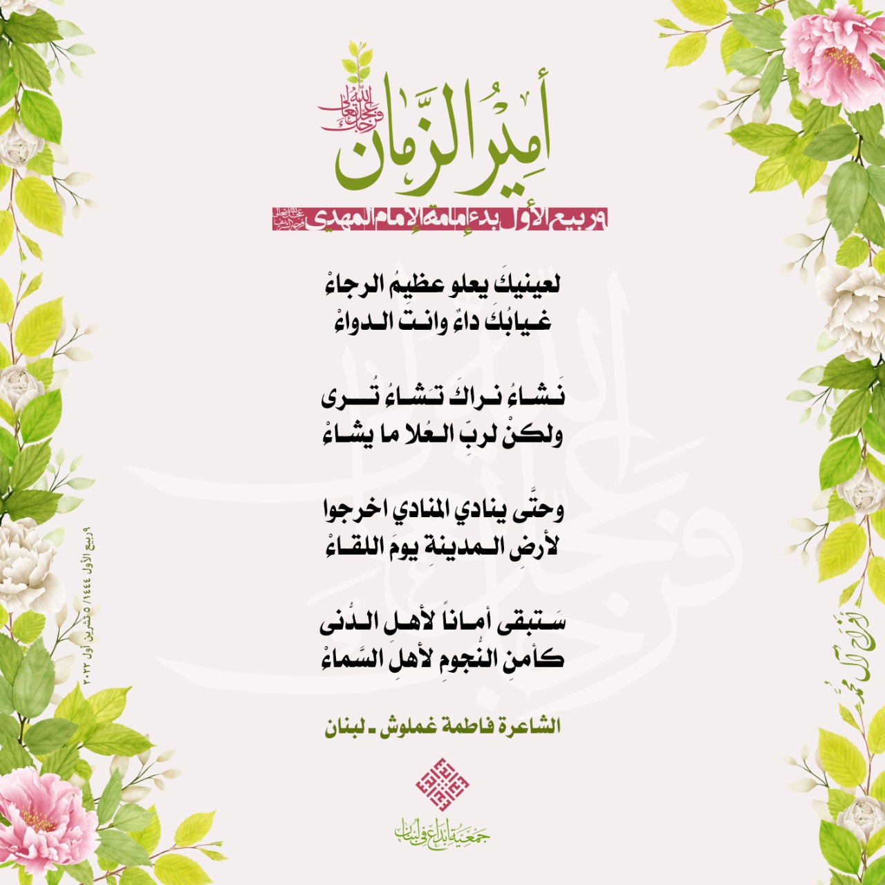 رباعيات #أمير_الزمان الشعرية بمناسبة تولي الإمام الحجة المهدي (عج) مقاليد الإمامة أطلقت جمعية إبداع في لبنان حملة شعرية بعنوان رباعيات #أمير_الزمان الشعرية #ابداع 5-10-2022 #إمامة_الحجة #رباعيات_شعرية