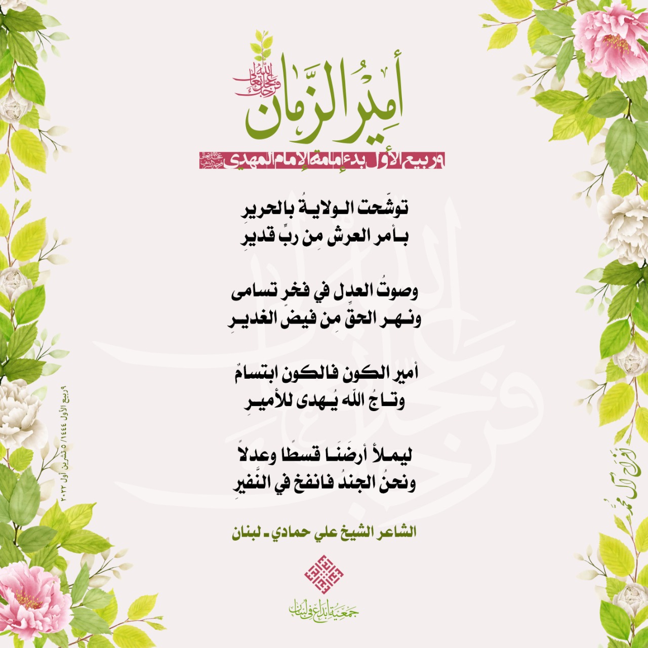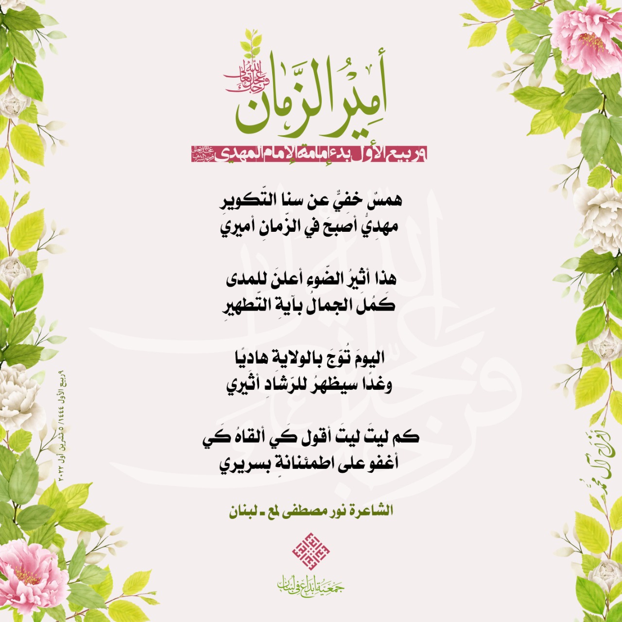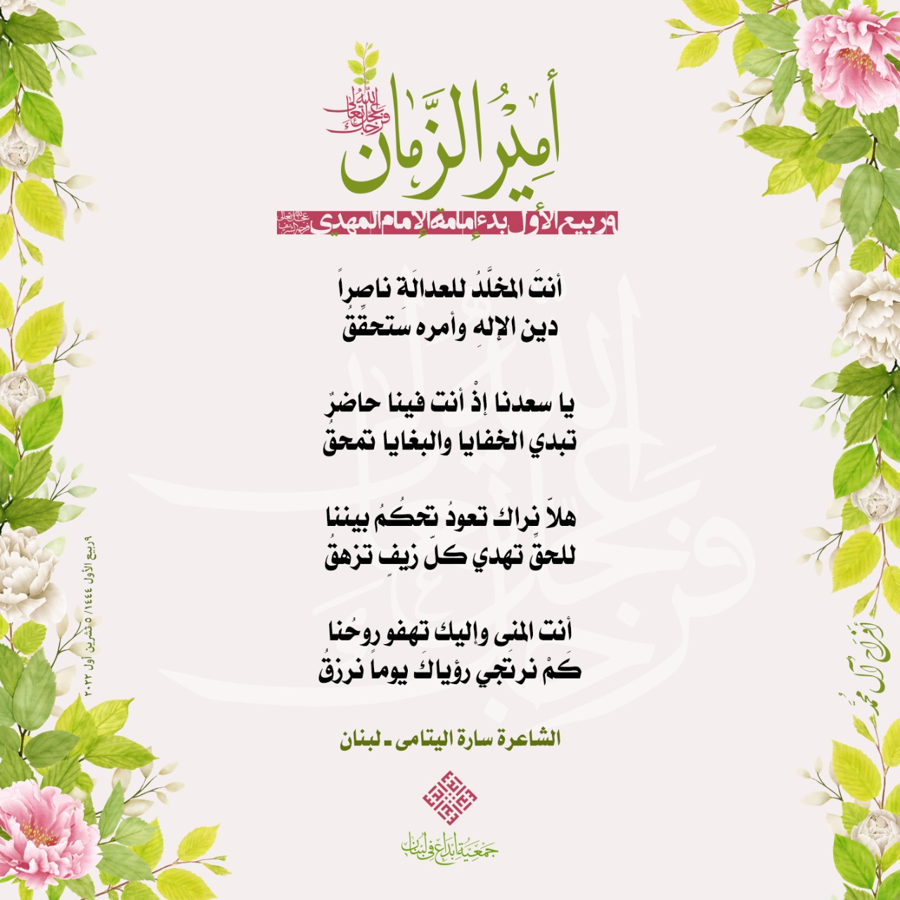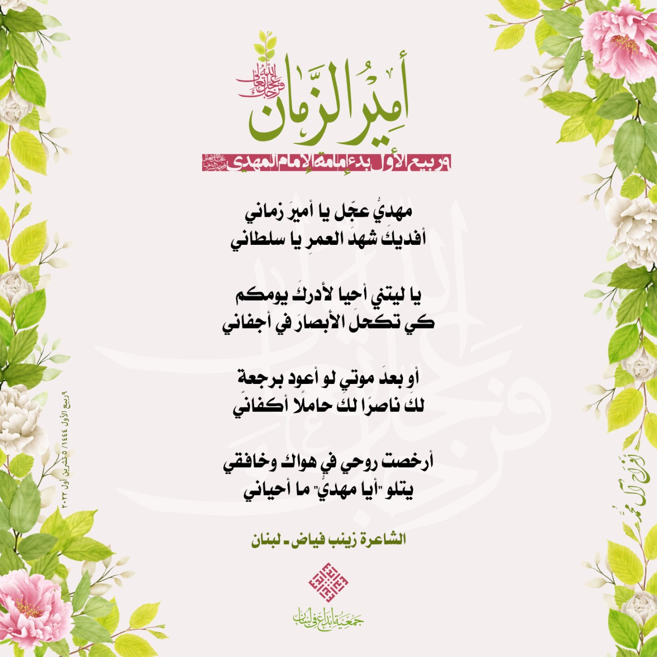 رباعيات #أمير_الزمان الشعرية بمناسبة تولي الإمام الحجة المهدي (عج) مقاليد الإمامة أطلقت جمعية إبداع في لبنان حملة شعرية بعنوان رباعيات #أمير_الزمان الشعرية #ابداع 5-10-2022 #إمامة_الحجة #رباعيات_شعرية