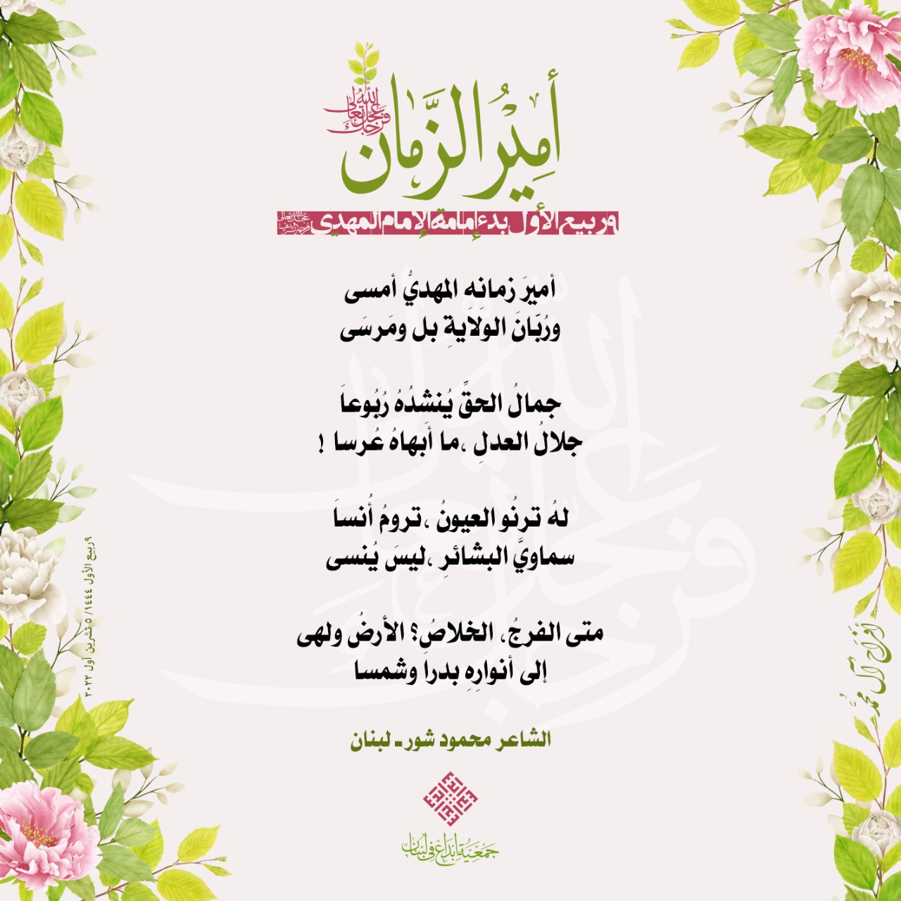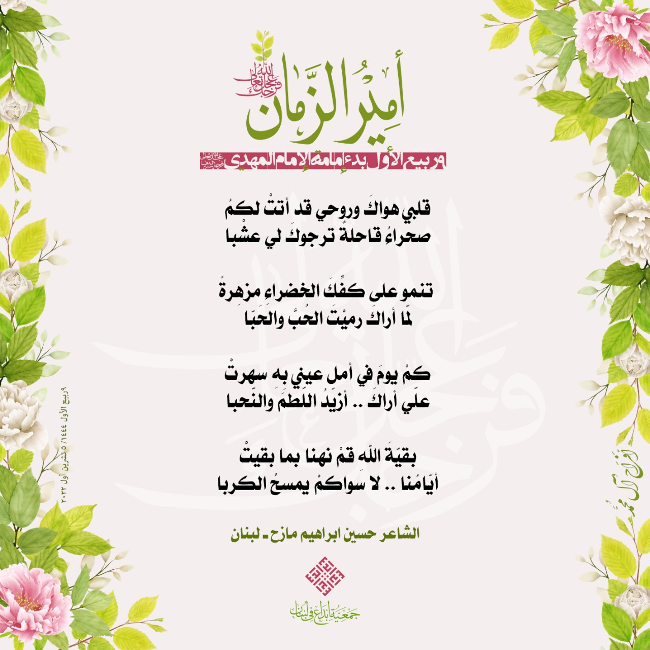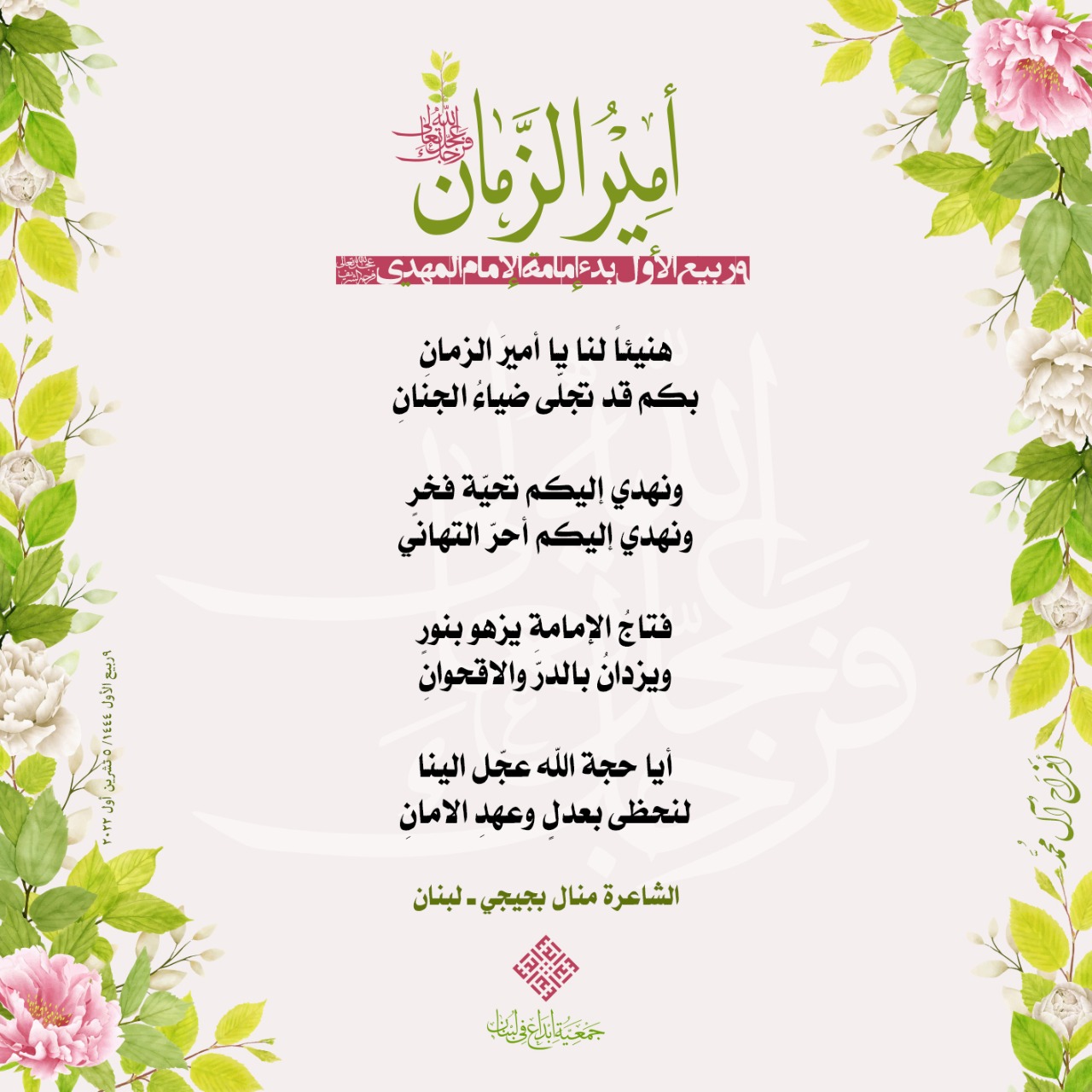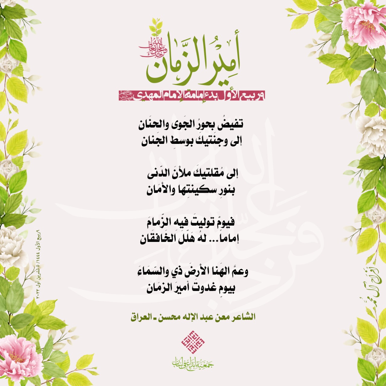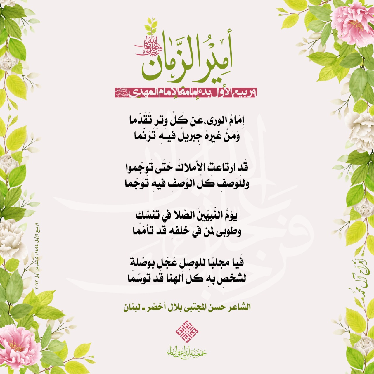 رباعيات #أمير_الزمان الشعرية بمناسبة تولي الإمام الحجة المهدي (عج) مقاليد الإمامة أطلقت جمعية إبداع في لبنان حملة شعرية بعنوان رباعيات #أمير_الزمان الشعرية #ابداع 5-10-2022 #إمامة_الحجة #رباعيات_شعرية